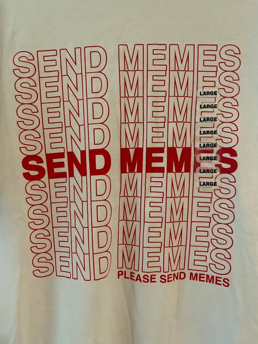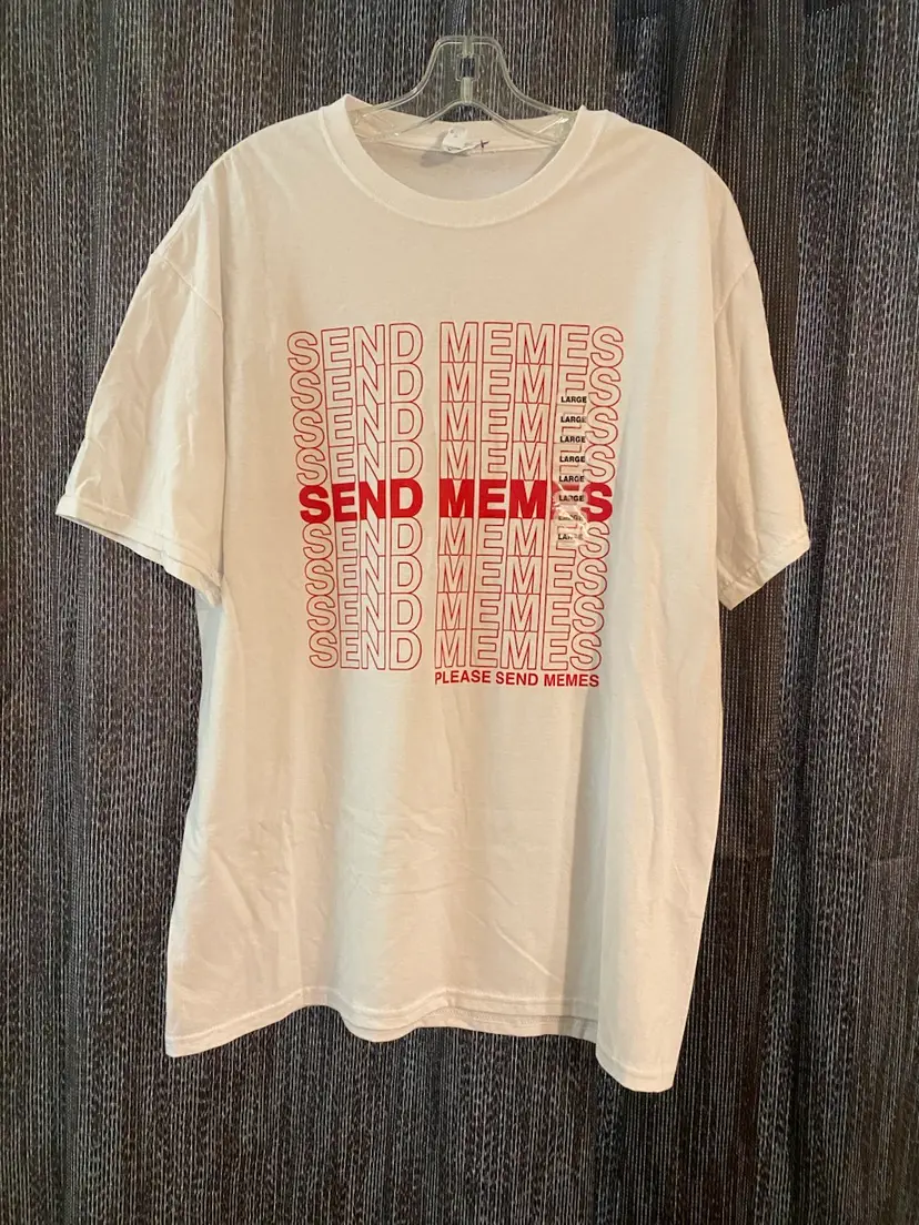 You are purchasing one Size Large White & Red 'Send Memes' Short Sleeve T-Shirt by Fruit of the Loom and their Heavy-Duty Cotton line. This Shirt is new and unworn, just see final image to show tag is cut in half and there is marker on the interior back collar (not visible from the rear exterior).