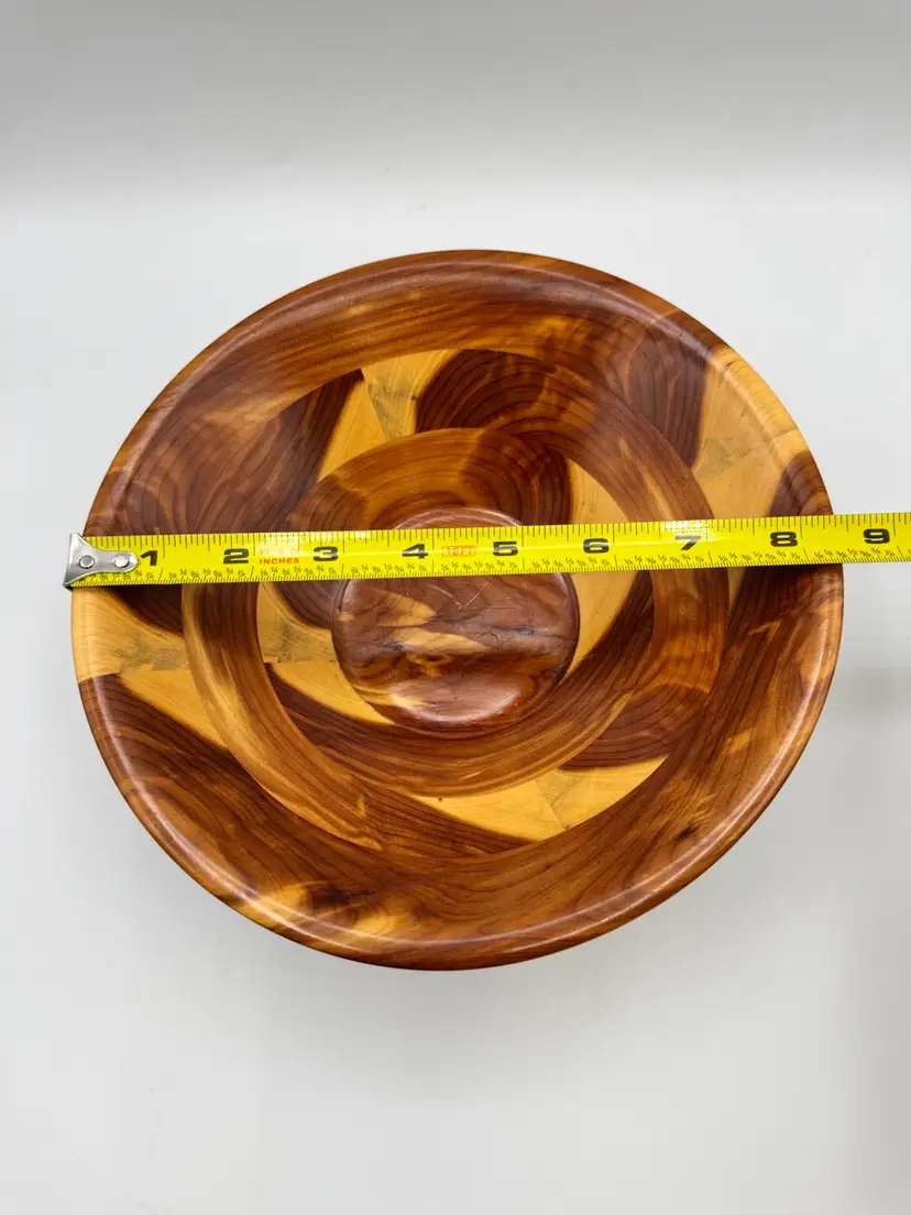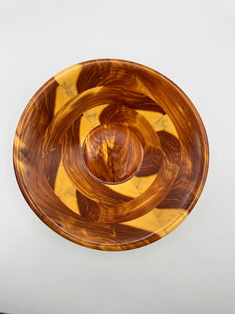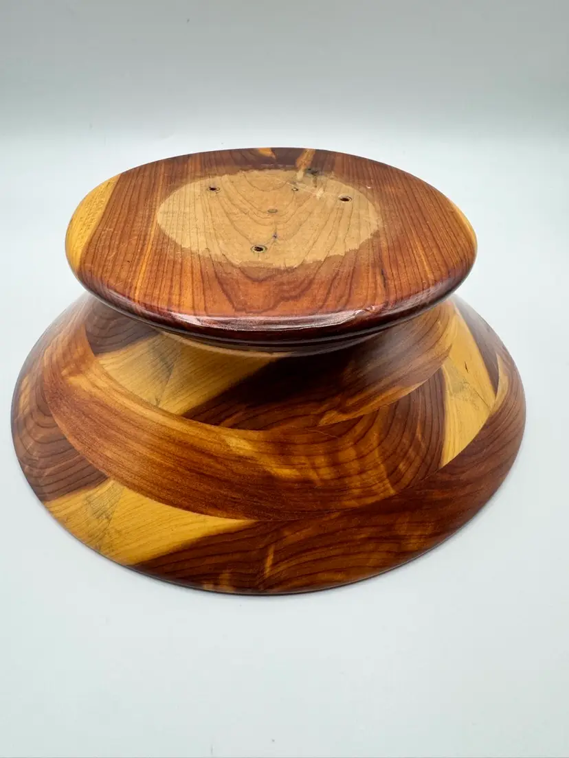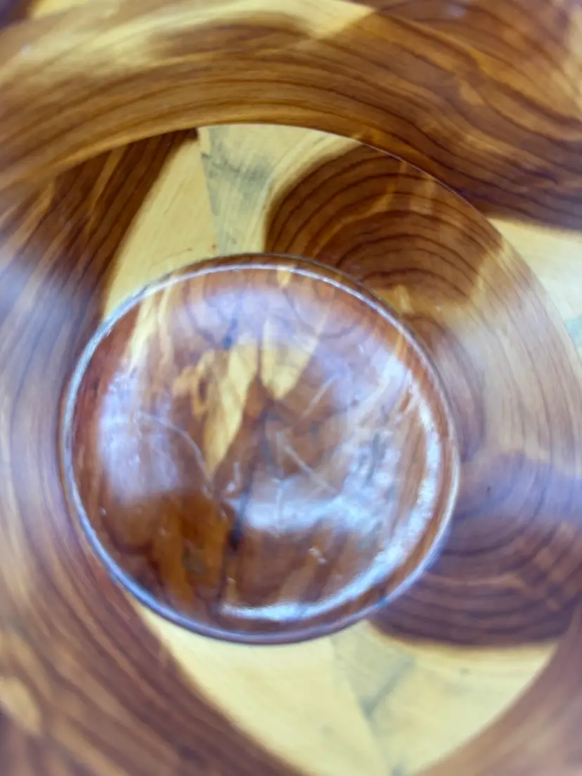 Lathe-turned construction using contrasting light and dark woods in a geometric swirl pattern.