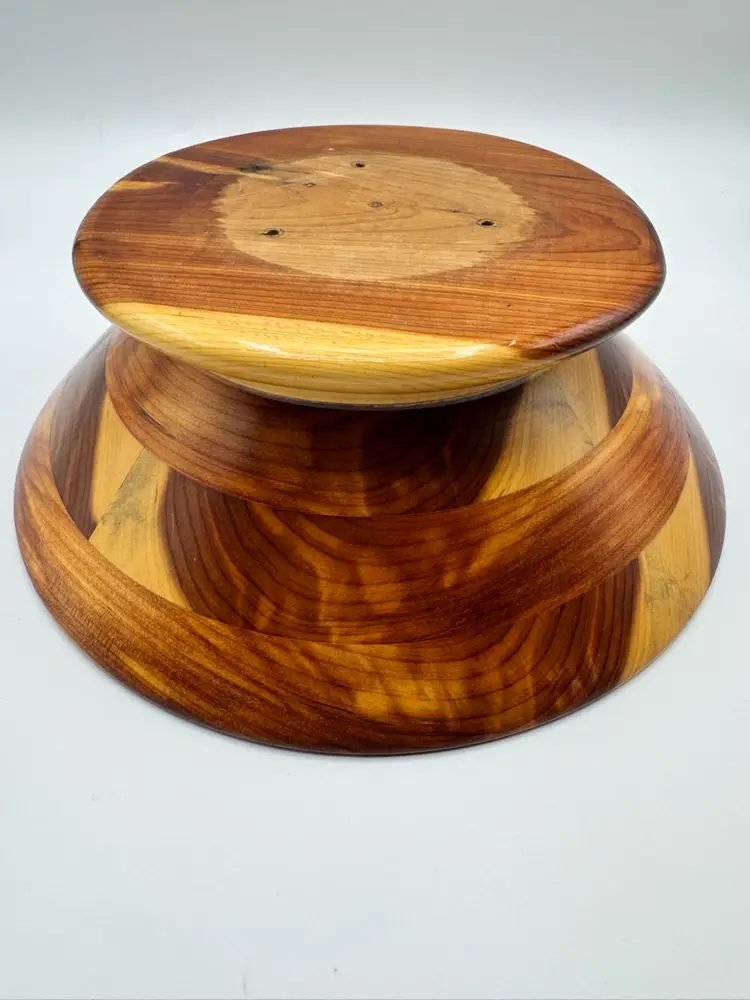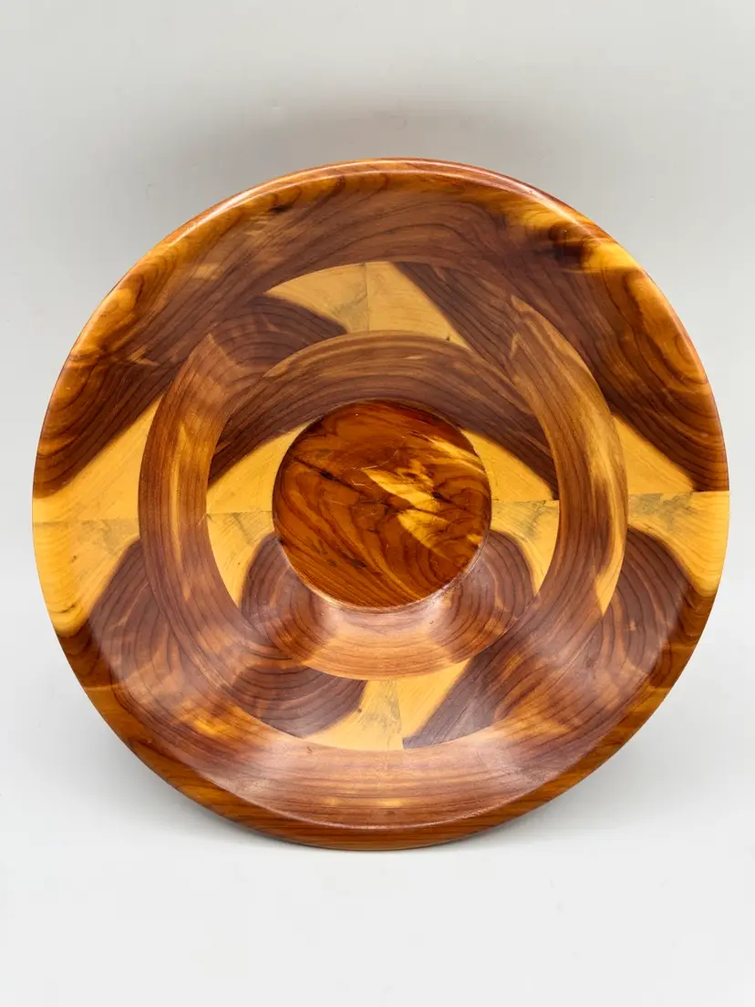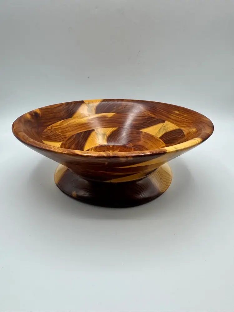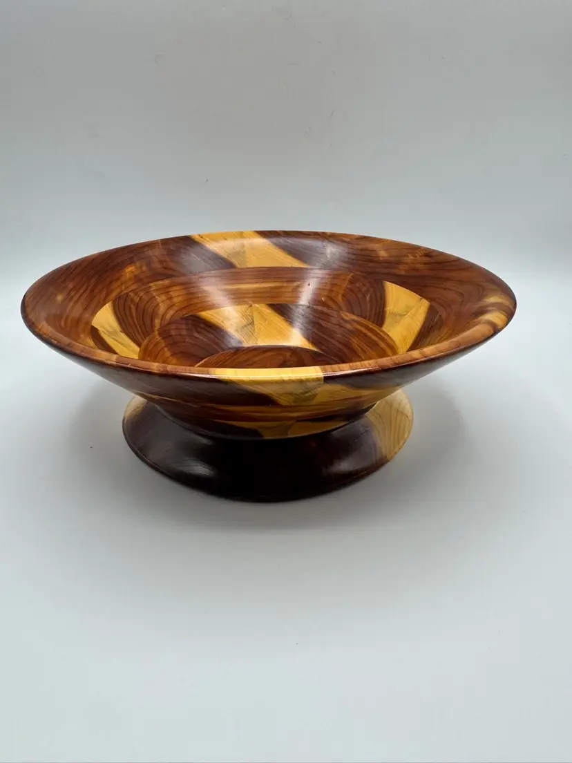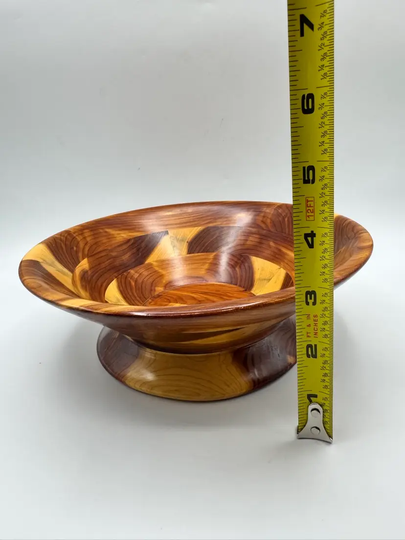 Artisan handmade segmented wood bowl with a footed pedestal base and flared rim.