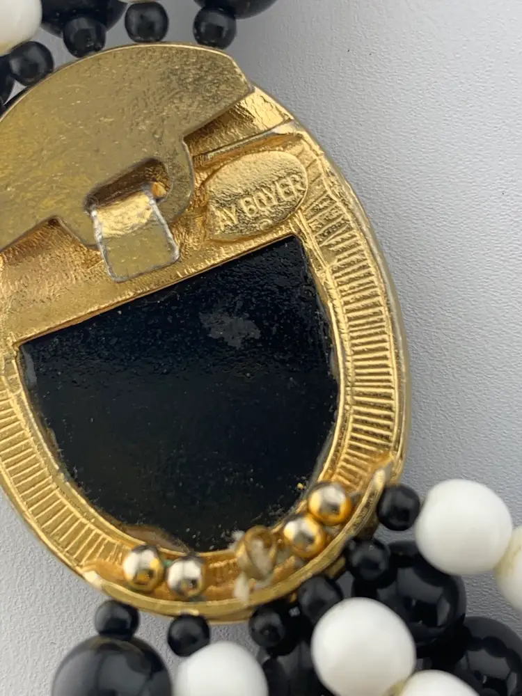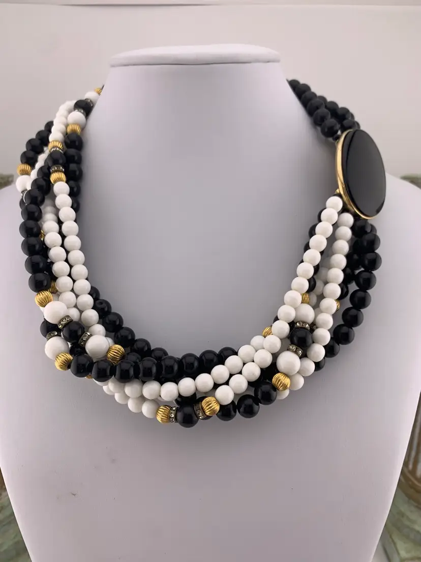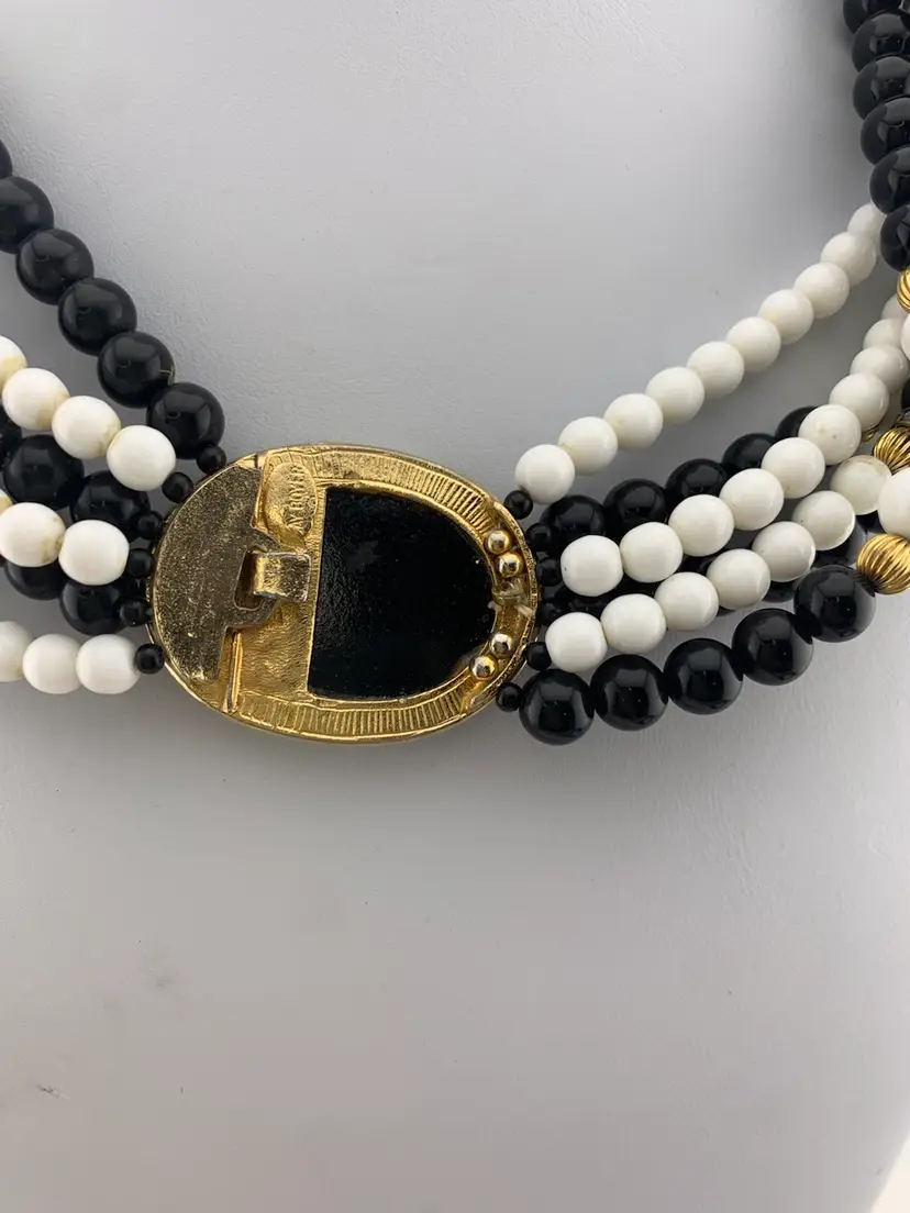 This classic necklace is from Gay Boyer. It features six strands of glass beads in black and white with some gold tone as well as rhinestone spacers. The clasp is unique and can be worn where it shows if desired. Measures 19 1/4” long clasped. Could use a clean but is in wonderful condition.