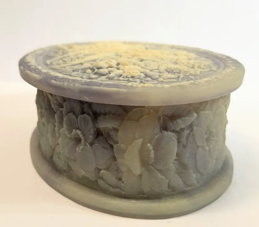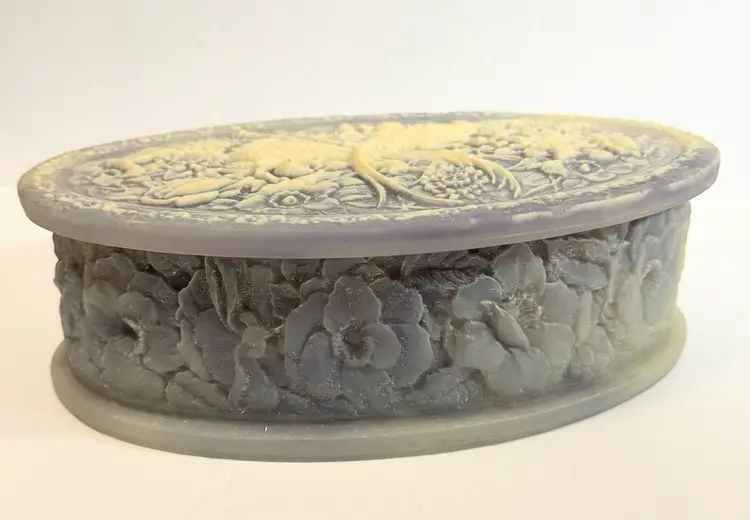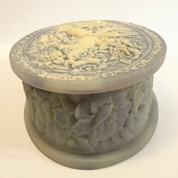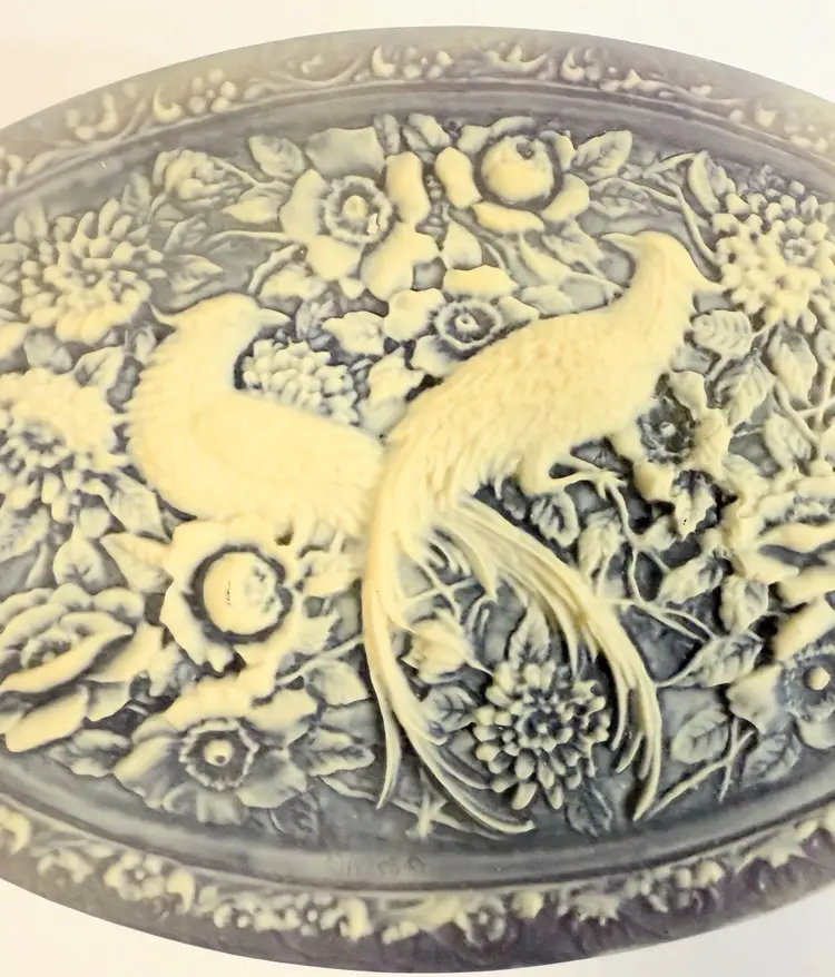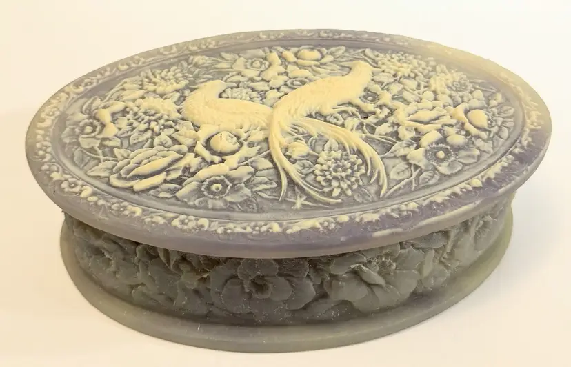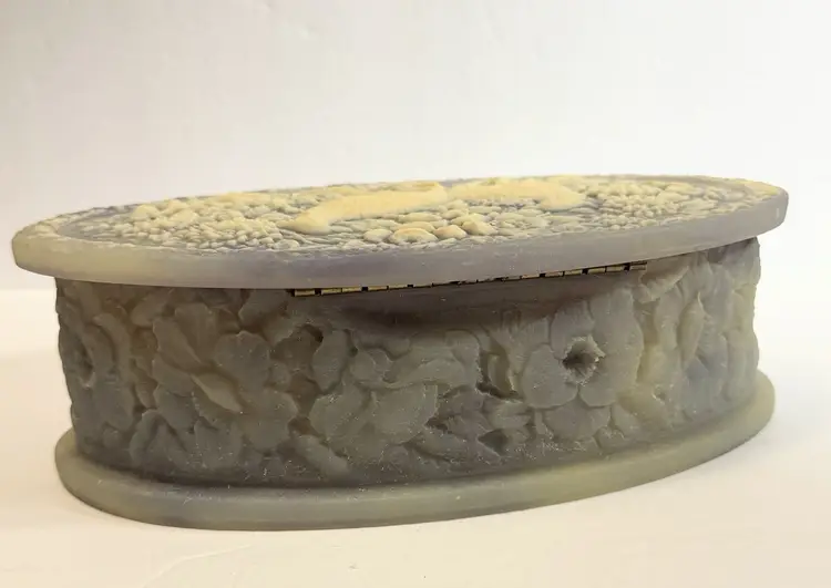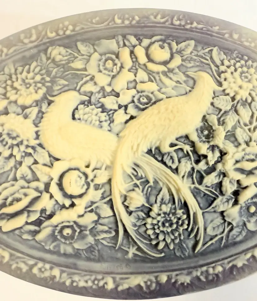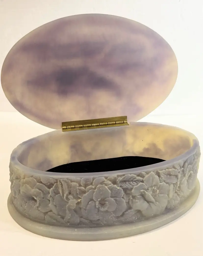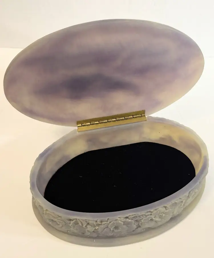This jewelry trinket box features a genuine Incolay stone peacocks purple and white cameo design, housed in an oval-shaped box lined with velvet. The vintage piece, made in the United States by the brand Incolay, is suitable for all jewelry and exudes an Art Deco theme. Measuring 10x7 inches, this jewelry box is a beautiful and practical way to store and display your precious accessories.