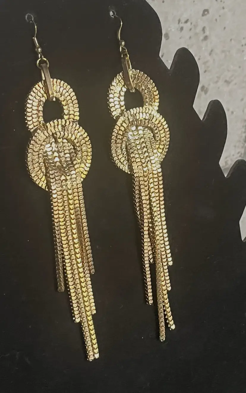 A pair of Long Box Chain Knot earrings. 5 3/4 inches long. Vintage. Art Deco style. 1980's. Pre-owned. Excellent condition.