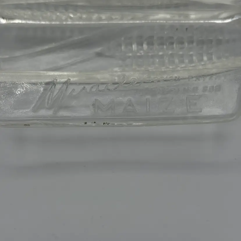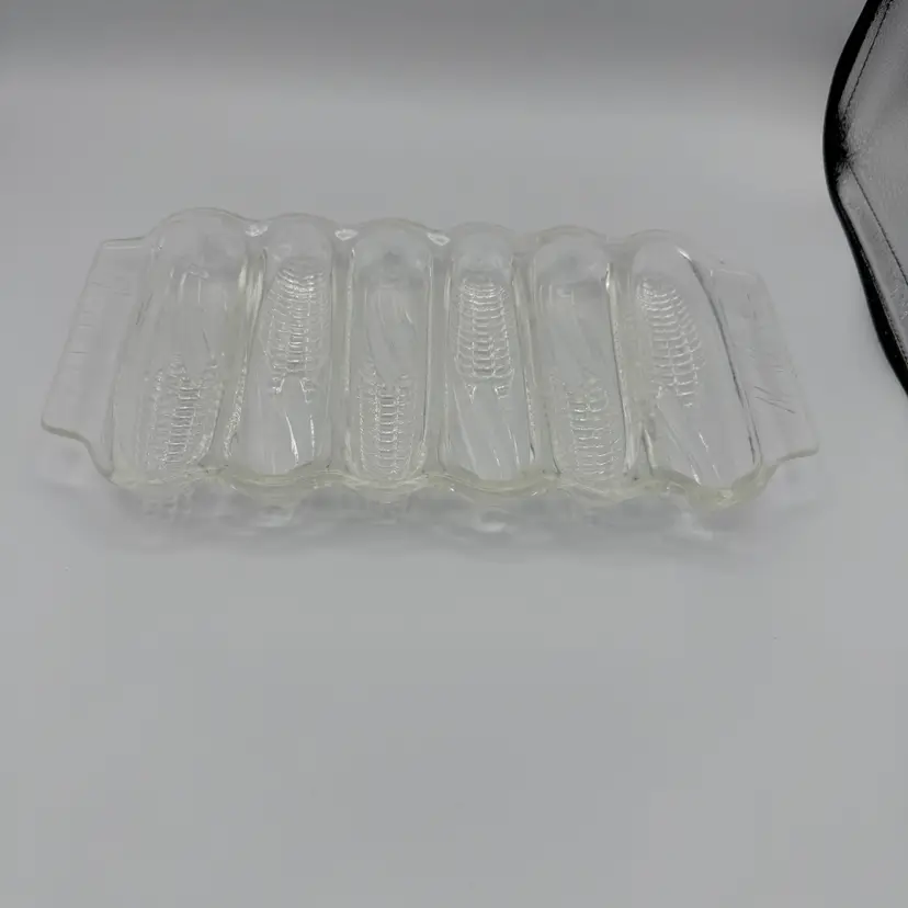 Vintage "Miracle Maize" glass cornbread baking dish. Designed to bake cornbread in the shape of 6 individual ears of corn. 1940's - clear pressed glass. 12" Long X 6.25" W. Oven safe.