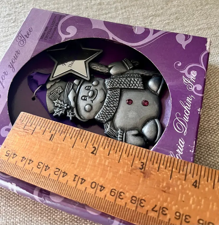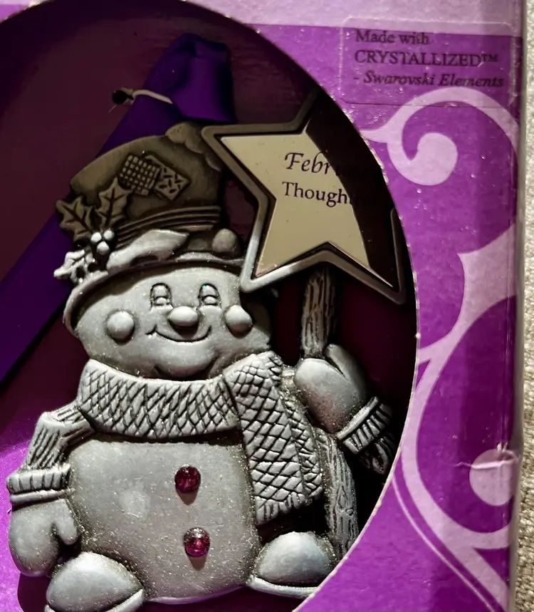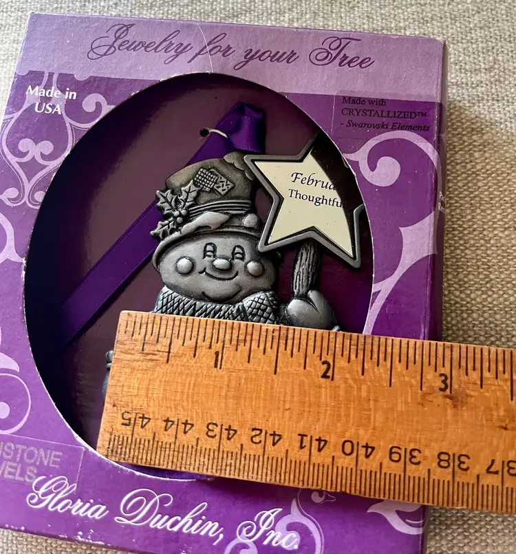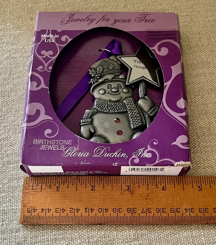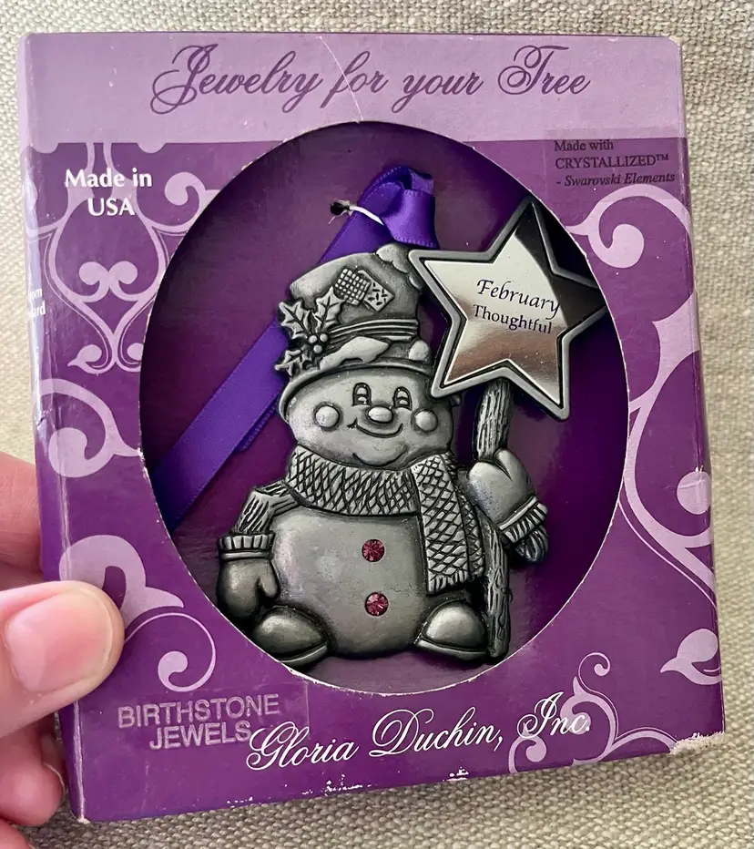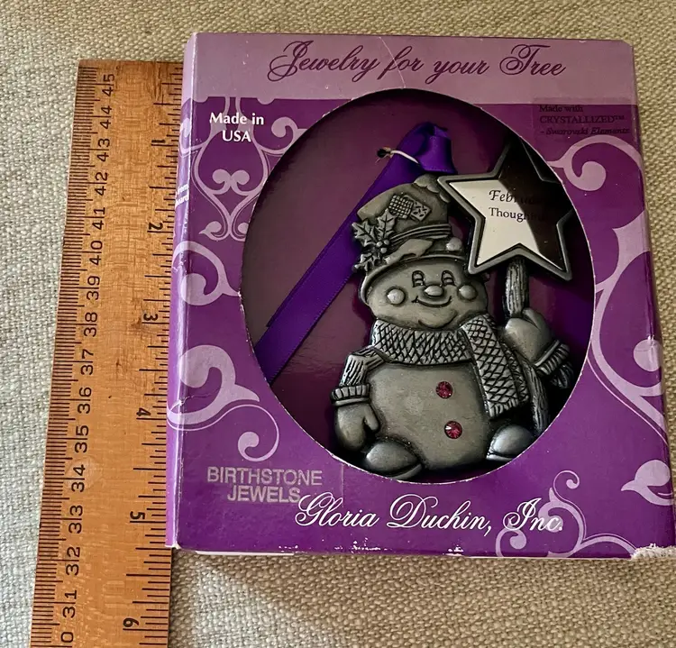 The Gloria Duchin February Birthstone Snowman Ornament with Star Wand is a charming addition to any Christmas tree or February Birthday Gift Topper. This pewter and purple-faux-amethyst-crystal ornament features a snowman shape, perfect for the holiday season. Made in the United States, this collectible item from the Jewelry For Your Tree Birthstone Jewels Ornaments collection by Gloria Duchin includes one ornament and is ideal for celebrating Christmas or to place as a gift-topper with bow and ribbon. A great “tie” for a cloth napkin as part of a table setting special occasion.