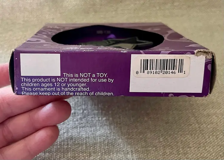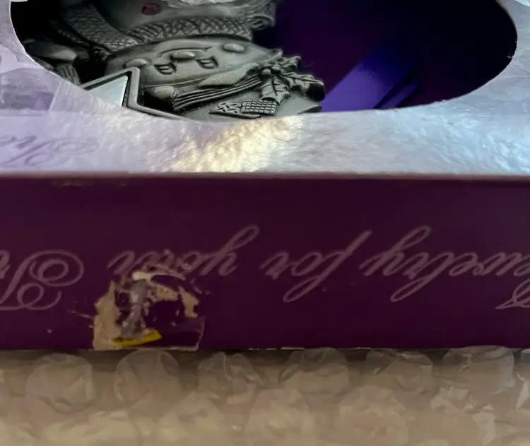 Please look at all the photos prior to deciding to make a purchase. The box shows age and wear with a bit of wrapping paper stuck on it. Buyer, however, is strongly encouraged to review the photos and decide for themselves its condition. Prior to a purchase, questions not answered in photos, details, description are welcome.