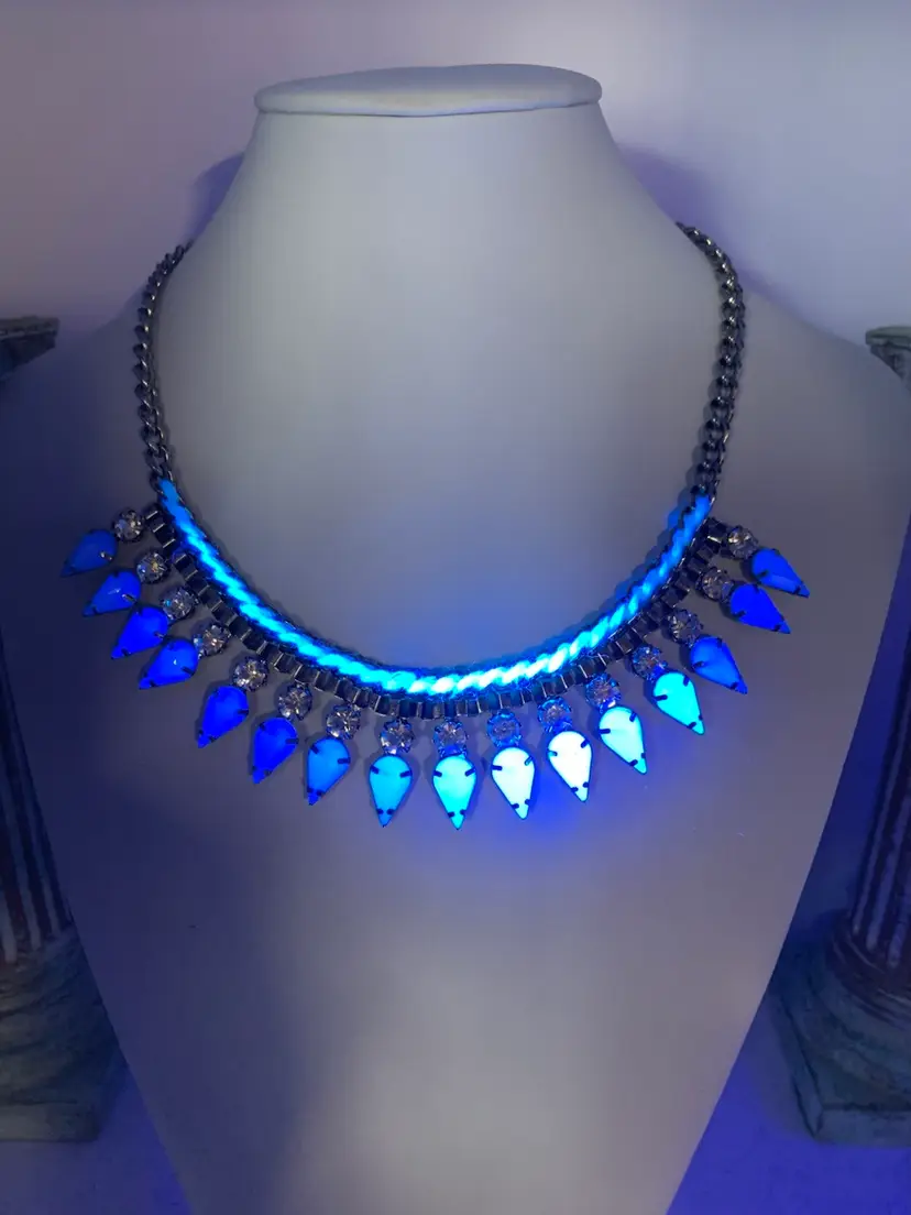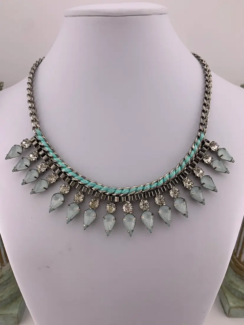 This necklace features light milky aqua colored rhinestones along with clear rhinestones on silver tone metal. There is aqua colored threads woven in also. No makers mark. Lobster claw clasp and extension chain allows this to be worn anywhere from 17 to 20 1/4 inches. In wonderful used condition. Did I mention she glows?