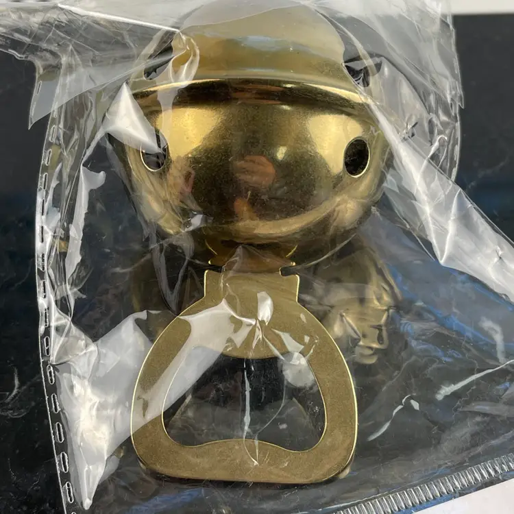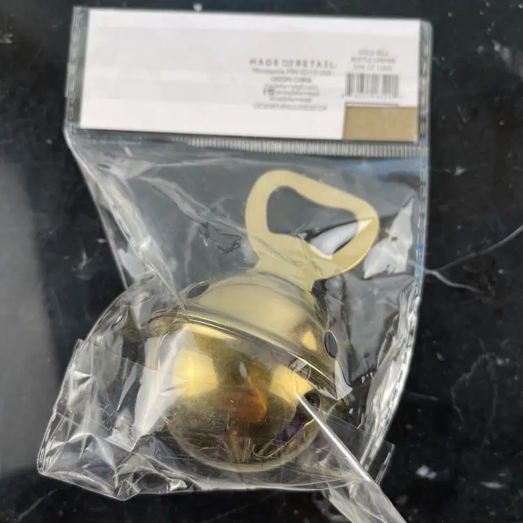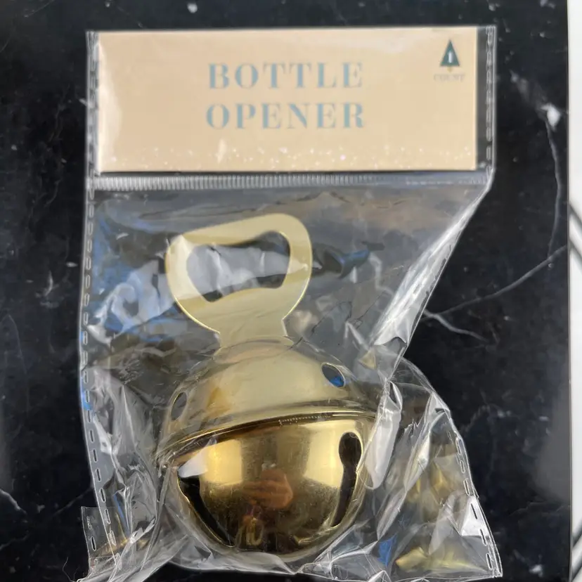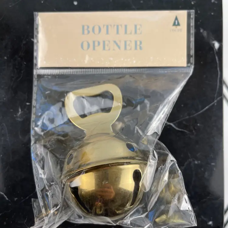 The Gold Jingle Bell Bottle Opener is a stylish addition to your holiday bar setup. This 4" handheld bottle opener features a festive Christmas design, making it perfect for getting your guests' drinks open during the holiday season. The gold metal material adds a touch of elegance, while the jingle bell detail adds a playful element to the table. Made in China, this new in package bottle opener is sure to impress your guests and make your barware more fun and festive.