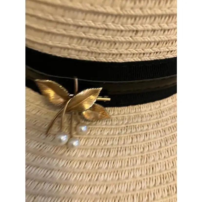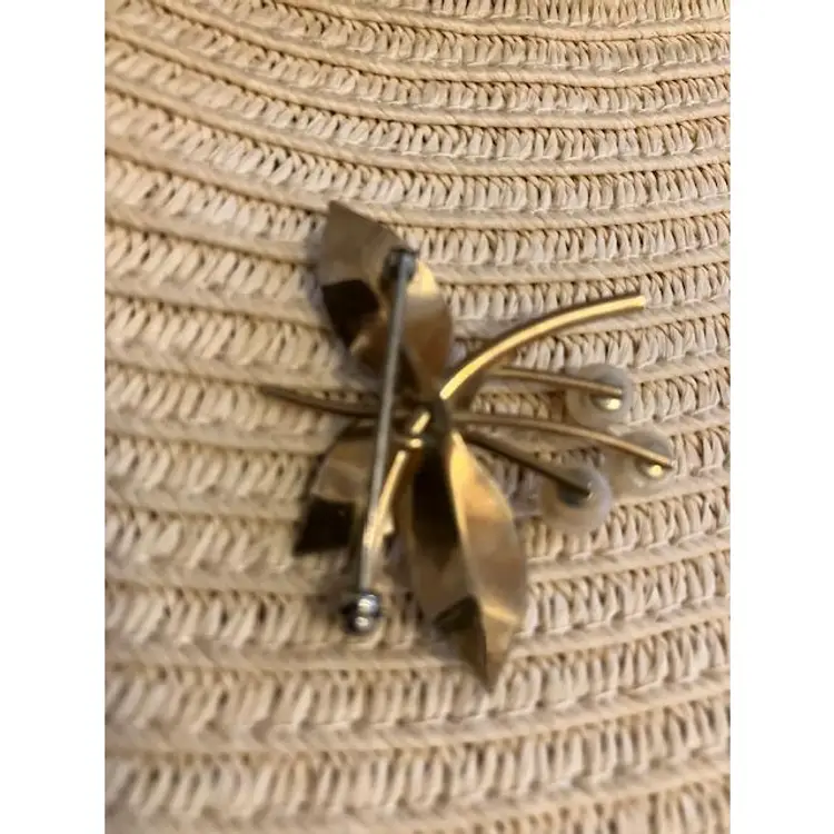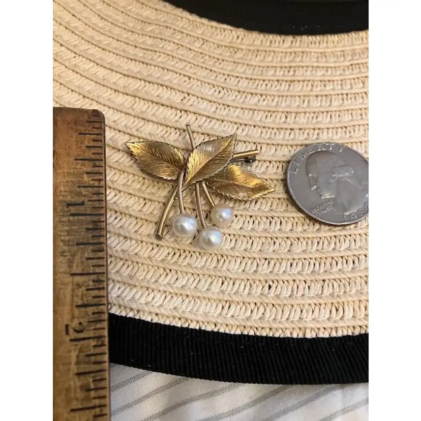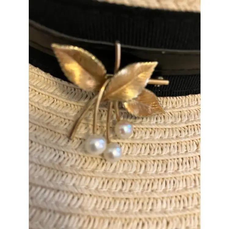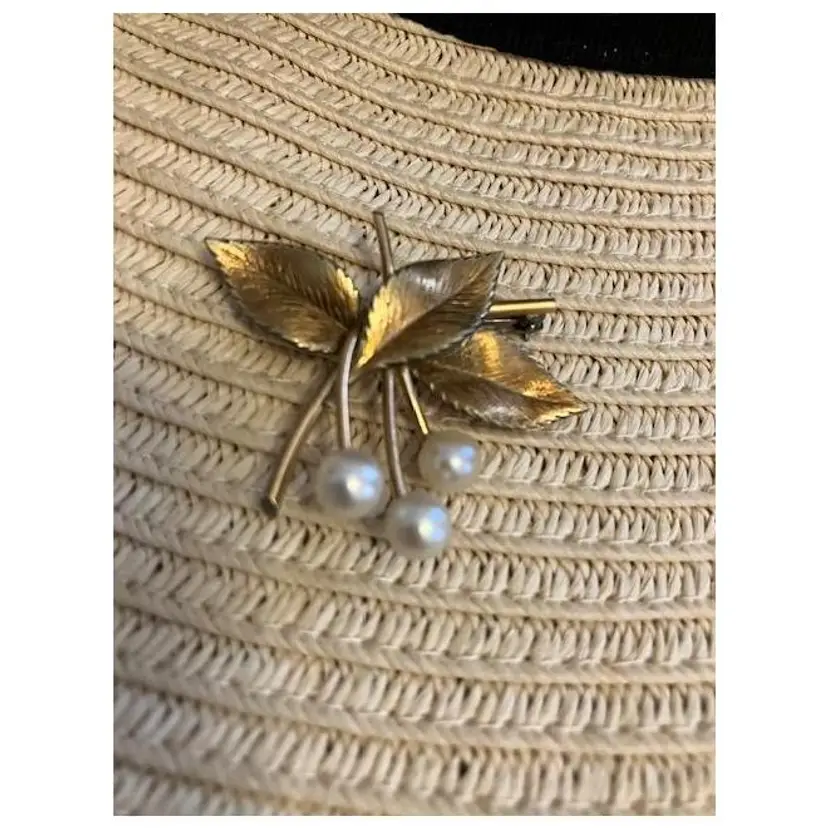 Detailed gold tone leaves with faux pearls. Small and dainty pin. Measures 1 1/2" x 1 1/4". Rollover clasp. No marks or signatures.