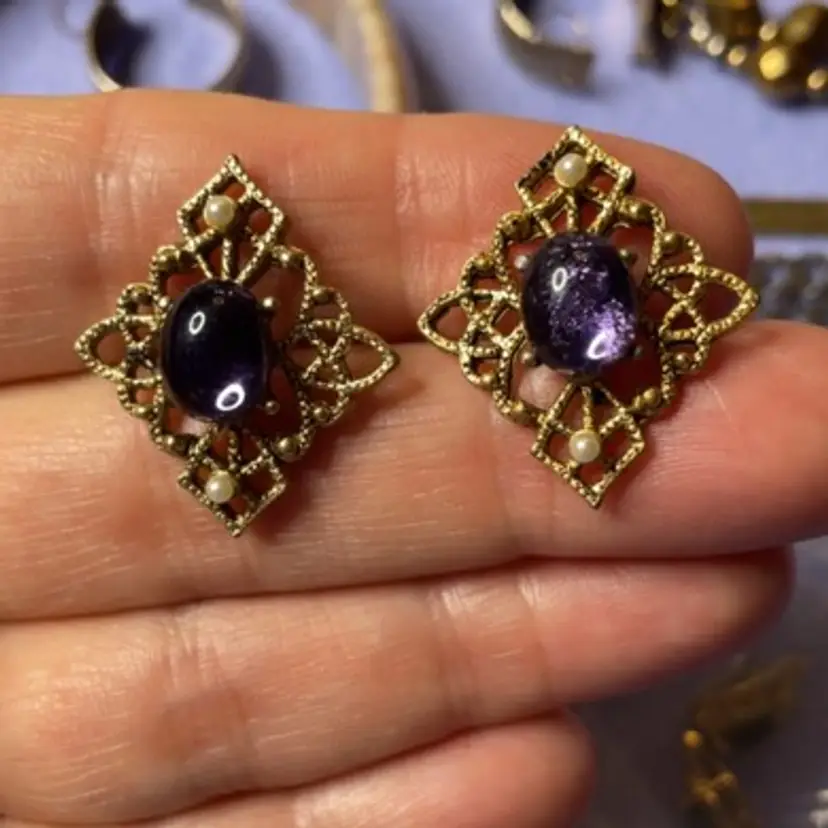 Gold toe, filigree, faux, pearl plastic purple metal stone earrings pierced