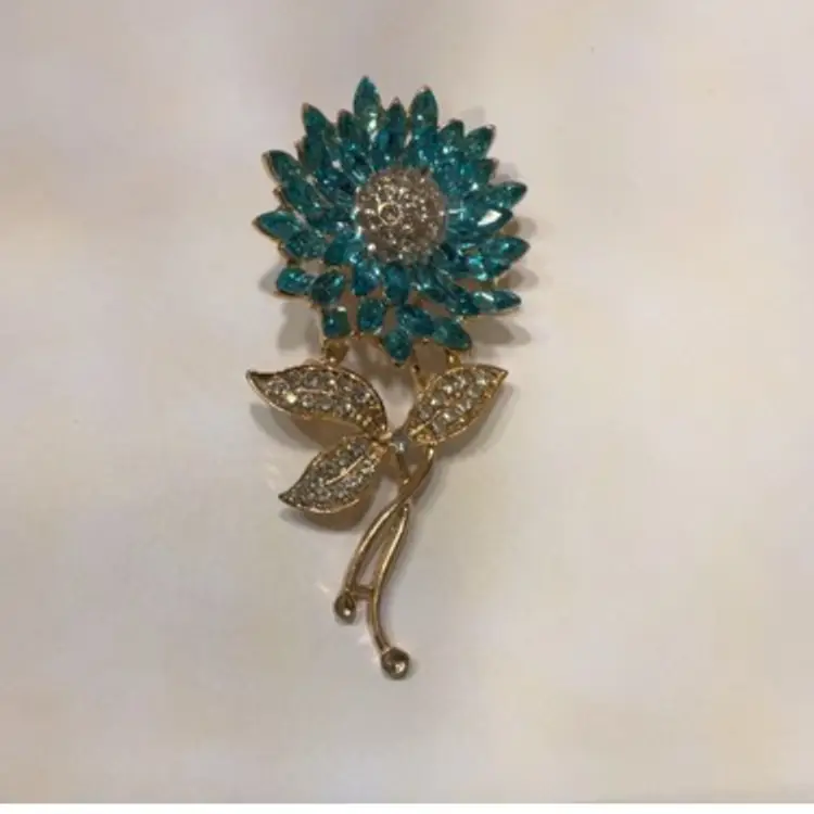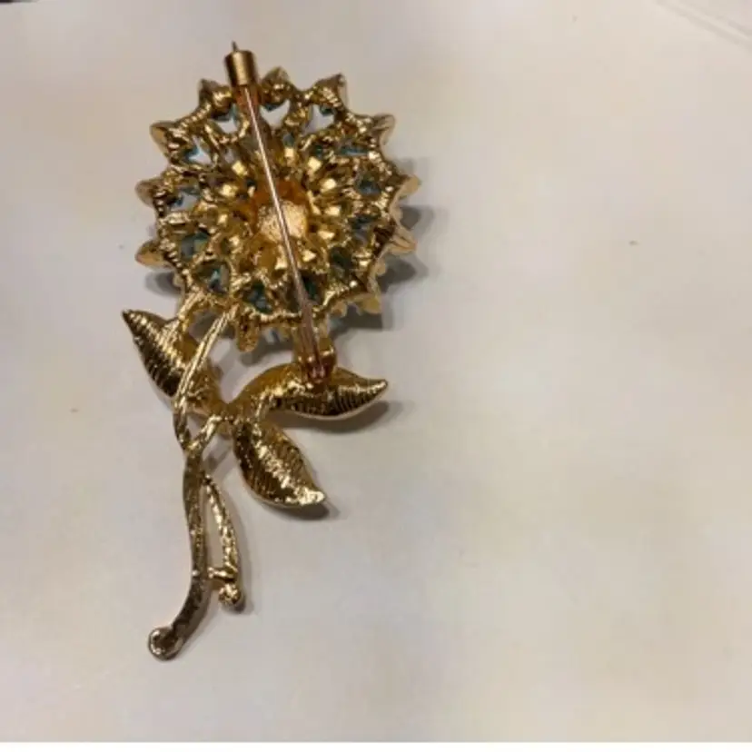 Measures 2 1/2”x1”. Unsigned. Brooch ha both blue and clear rhinestones.
