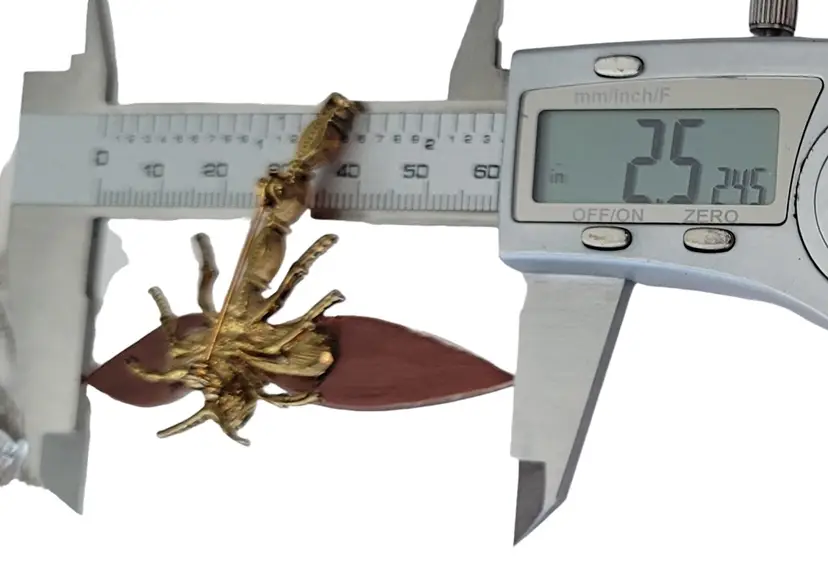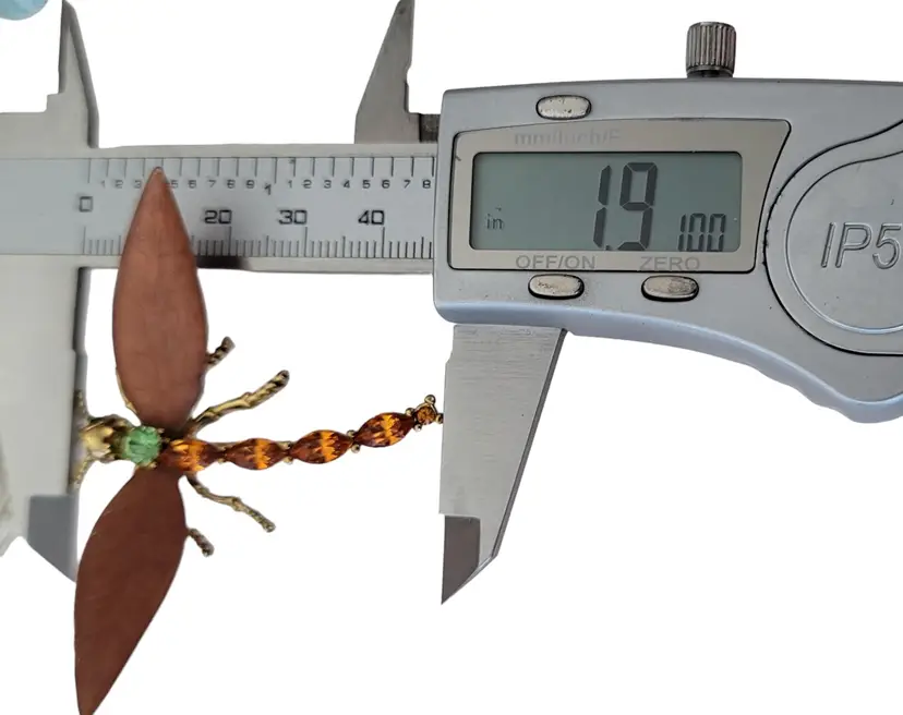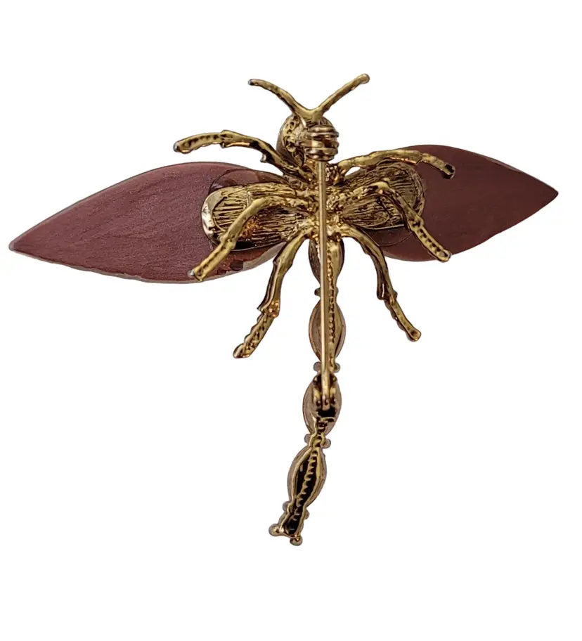 Elevate your ensemble with the elegant allure of this Gold Tone Dragonfly Brooch. Pin this on a chic special occasion or party dress, on your evening dress, or high on the elegant shawl. This piece stands out for its stunning detail and delightful nature-inspired insect costume jewelry. Featuring a radiant gold tone dragonfly figure, the wings are textured copper tone plastic, and the tail and the body are elaborately designed with orange and green rhinestones individually and securely prong-set, producing a genuinely lifelike depiction. It measures approximately 2.5 inches at its widest and 1.9 inches in length. The back has a sturdy roll-over safety catch that will hold it securely to your clothing throughout the day. The captivating element of this brooch will sparkle delightfully across the body when worn.