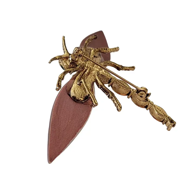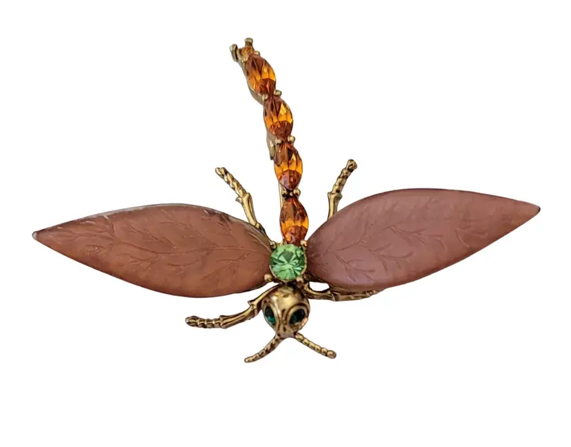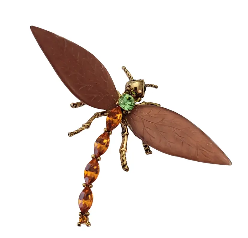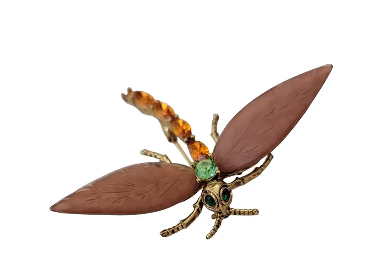 Gold Tone Orange Green Rhinestone Copper Tone Textured Wing Dragonfly Brooch Pin E669