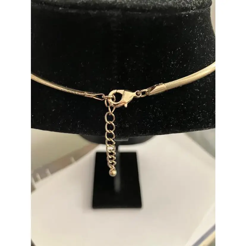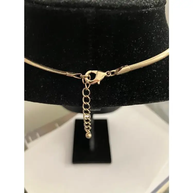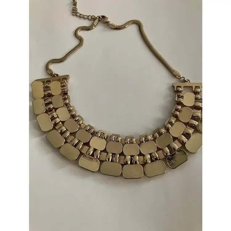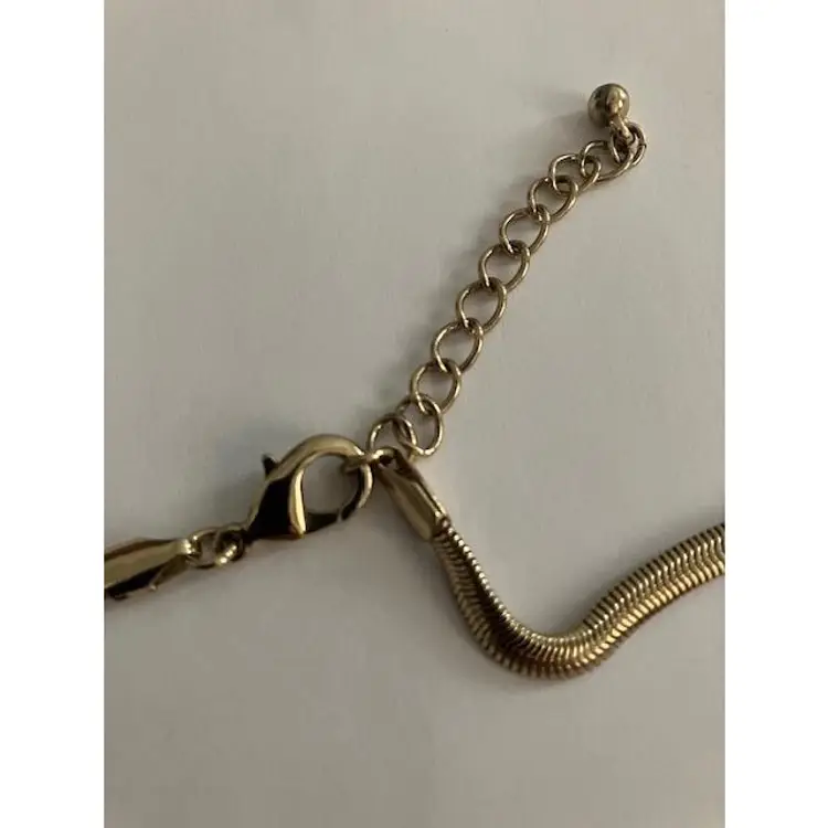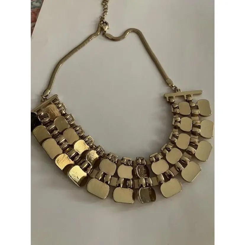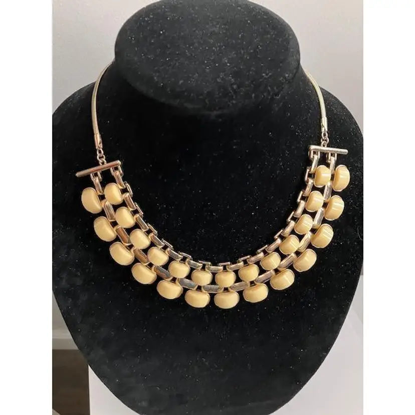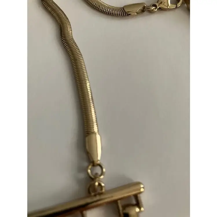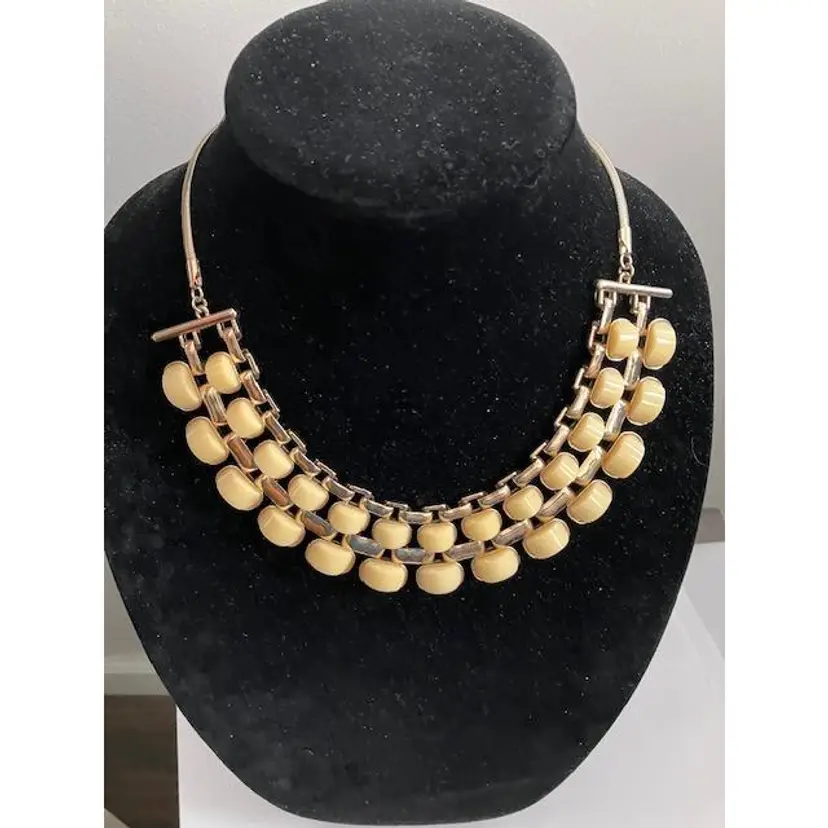 Gold tone snake chain with gold tone metal & yellowish tinted resin rectangles. Lobster claw clasp. Length is 18" plus 2" extender. Hang length is about 9". Unsigned. Great condition.
