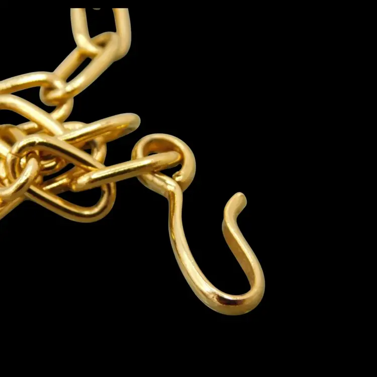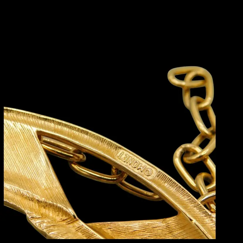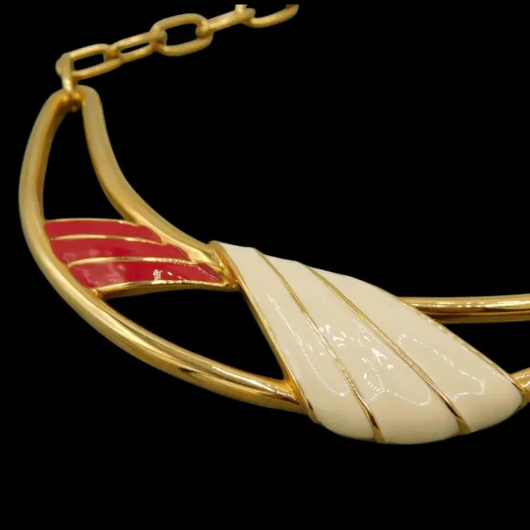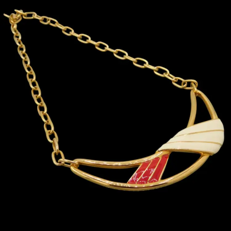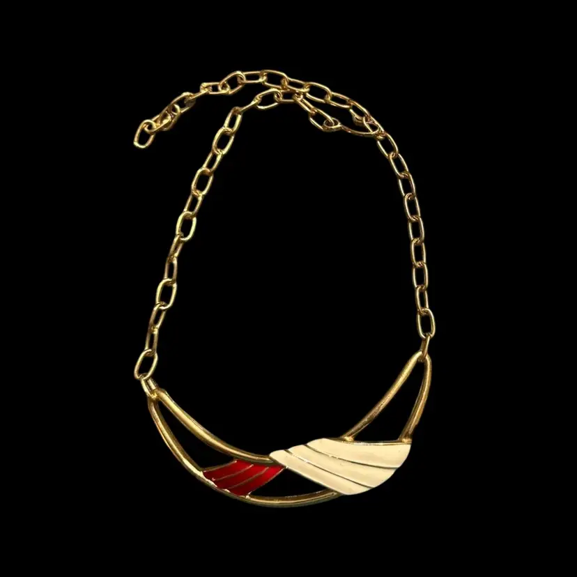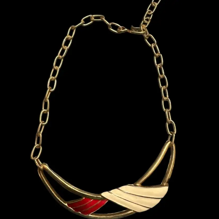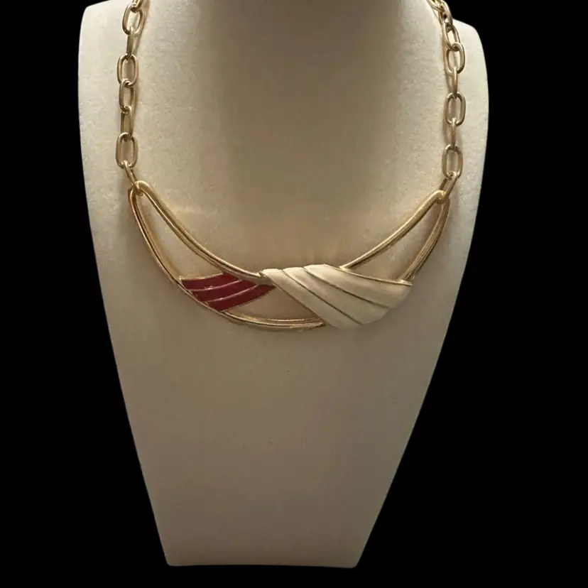 Striking Monet mini bib or collar pendant in glossy red and cream enamel on beautiful gold tone metal. The necklace chain is a nice big oval link with a hook closure. Necklace is about 17 inches long. The pendant or mini bib element measures about 4 inches side to side and 7/8 inches top to bottom. This is in excellent condition and signed ©MONET