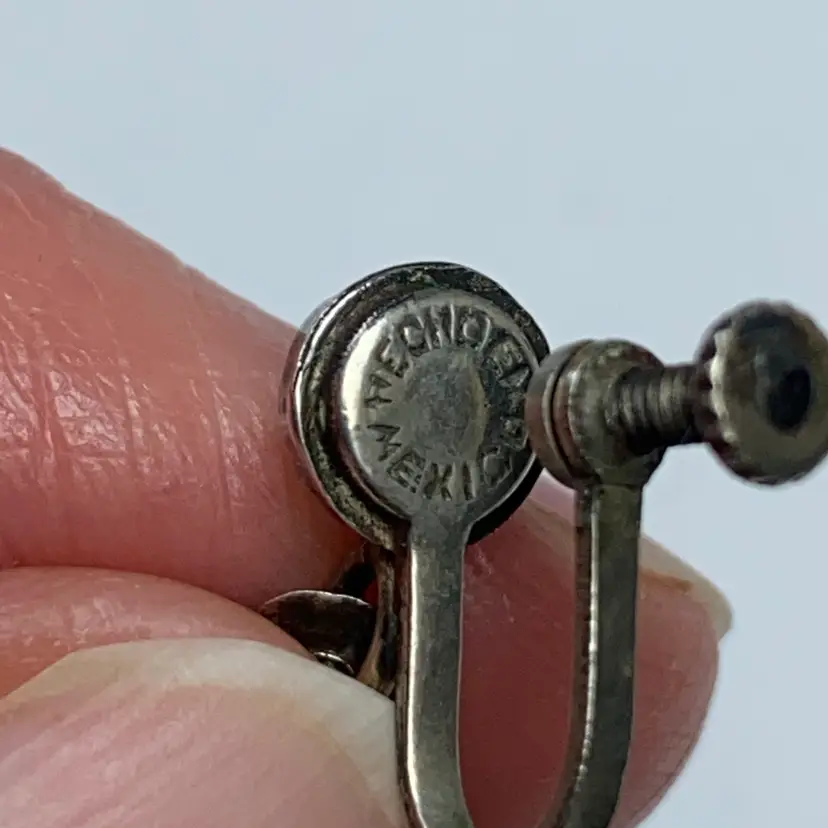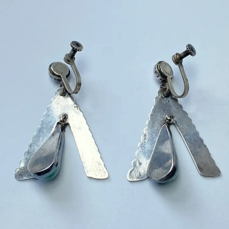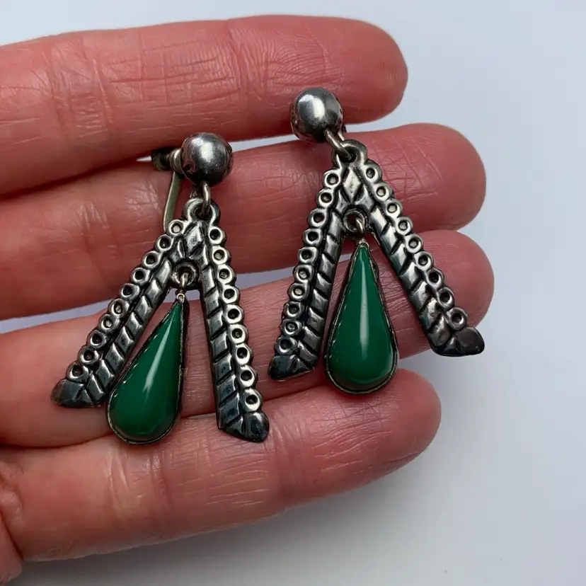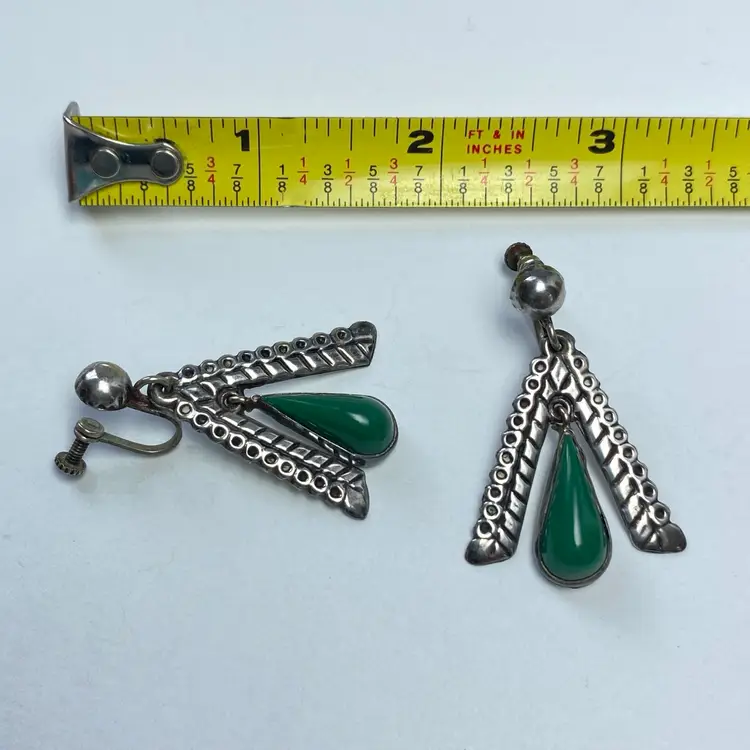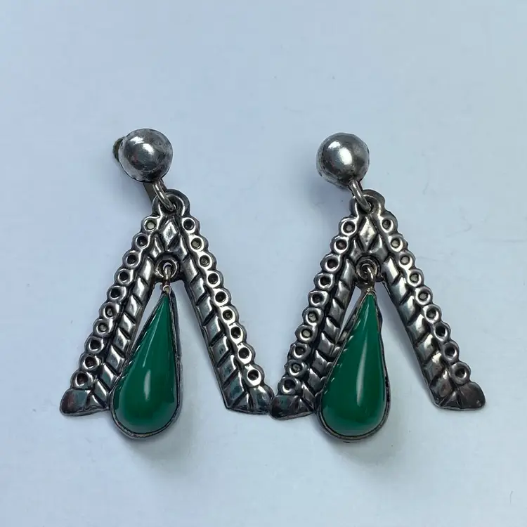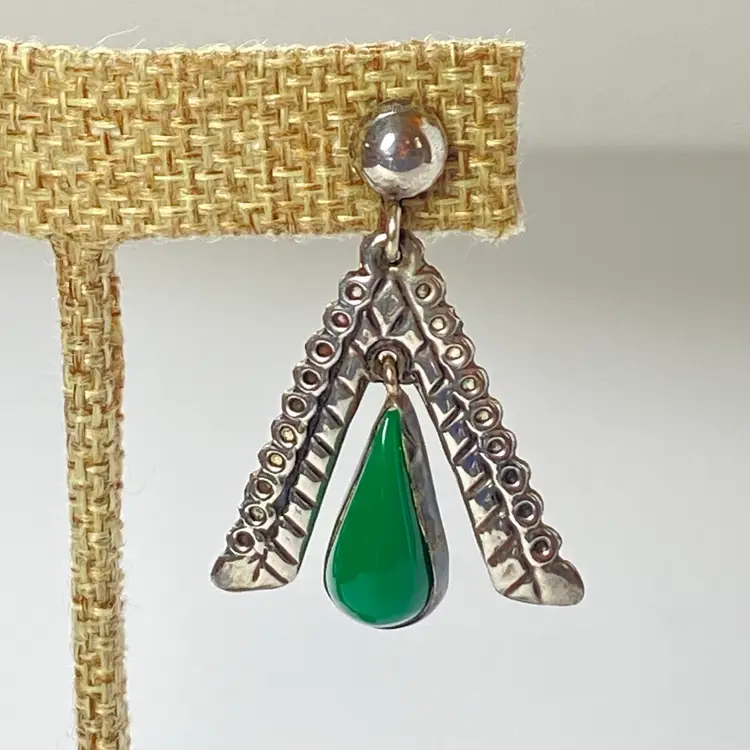 Vintage Bohemian Green Chalcedony Chrysoprase Teardrop Mexico Silver Articulated Textured Pyramid Triangle Dangle Drop Screwback Earrings. Good vintage condition consistent with age. Marked "Hecho en Mexico". Not marked silver, but tests as 800 silver. Please see pictures for details. SMOKE FREE/PET FREE HOME Approximate measurements: Length- 1.5" Width- 1"