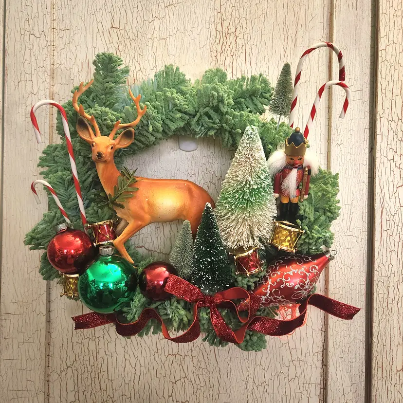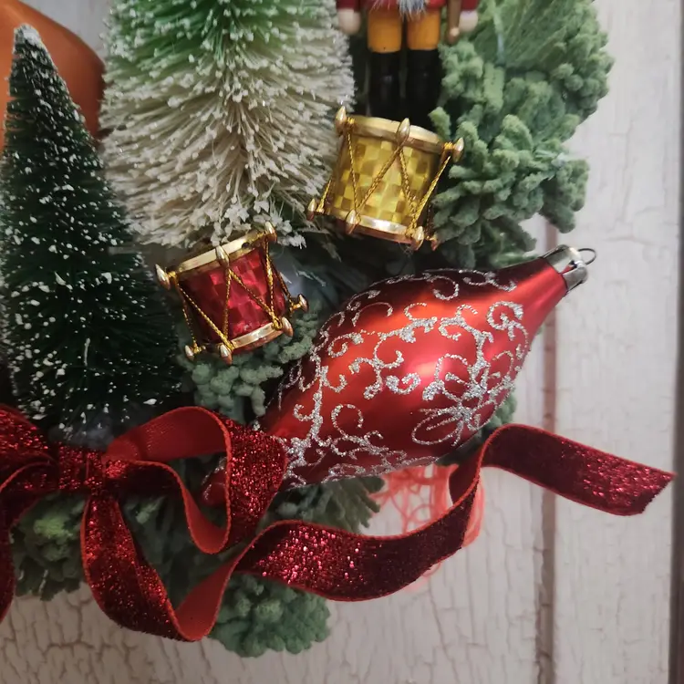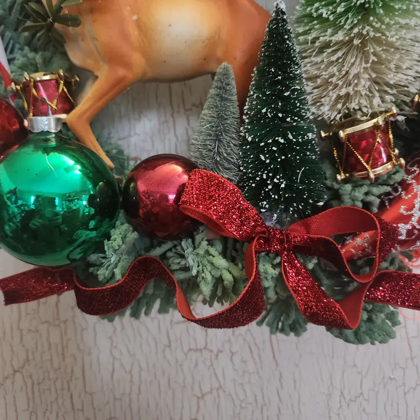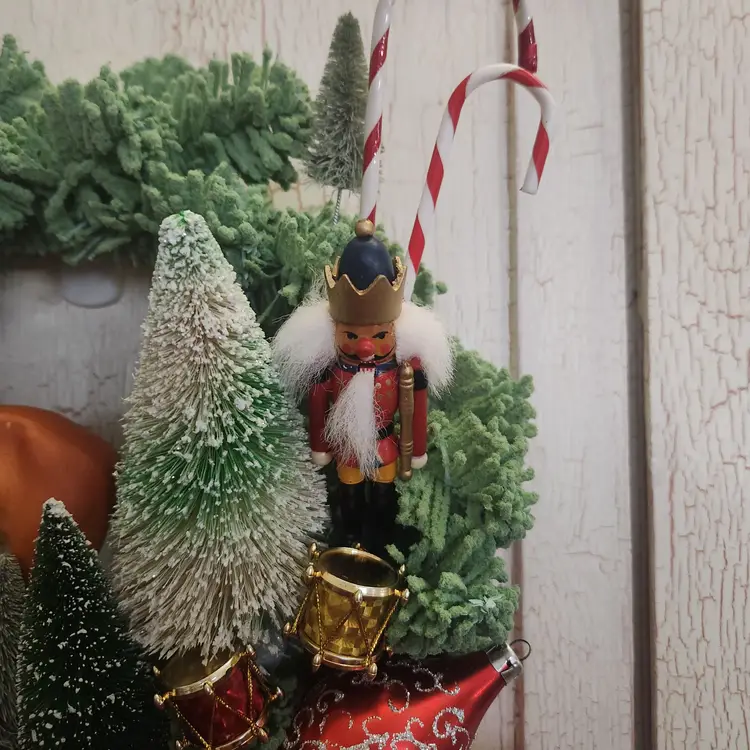 A vintage Beyer Buck stands tall among the bottle brush trees, toy drums and candy canes. I used a variety of vintage ornaments. The wreath is completed with a red sparkly bow. It measures 10 plus inches.