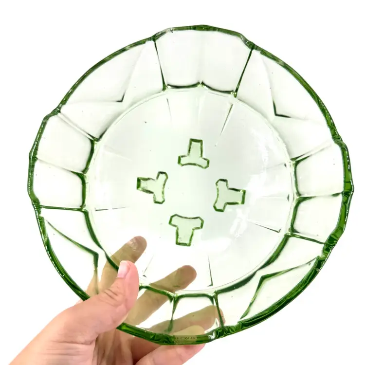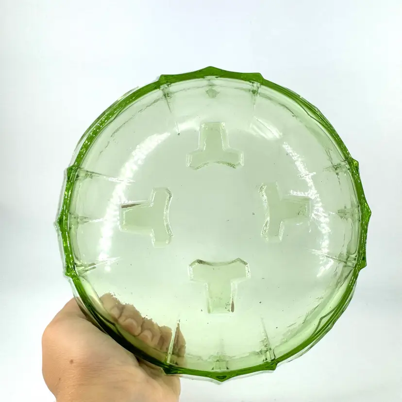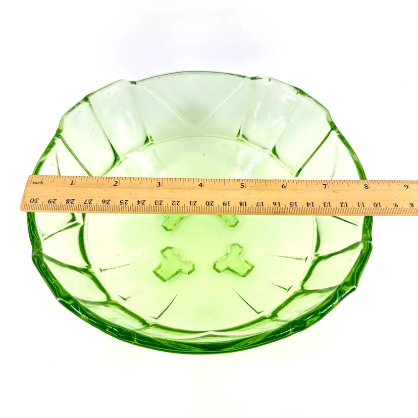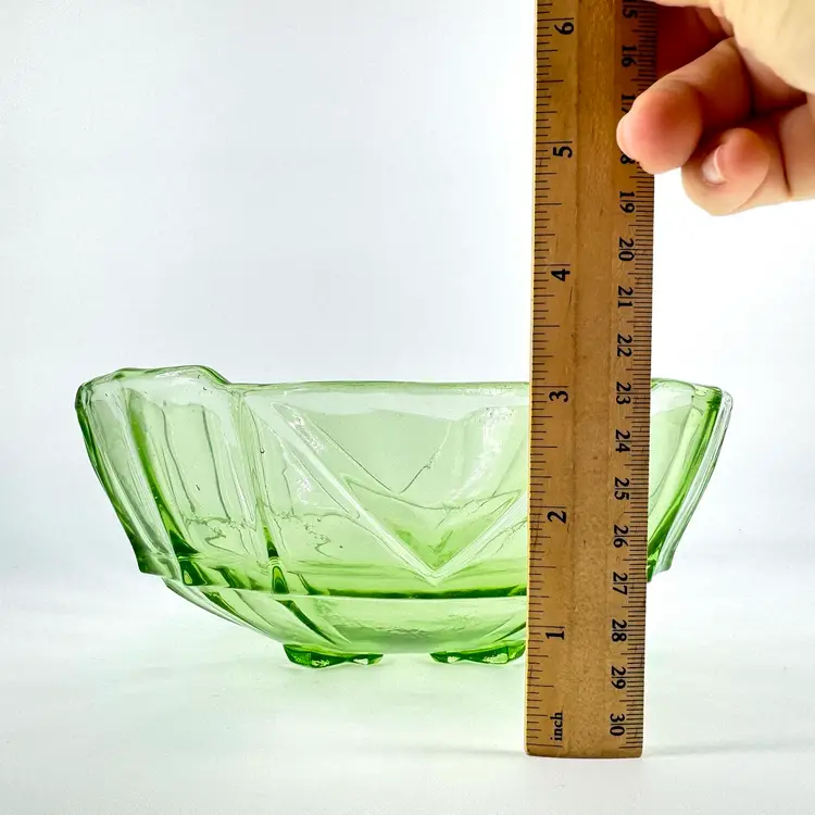 This green glass bowl height is approximately 3.5”. The width is approximately 8”. This bowl does NOT glow under blue light. There are no cracks, but it does have some chips on the feet that can be seen in pictures. No signatures or markings.