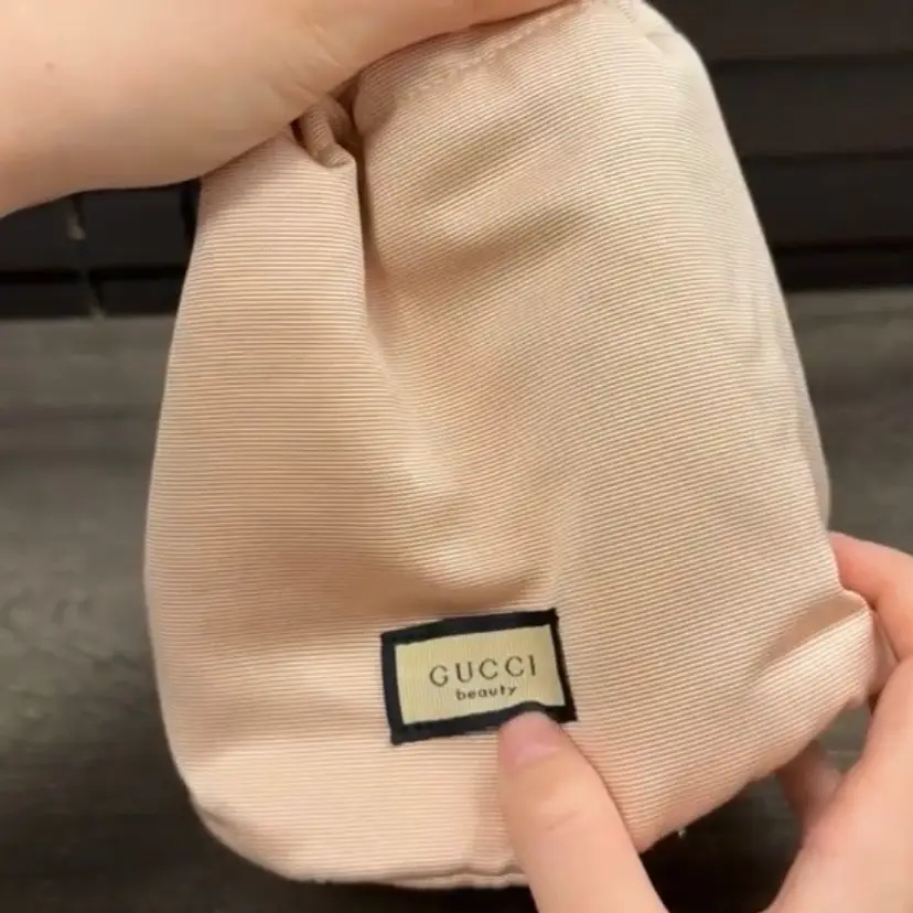 Gucci Beauty Large Pink Bucket Makeup Bag with Floral Fabric on the inside.