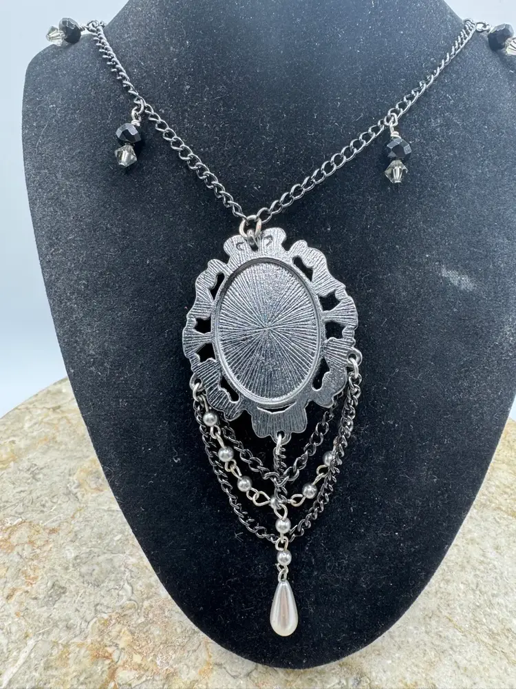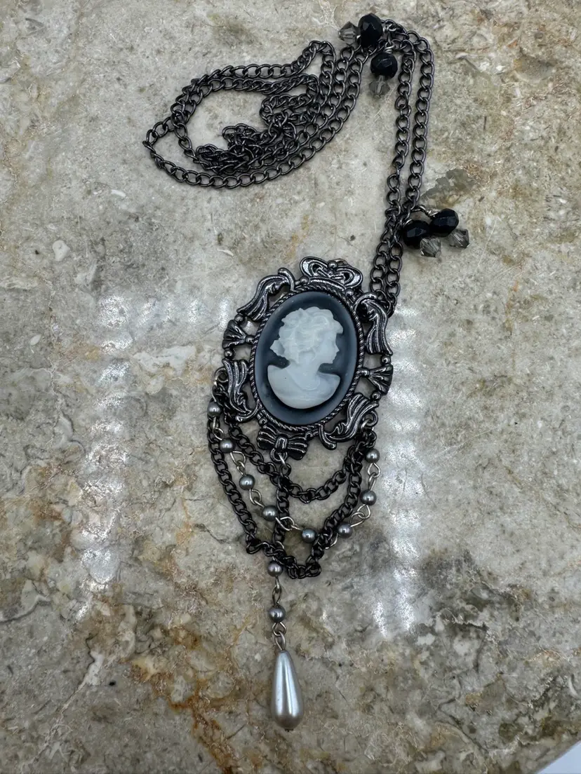 Gorgeous Gunmetal Grey Victorian Costume Cameo Necklace With Glass Beads & Faux Pearls. Excellent condition. Measures 26”
