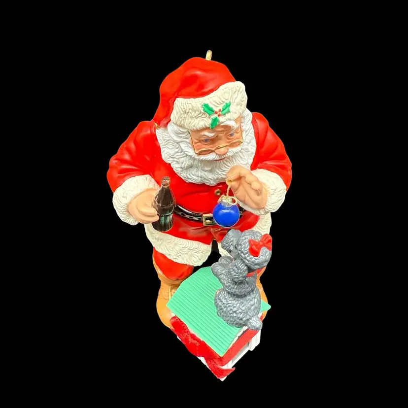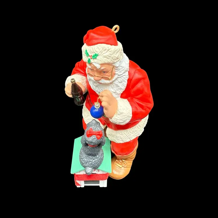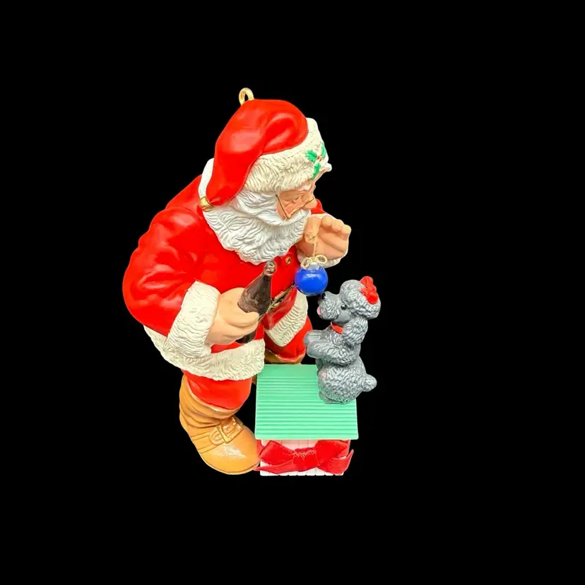 The Hallmark Keepsake Ornament 1992 Playful Pals Coca-Cola Santa with poodle Puppy is a vintage collectible featuring a Santa Claus shape made from mixed materials. This multicolor ornament, produced by Hallmark in 1992/93, is part of a Christmas-themed collection and includes a hanging feature for decoration. With its nostalgic Coca-Cola franchise tie-in, this ornament captures the festive spirit of the holiday season with a charming and playful design that is perfect for collectors or those looking to add a touch of vintage charm to their Christmas decor.