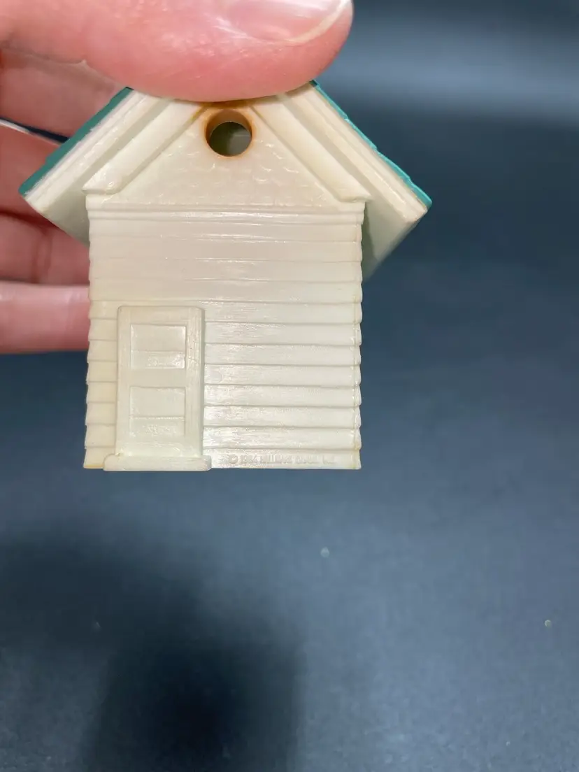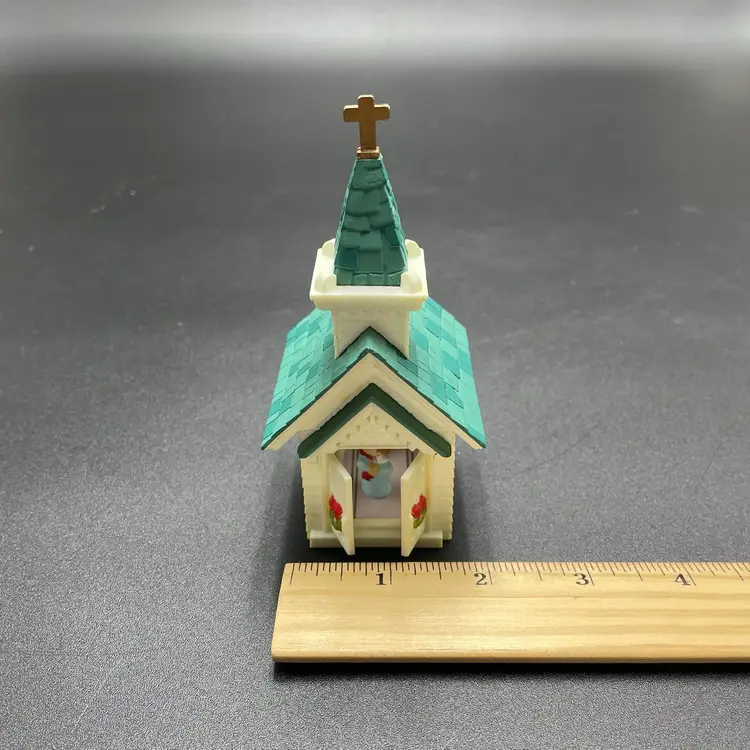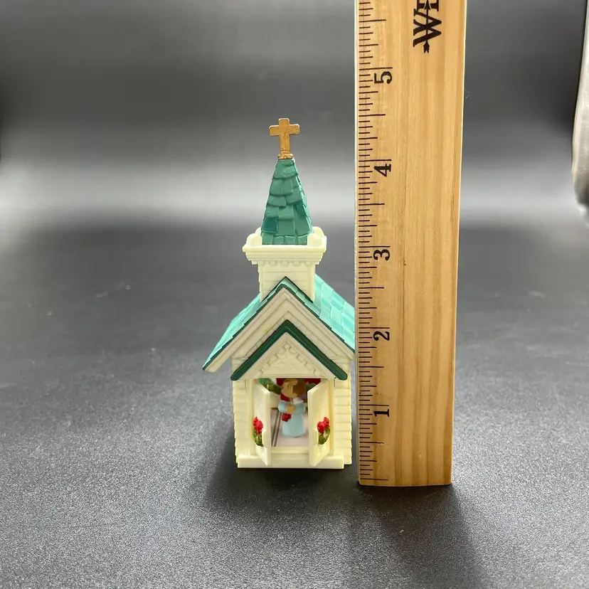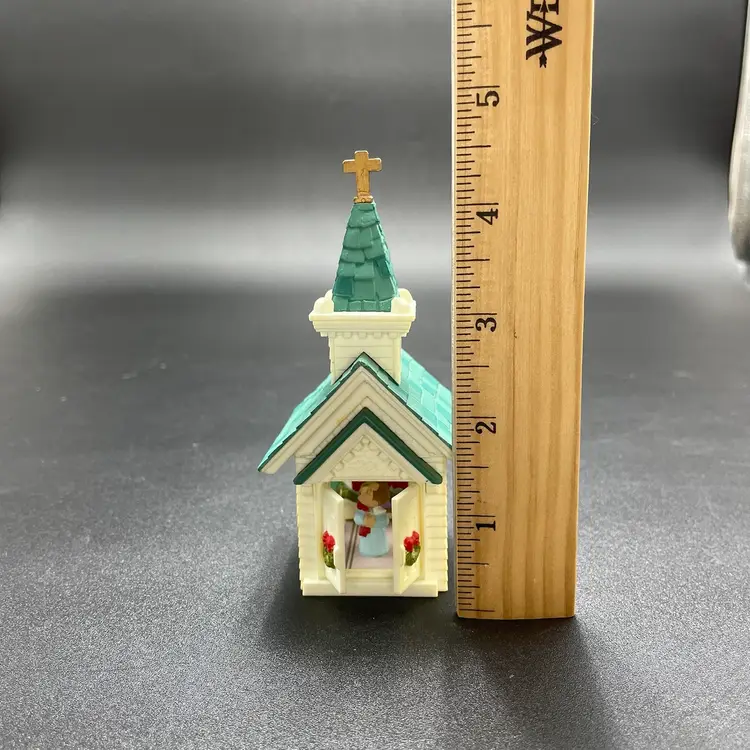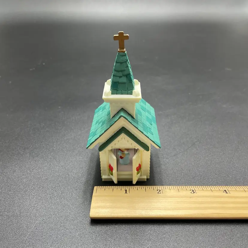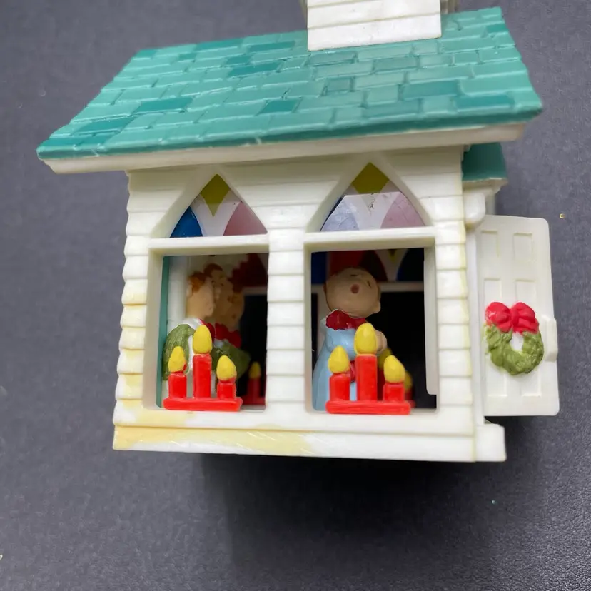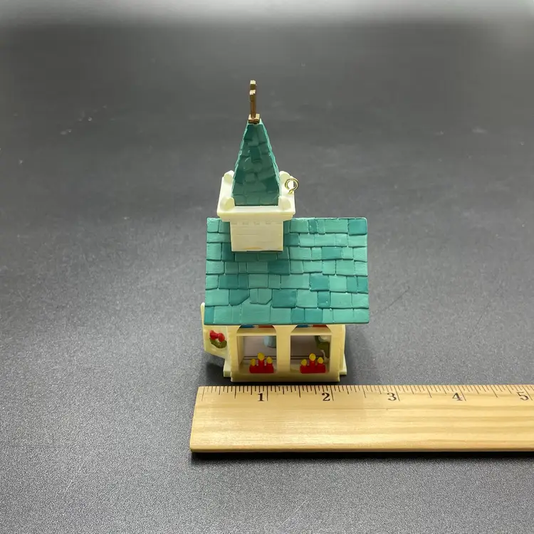 This is a vintage 1984 Hallmark Village Church hanging ornament. It has an opening on the back that allows you to insert a Christmas tree light bulb in so it lights up the inside showing a choir. Measures approximately 4.5" tall x 2" wide x 2.5" long. No box. No major flaws.