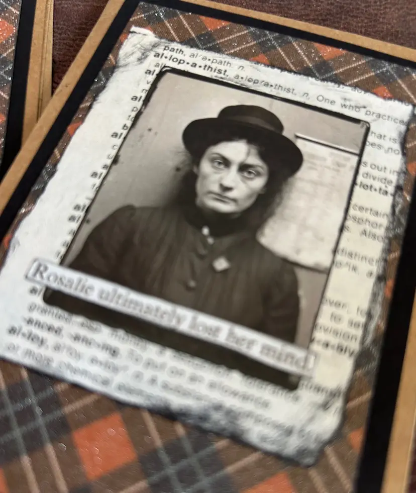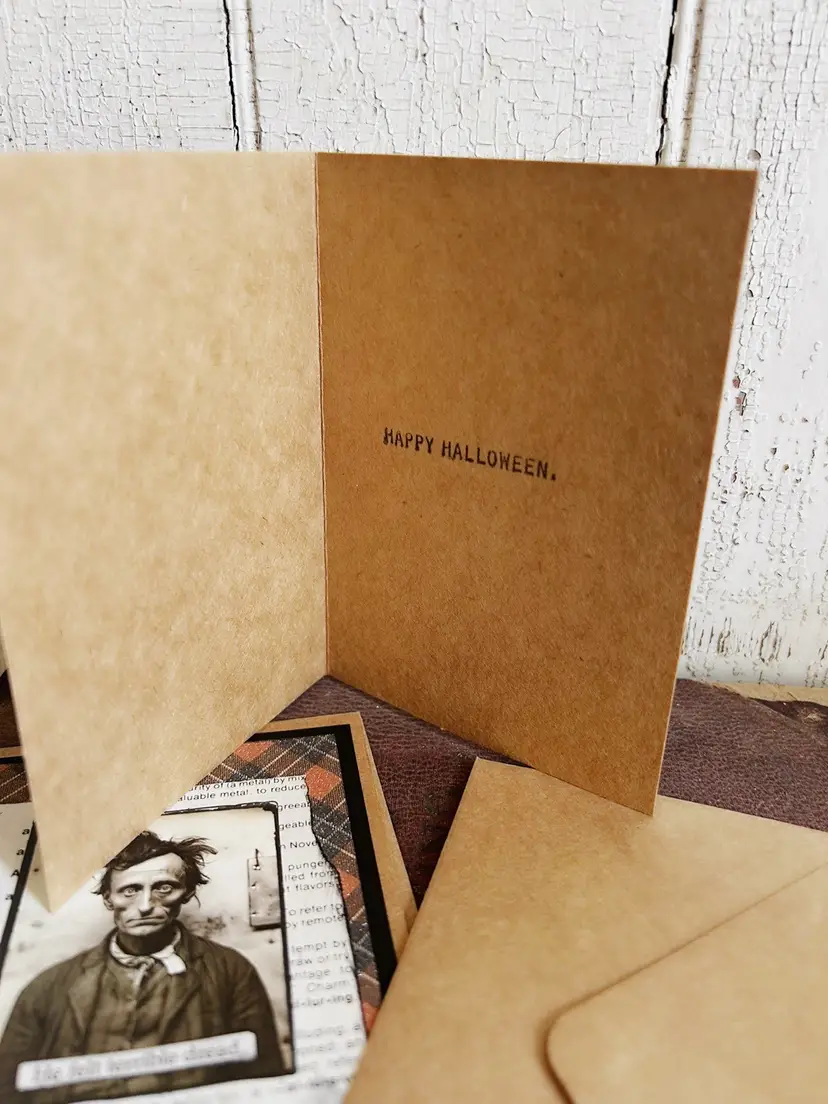 Set of 2 of my handmade happy Halloween cards, perfect for your adult guys and ghouls. Or framing for decor. These are brown 3 1/2” x 5” with matching envelopes. These fronts are embellished with creepy old black and white photos, old dictionary paper and Orange and black plaid glittered paper. Included in this set are “he felt terrible dread” and “Rosalie ultimately lost her mind” They say Happy Halloween inside.