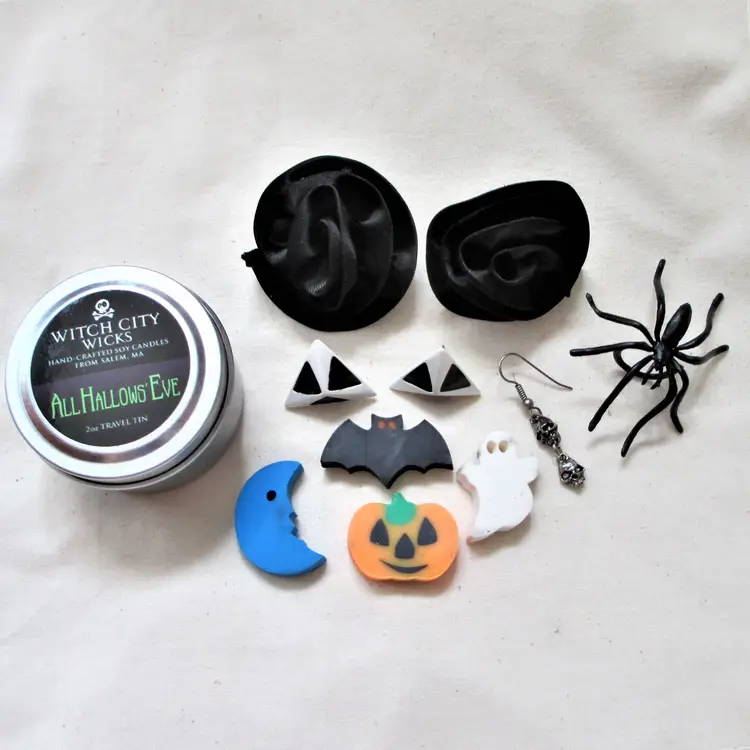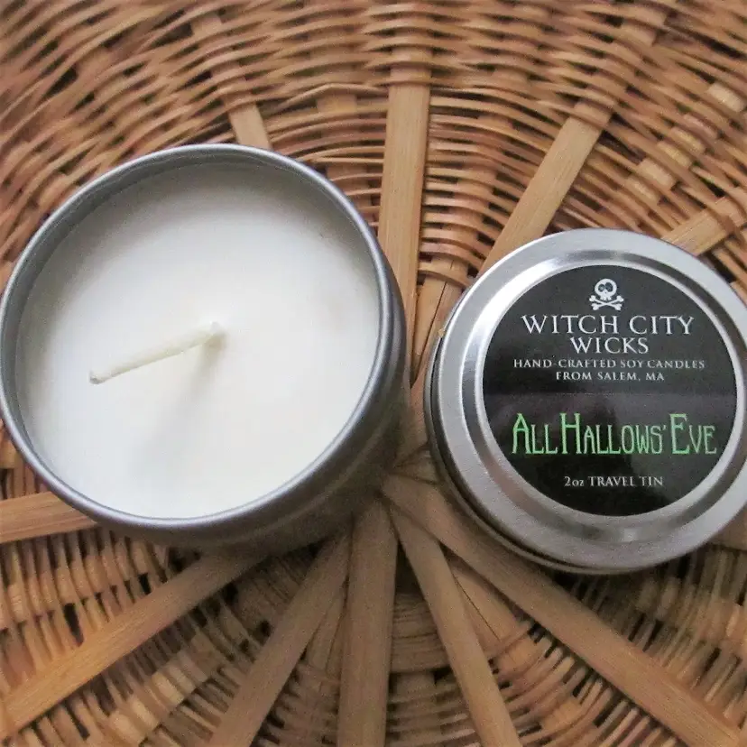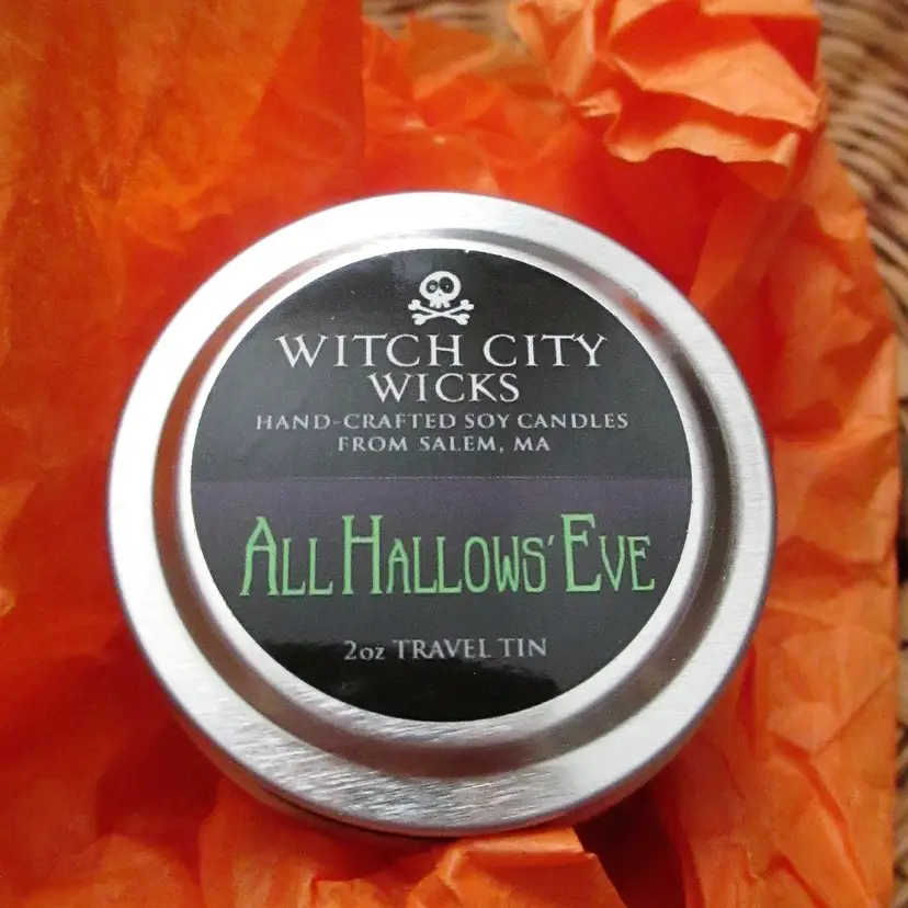 The Treats: 1 Witch City Wicks soy candle, never used (not vintage) Size: 2oz travel tin Scent: All Hallows Eve