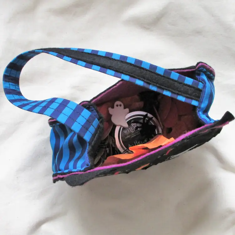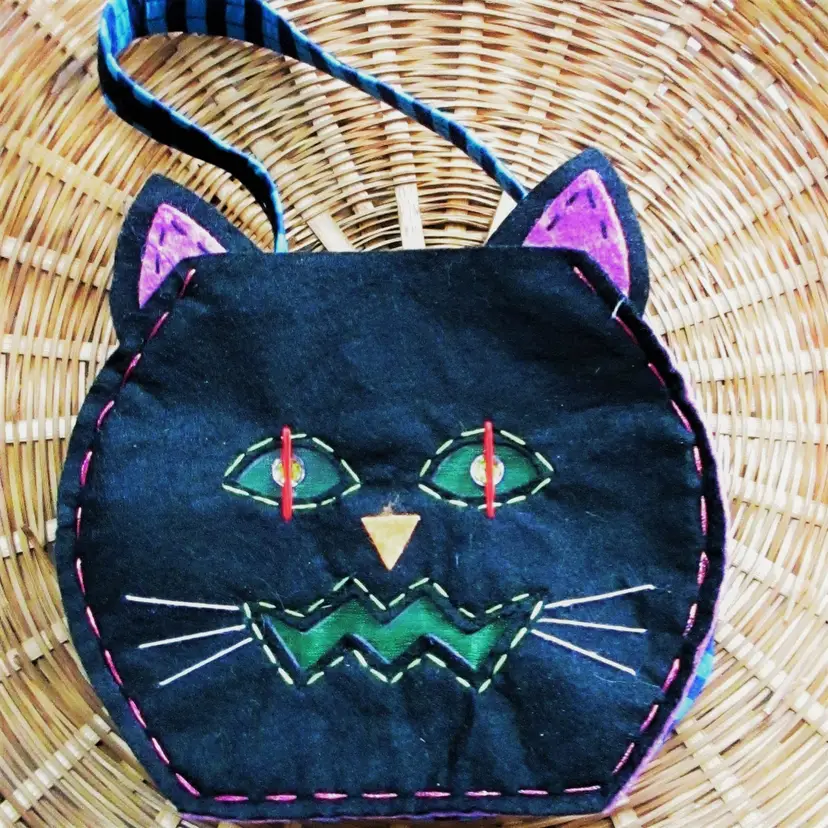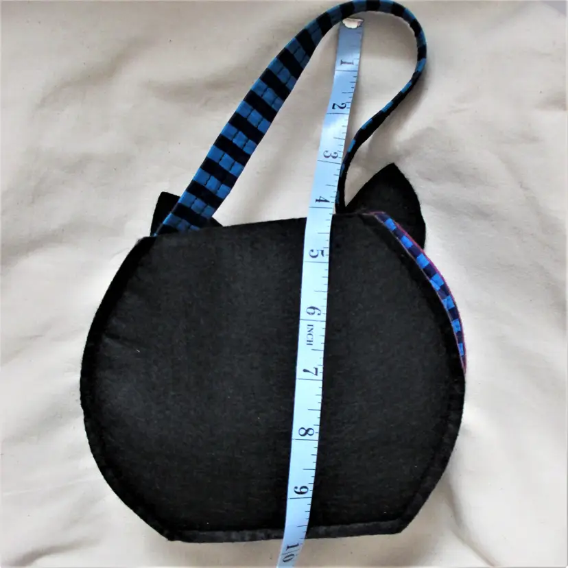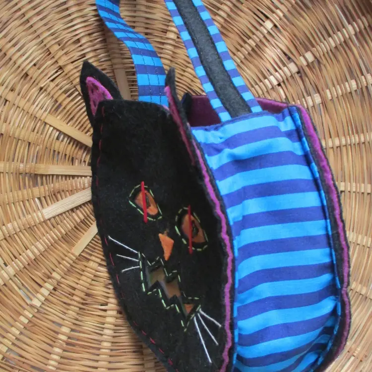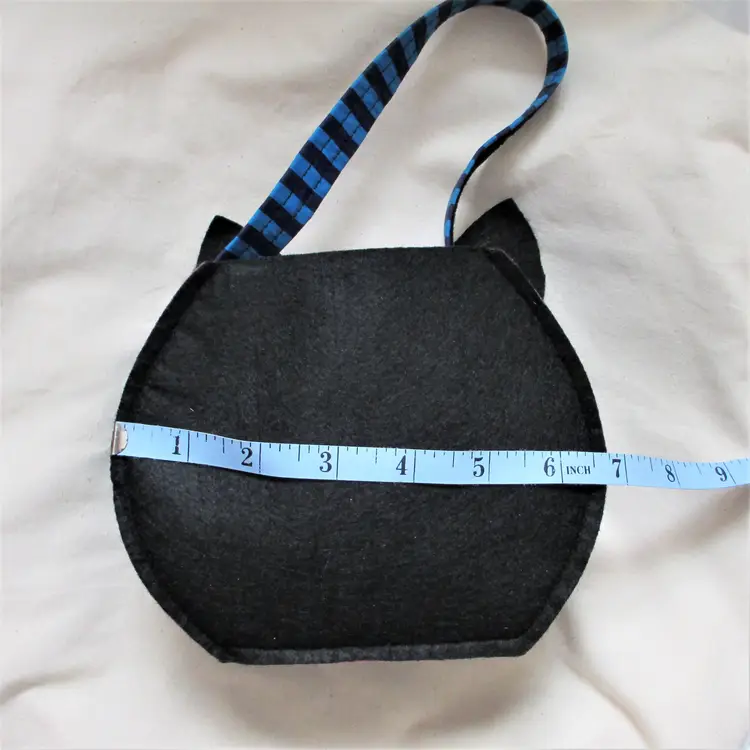 Vintage 90's/00's Cat Tote: Black felt fabric front & back, blue stripe side panels Size: 6" x 6.5" x 2.5" (approx.) EUC