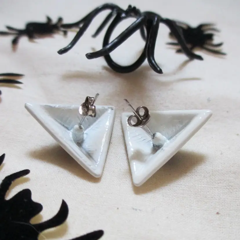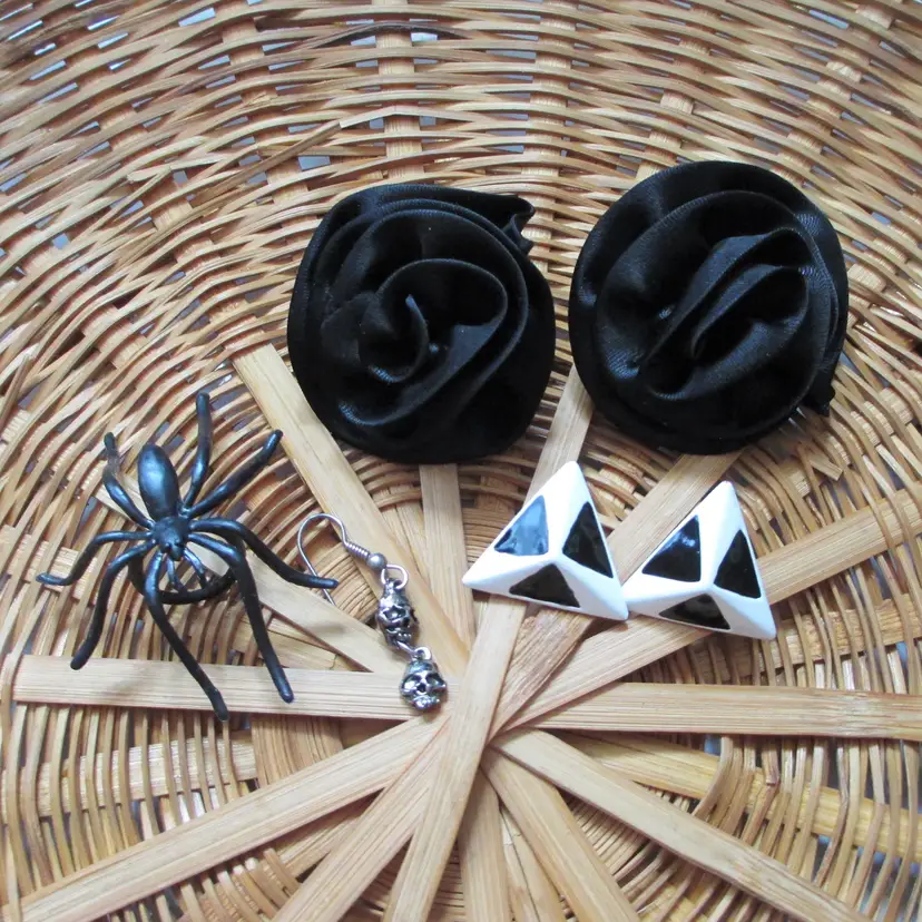 Vintage 80's earrings: 1 pair white & black enamel triangle earrings, like new 1 pair satiny black flower earrings, never worn 1 single double skeleton head silver-tone dangle earring, gently worn