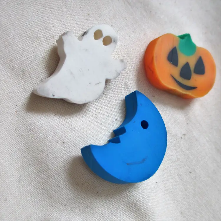 4 vintage 80's novelty erasers: 1 each: black bat, blue moon, orange pumpkin, white ghost Unused, show some marks (see photos)