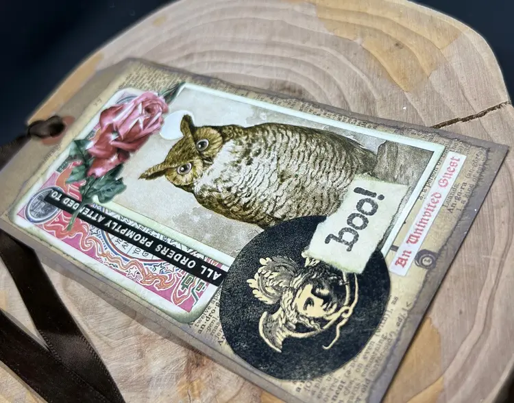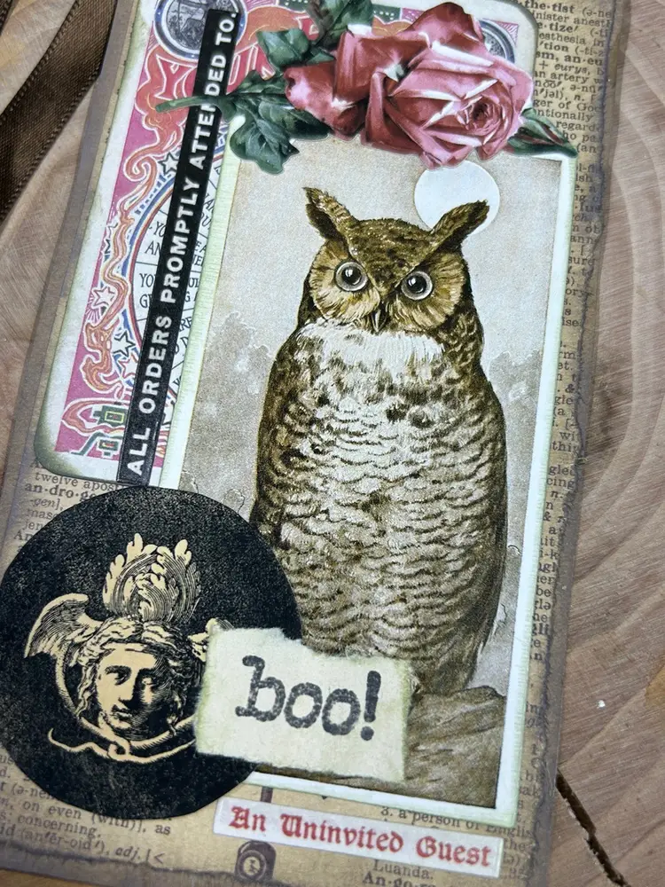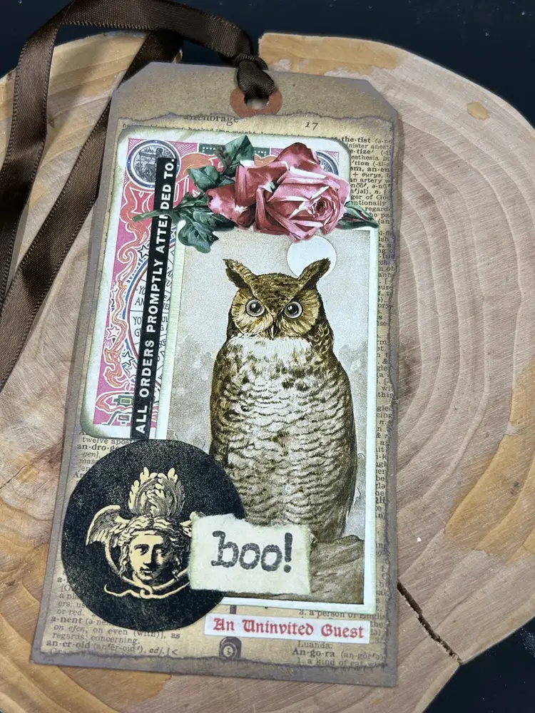 Boo! Handmade Halloween owl tag, made with a mix of grungy papers, vintage images and a little stamping. This is a large 6 1/4”x3” brown tag with chocolate brown satin ribbon. Plain on the back. One of a kind.