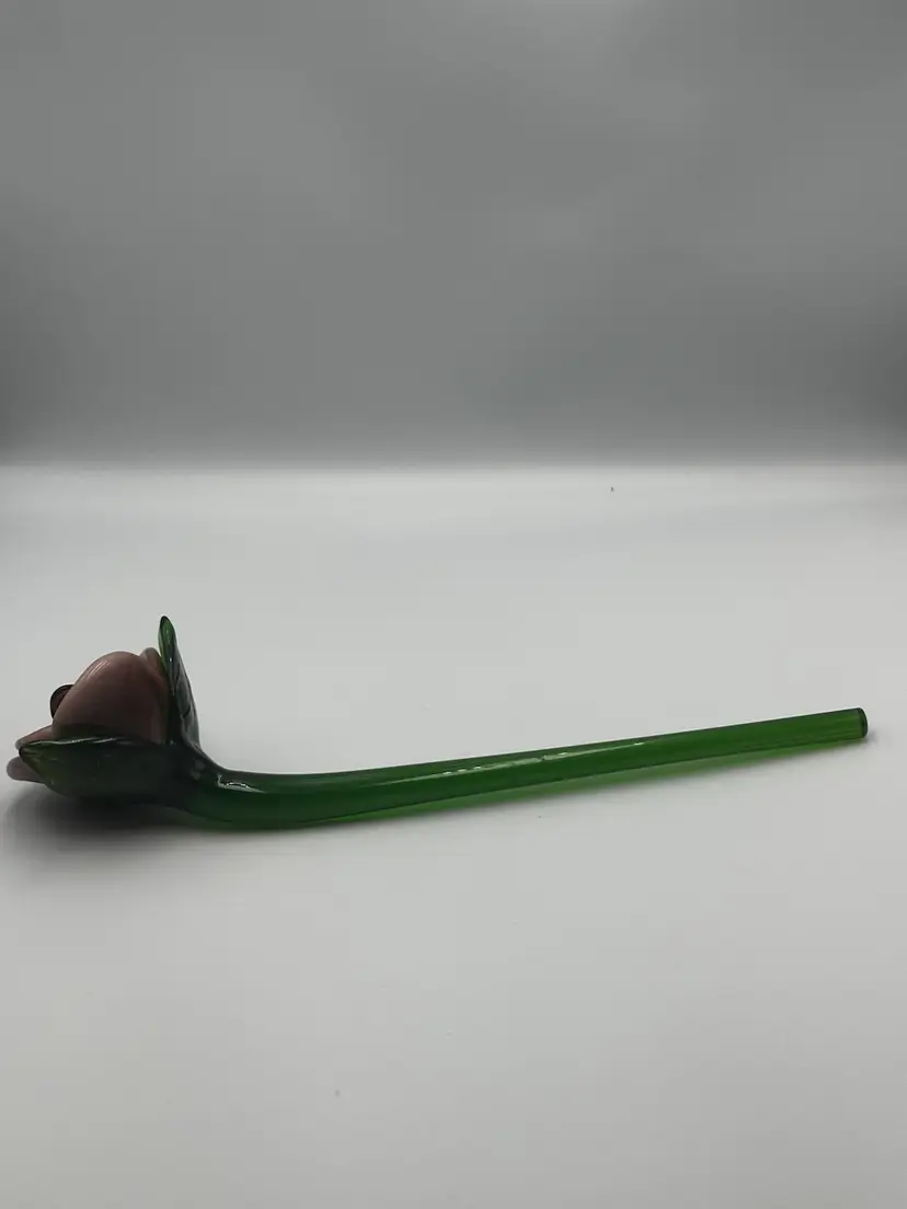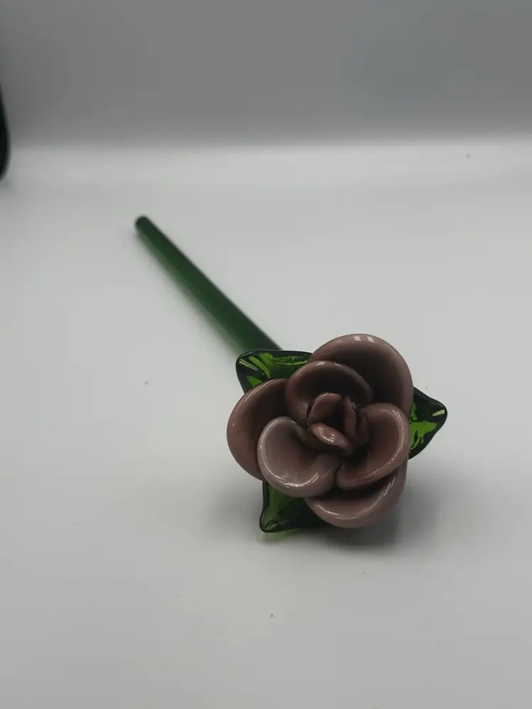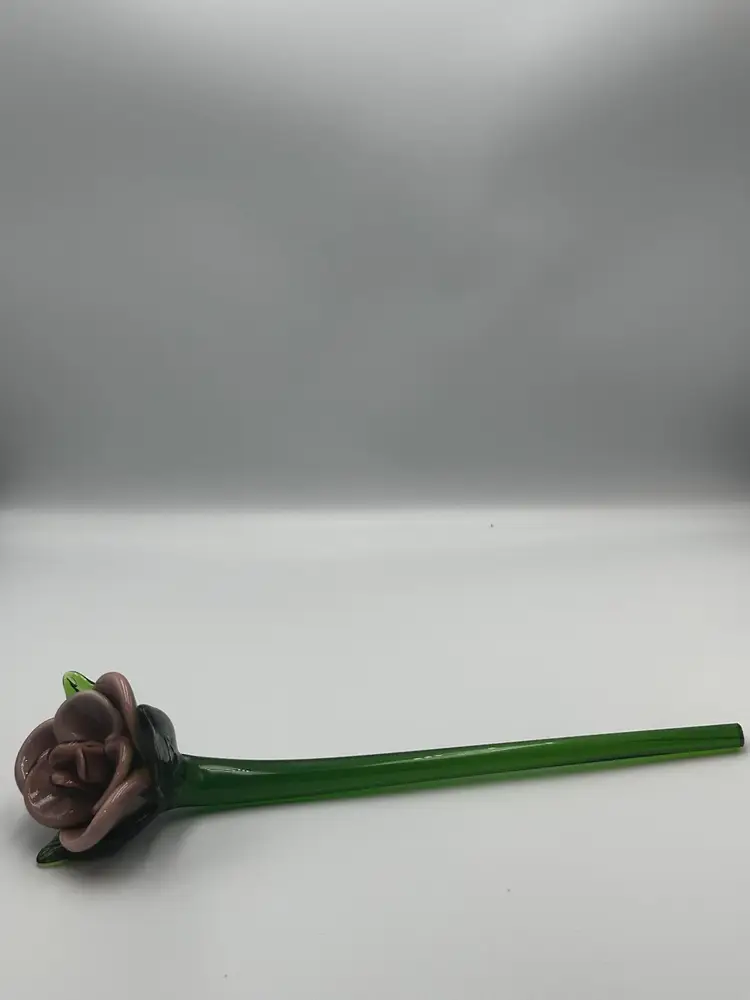 No chips or cracks. Mauve to purple 9 inches long hand-blown art glass long-stem rose.