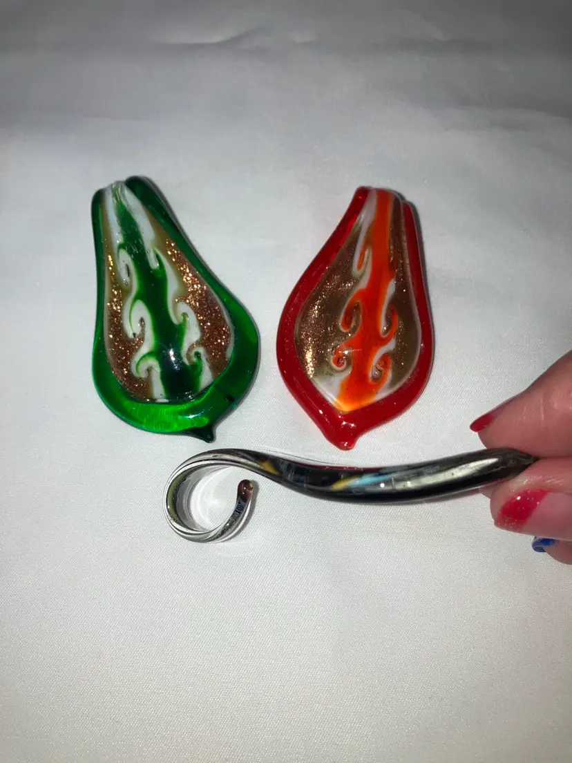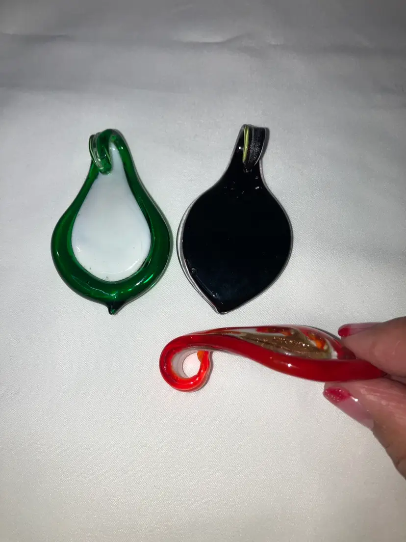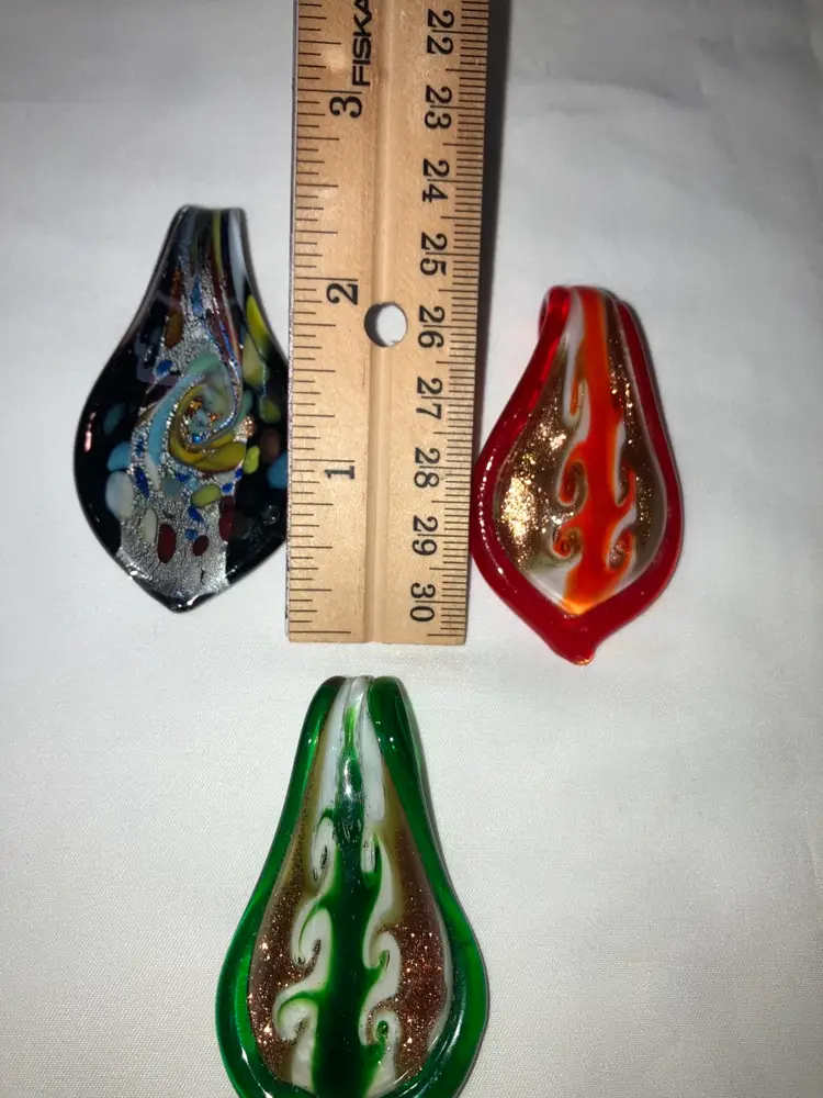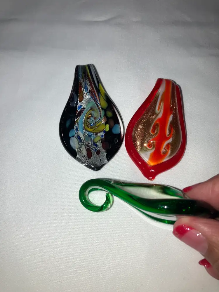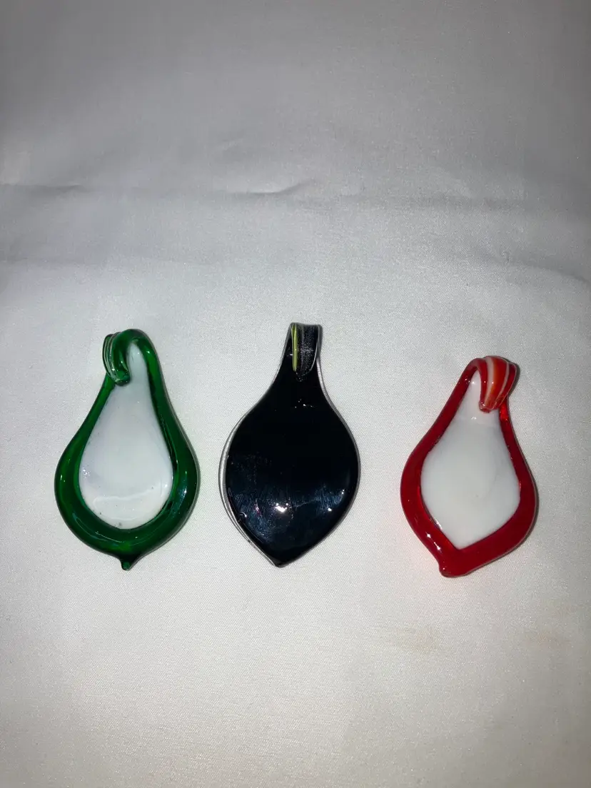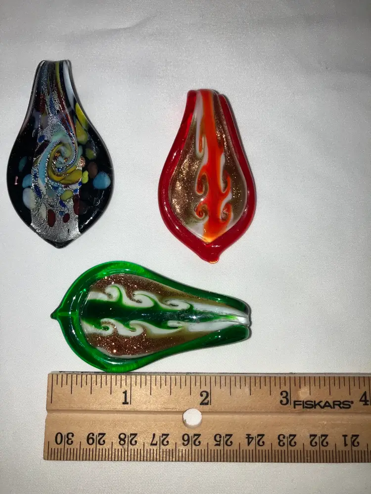 Leaf shaped; Black with multi colored swirl, red with gold, and green with gold. Approximately 2.5” each One of kind.