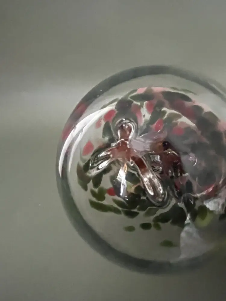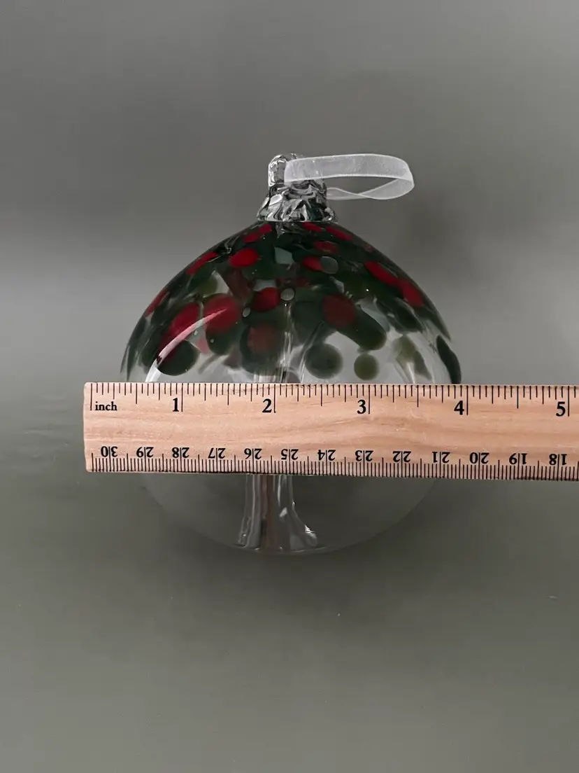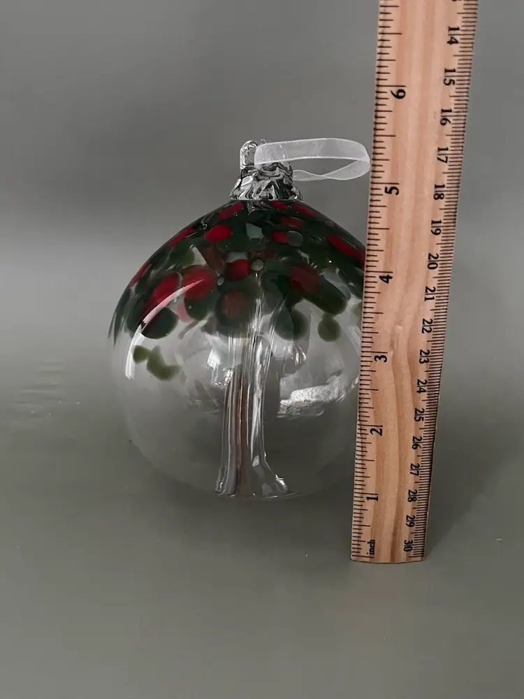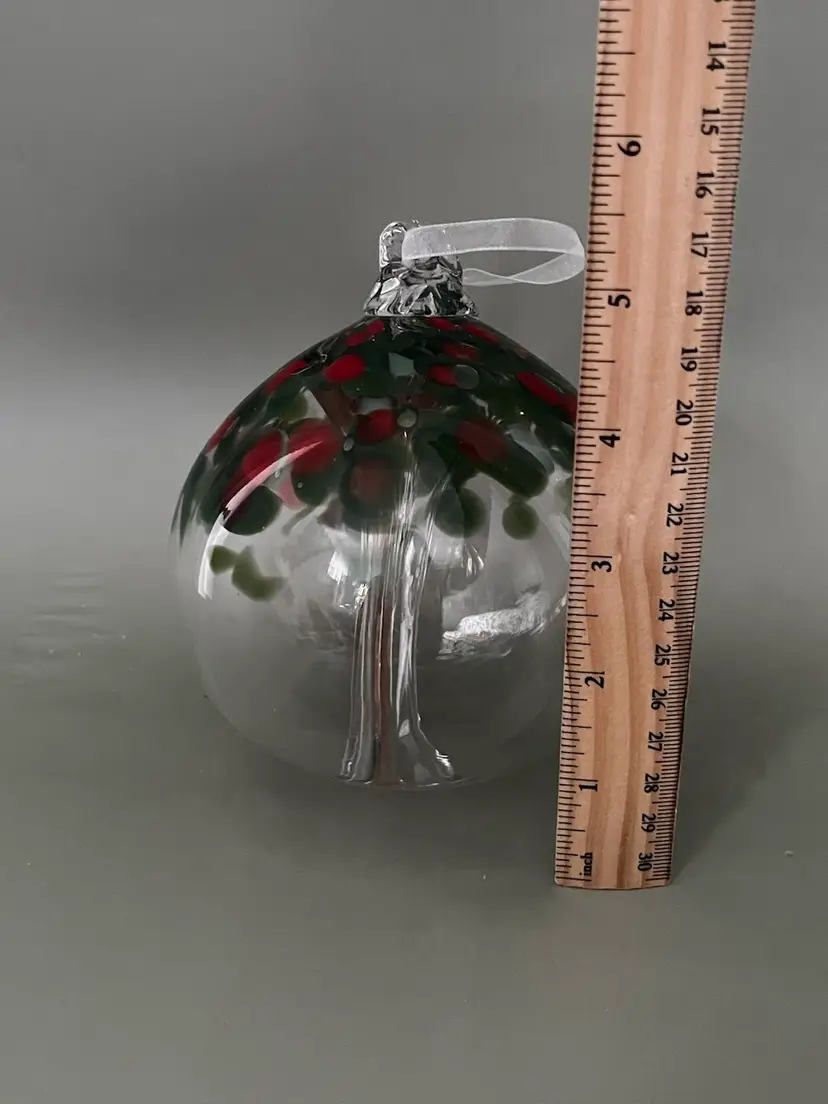 6 Inch Christmas Tree of Life hand blown glass Witch Ball, crafted by Pairpoint, America's Oldest Glass Company. It features a clear glass ball with a spun glass tree inside and colorful speckles or "leaves" on the exterior. Both beautiful and unique.