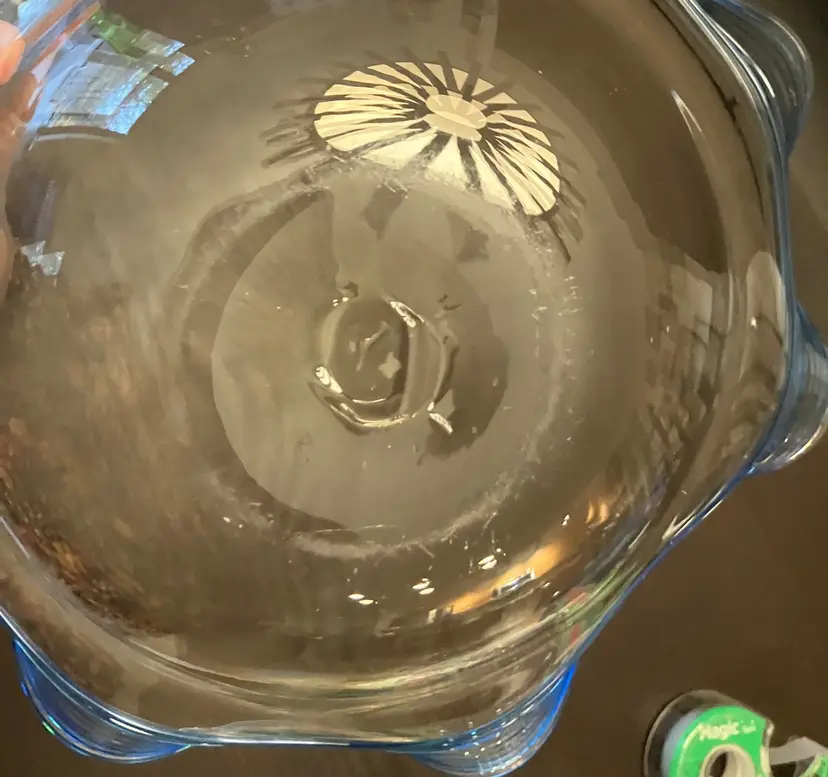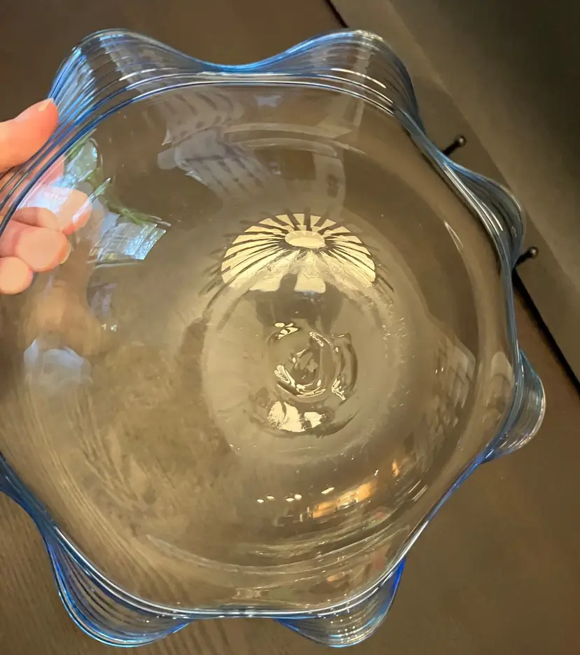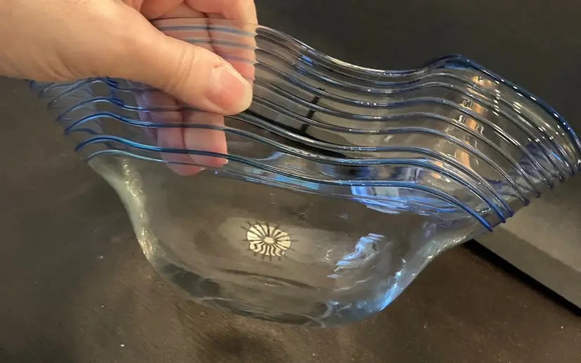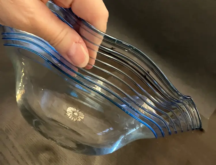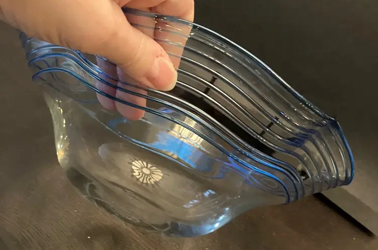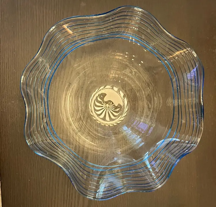Not marked. Pontil on the bottom. In great condition without chips or cracks. Great to use as a centerpiece, serving bowl, or in your entryway. Measurements: 11 1/2" wide and 4" tall. Weighs 2 1/2 lbs before packaging