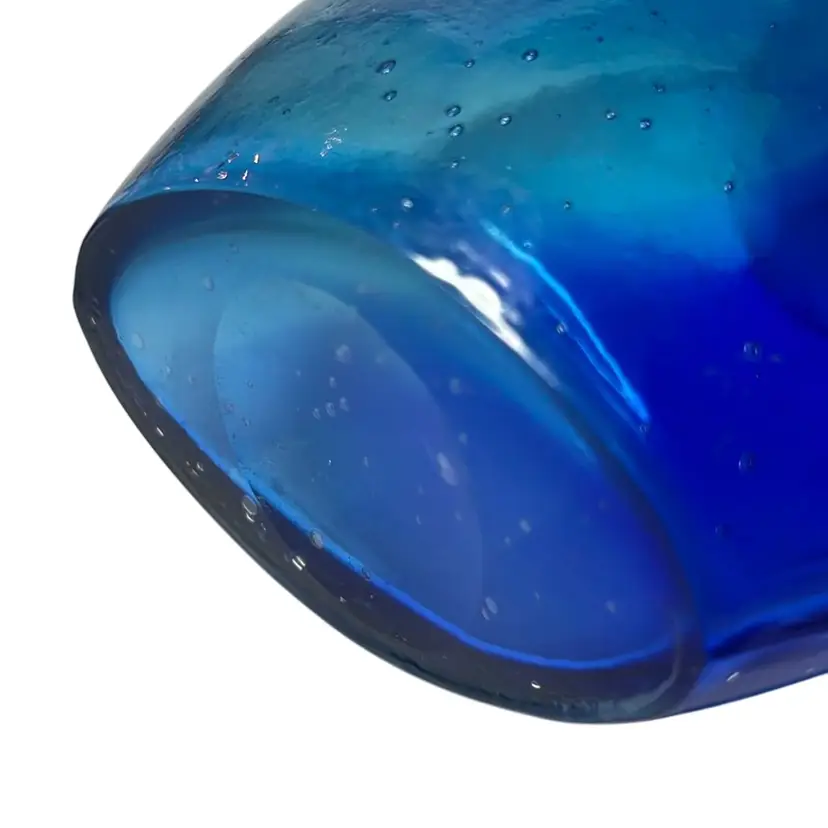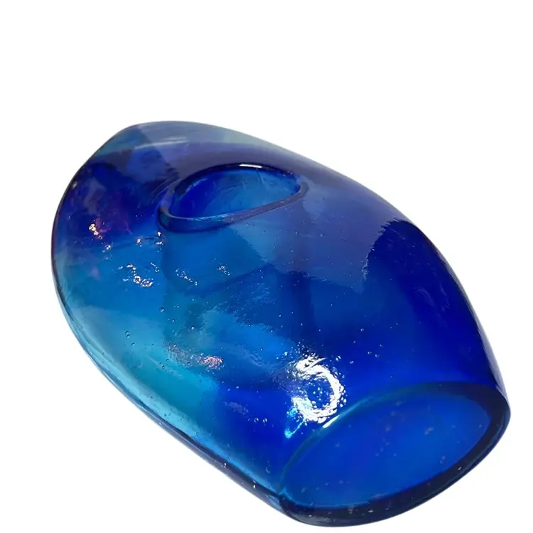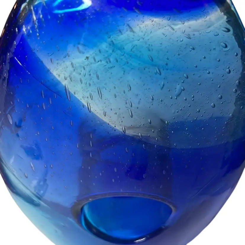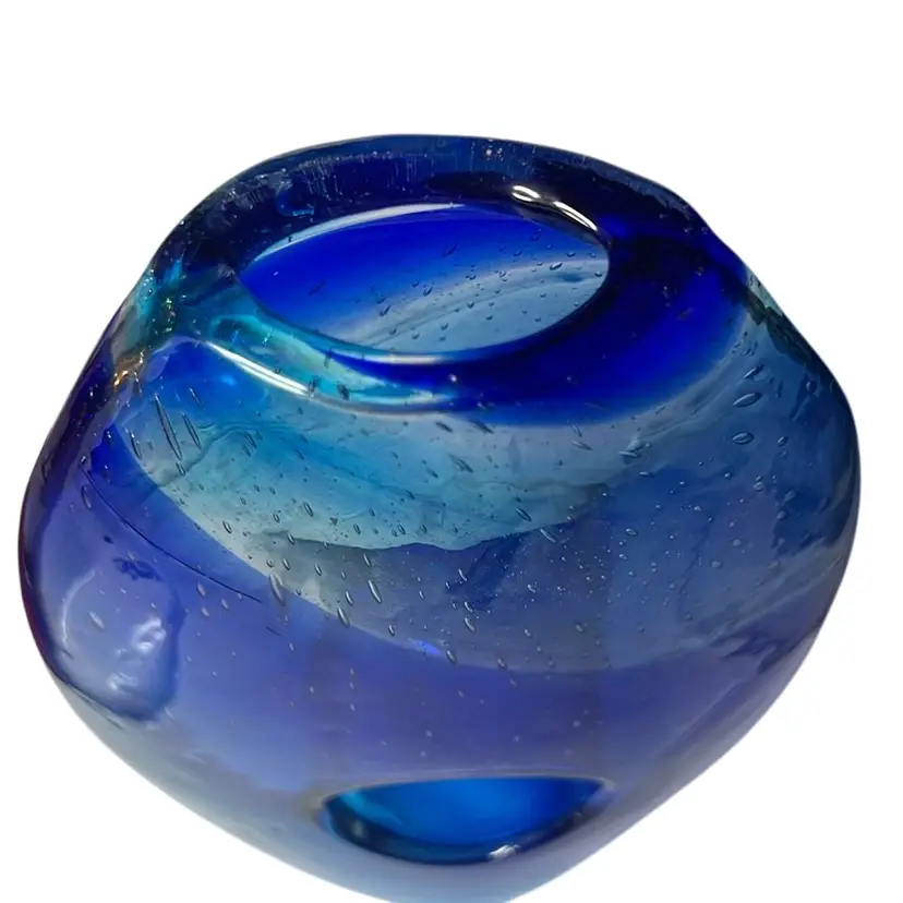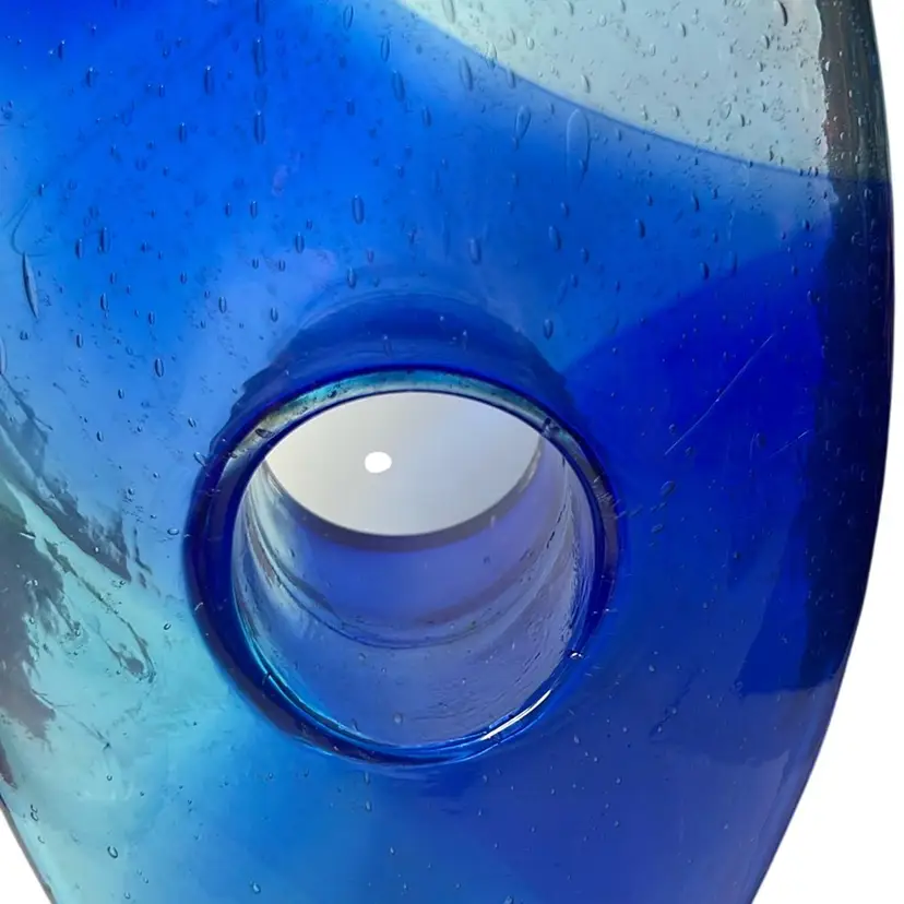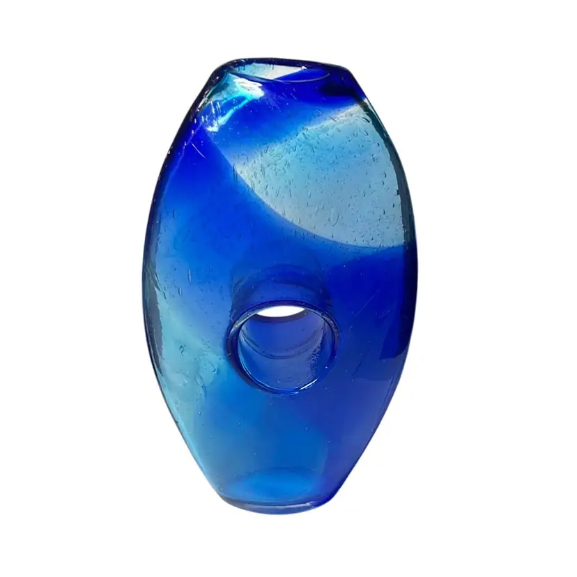 Margie’s garden works under the company Joelson Industries. Beautiful blown glass with 2” donut hole in center of vase. Has no damage and really reminds me of the swirls of the ocean. Measures 10.25” tall & 6” wide. Has a smooth pontil.