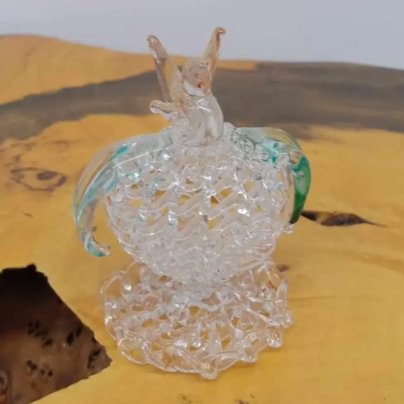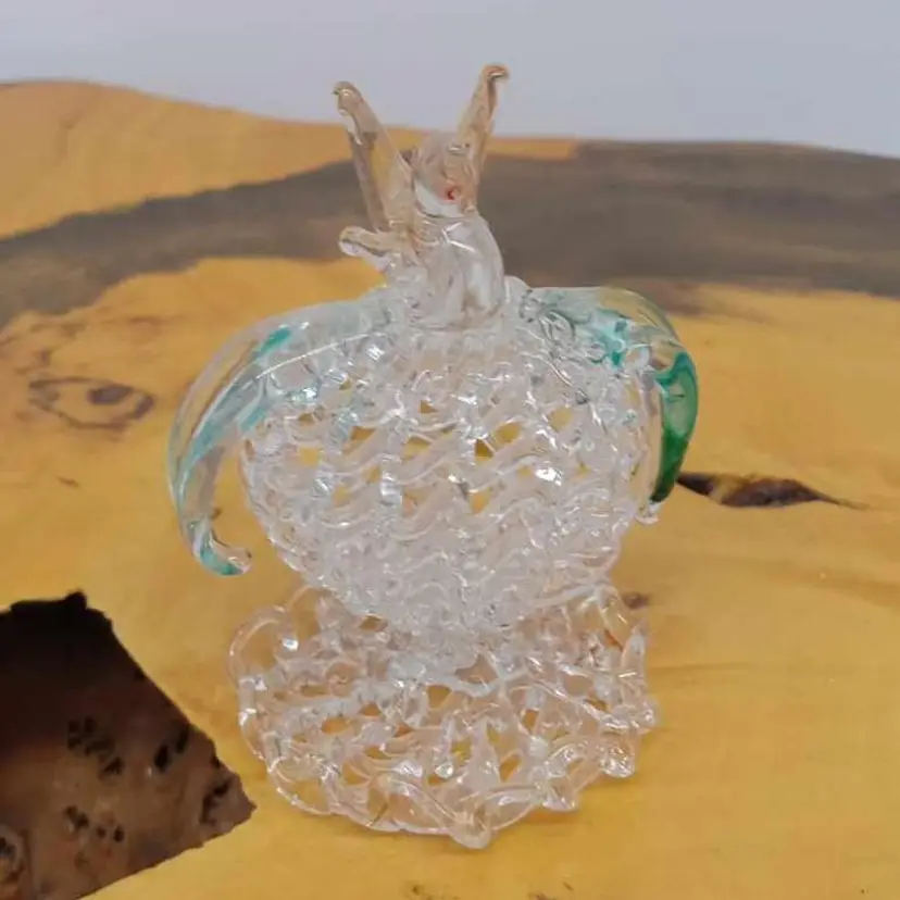 Here's a cute spun glass bird sitting on a piece of fruit or possibly a flower. It's 2 3/8 inches tall and has green leaves. No chips or cracks i can see or feel.
