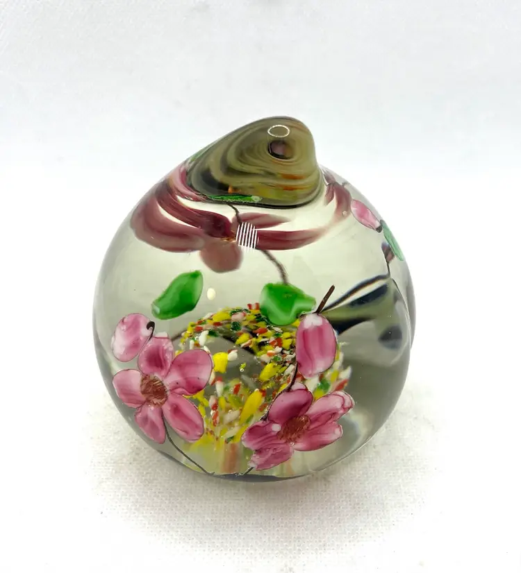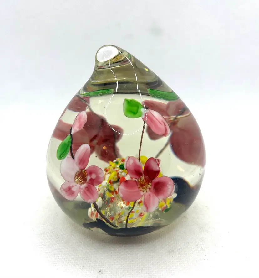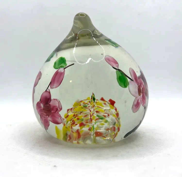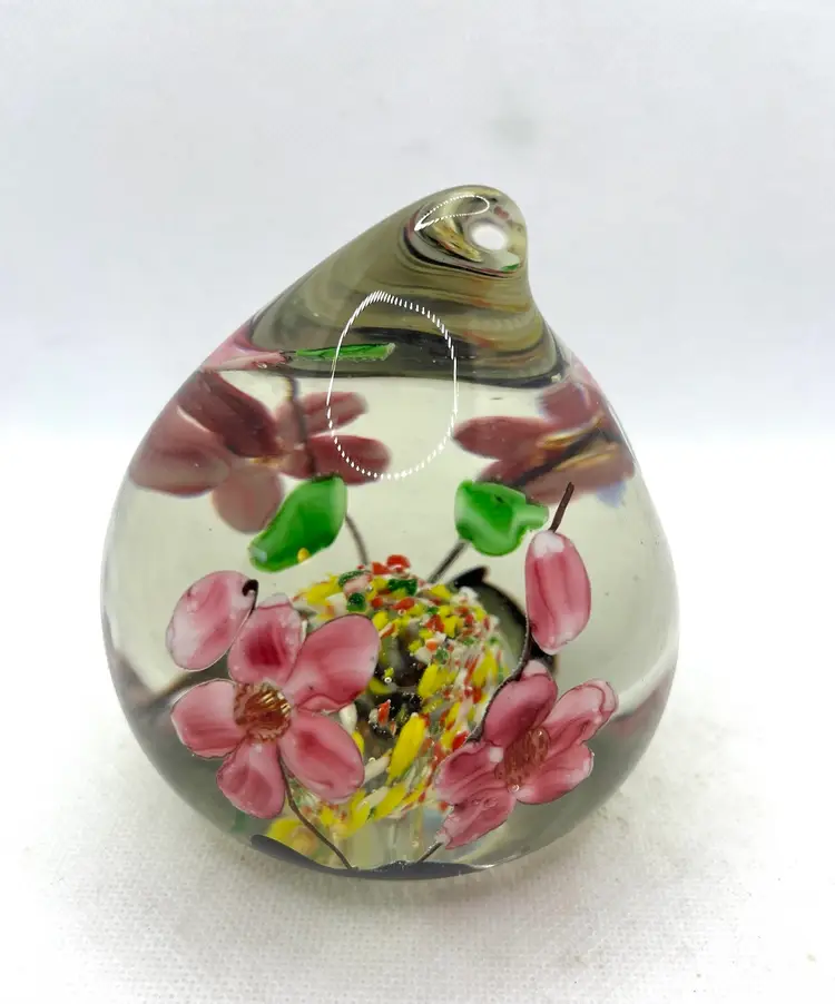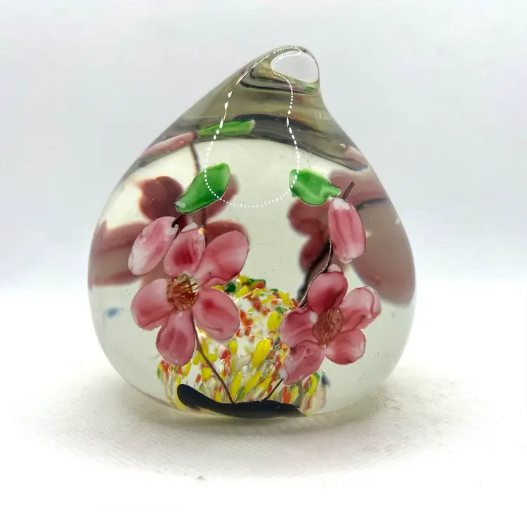 Hand Crafted Art Glass Paperweight Pink Cherry Blossoms In Teardrop Peach Shape. Approximately 3.5” x 3.5” with minor scratches or surface wear. No chips or bruises.