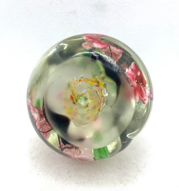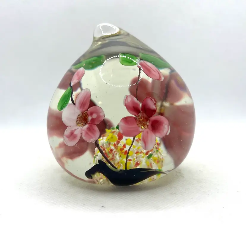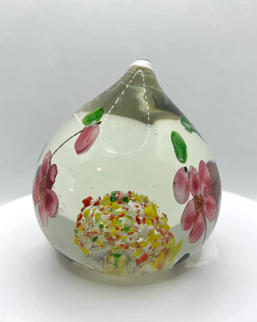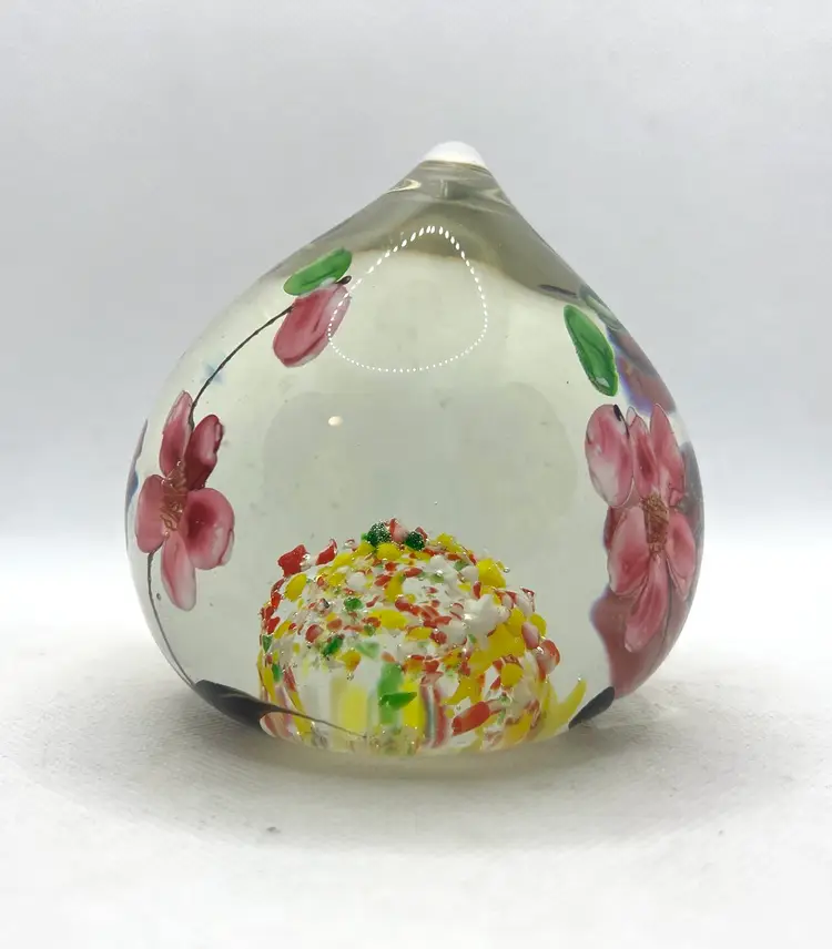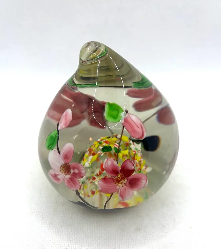 Hand Crafted Art Glass Paperweight Pink Cherry Blossoms In Teardrop Peach Shape. Approximately 3.5” x 3.5” with minor scratches or surface wear. No chips or bruises.