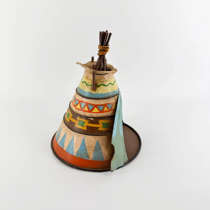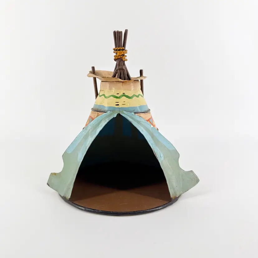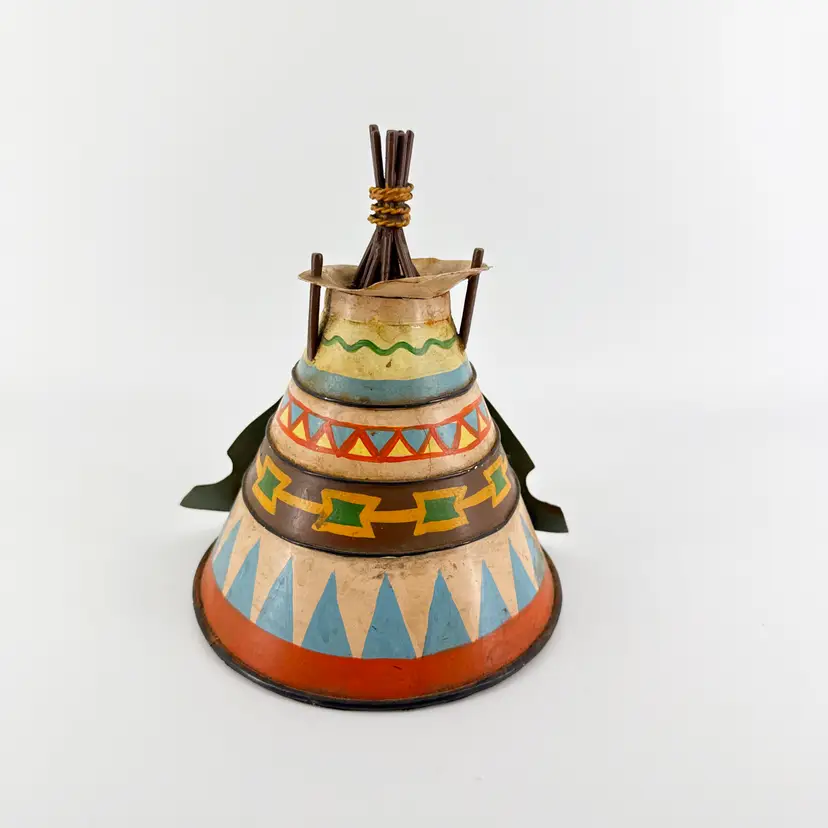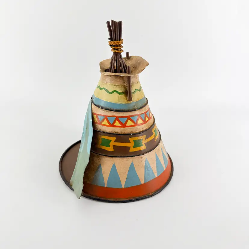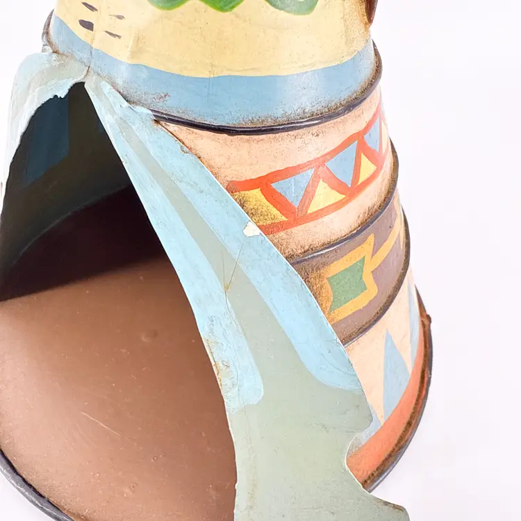 It is 7" tall and measures 6" in diameter at its widest. It is in good condition. There are no cracks, breaks or repairs. Slight paint loss from age and use. (See photos).