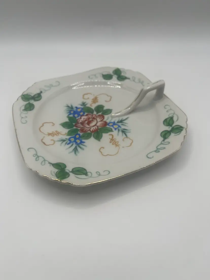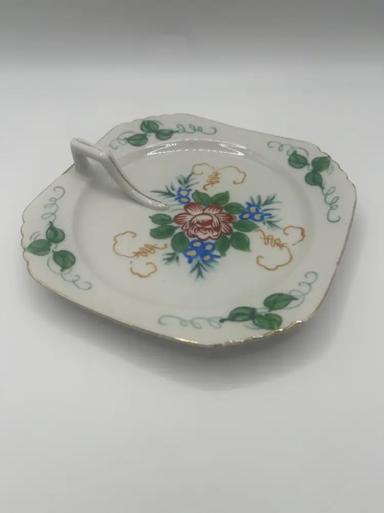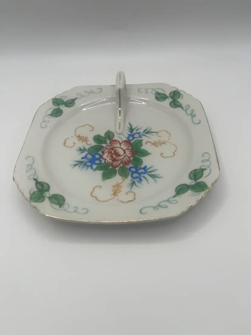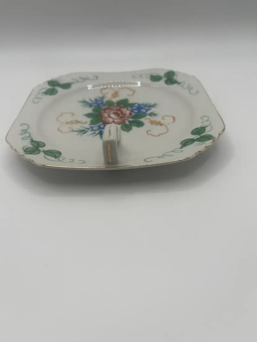 The item is a vintage "Occupied Japan" lemon server plate, also known as a nappy or lemon dish. It was used for serving lemon wedges, often at tea time. Made in Japan during the Allied occupation after World War II, between 1945 and 1952. Made of porcelain and hand-painted with floral design and gold trim. Features a handle for easy carrying and serving. Square shape with cut corners, measuring about 5 1/4 inches across. No chips or cracks. Beautiful paint colors!!