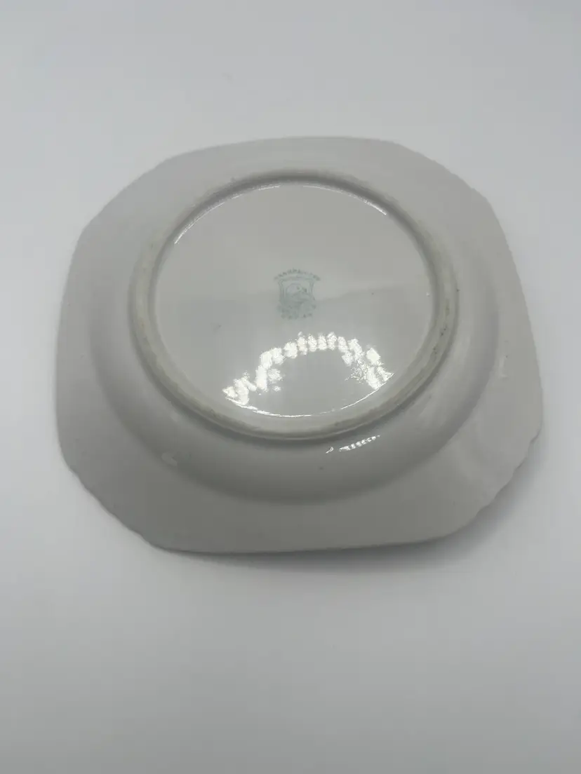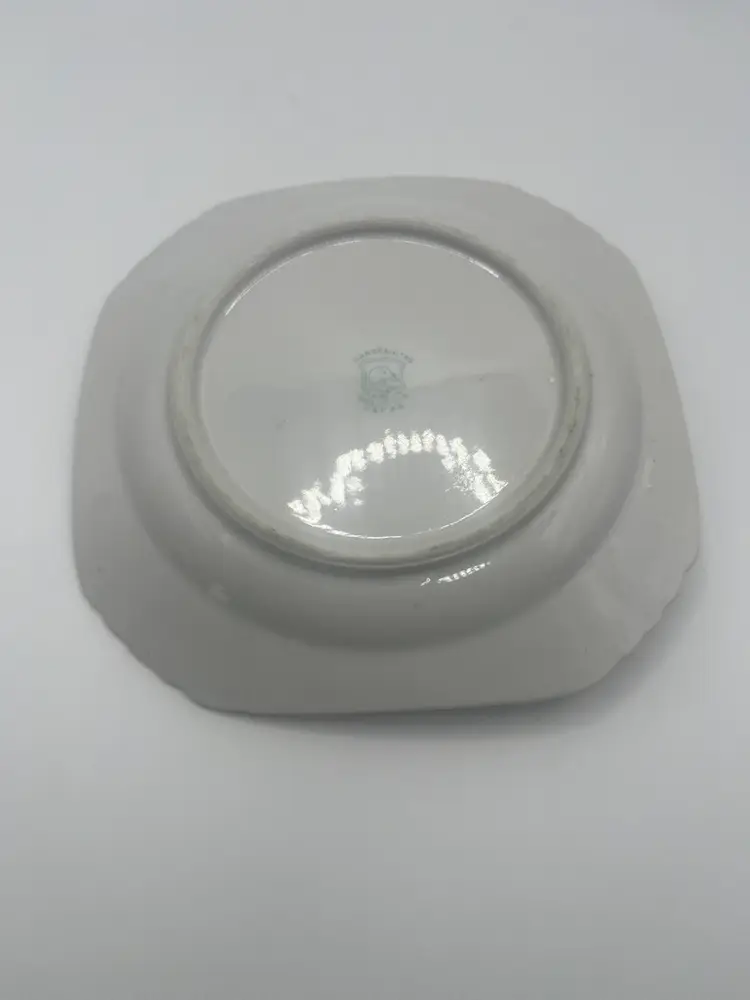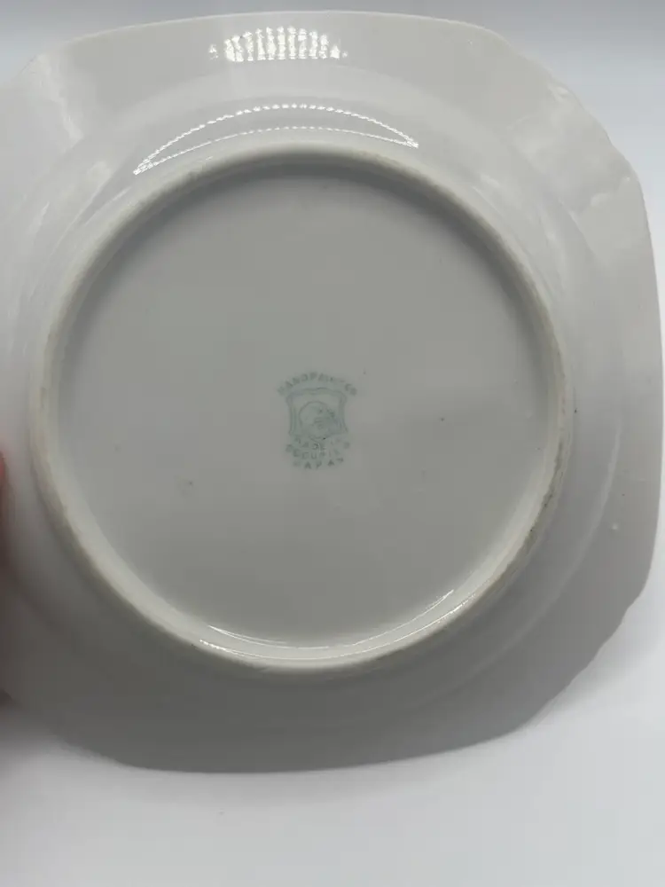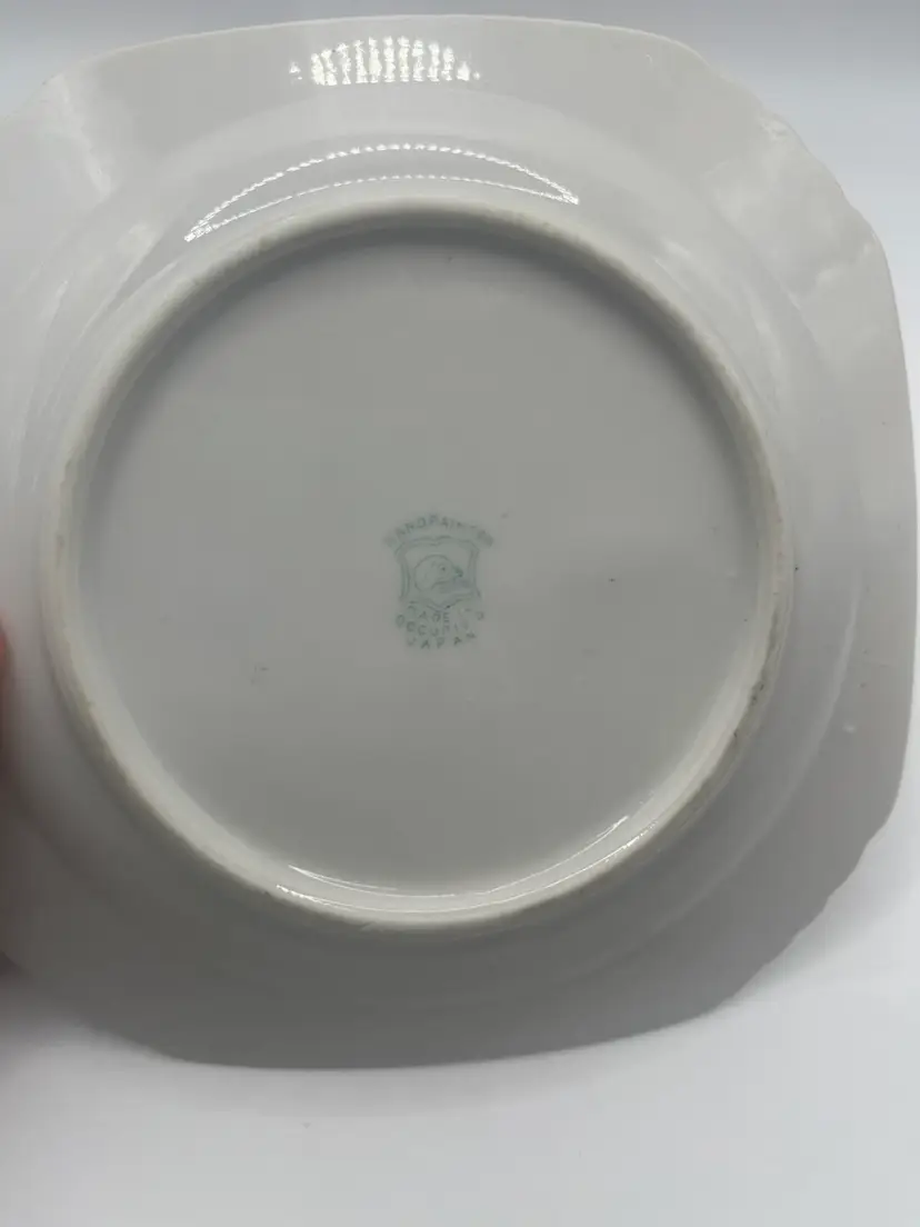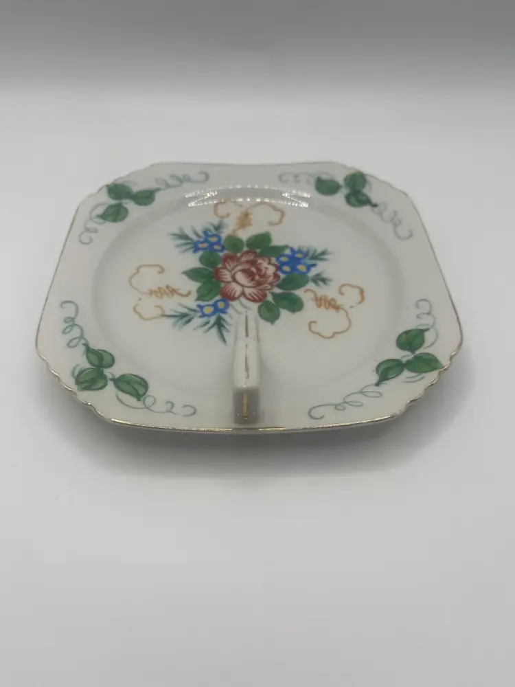 The item is a vintage "Occupied Japan" lemon server plate, also known as a nappy or lemon dish. It was used for serving lemon wedges, often at tea time. Made in Japan during the Allied occupation after World War II, between 1945 and 1952. Made of porcelain and hand-painted with floral design and gold trim. Features a handle for easy carrying and serving. Square shape with cut corners, measuring about 5 1/4 inches across. No chips or cracks. Beautiful paint colors!!