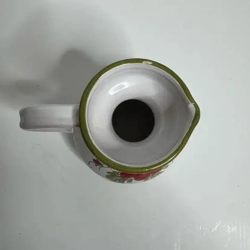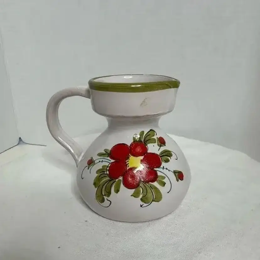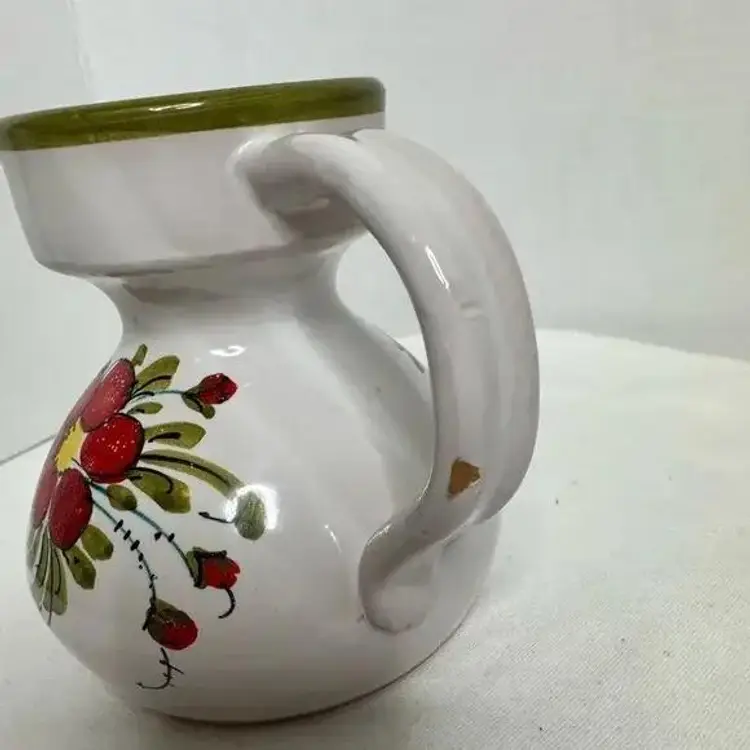 Hand painted Italian Small Ceramic Floral Art Pottery Jug/Creamer. Small chip on handle. Signed Italy in bottom and numbered. Beautiful little jug can be used as vase or candleholder as well. Pre-owned. Approximately 4.5” tall, 5” wide to edge of handle and 4” deep. Weighs 13 ounces.