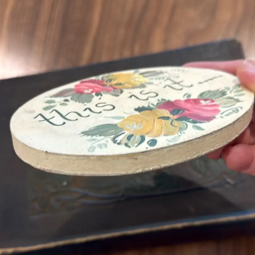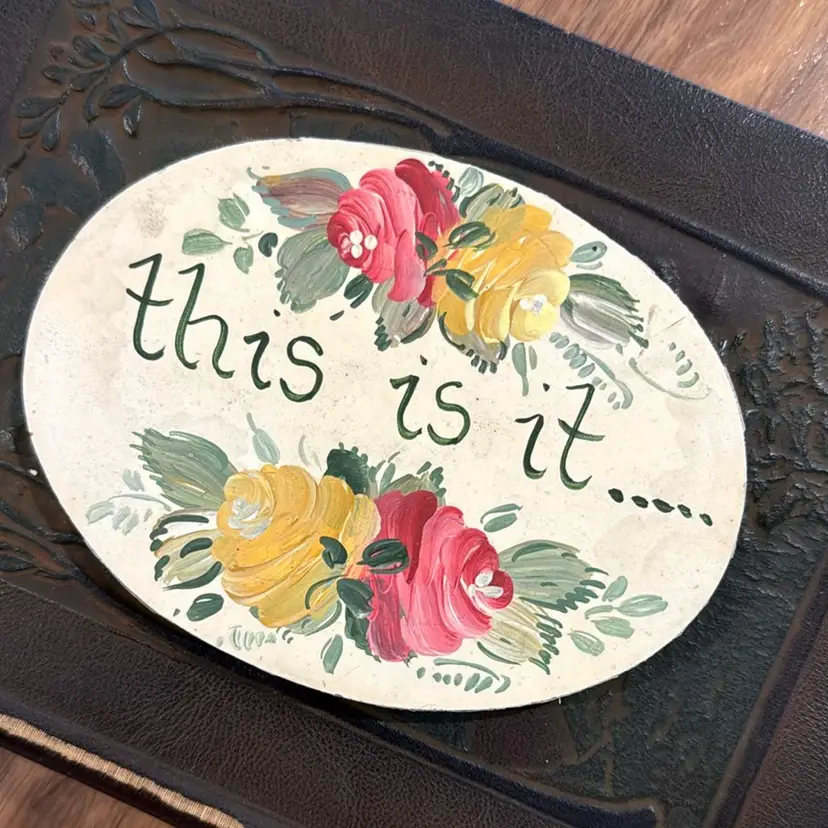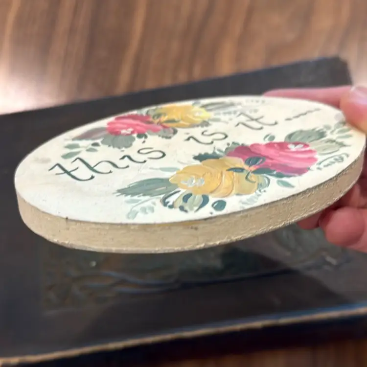 Cottage core wood plaque with the most doomsday message lol. No hanger on the back but light enough to use foam tape or poster putty. 5” wide by 3.75” high.