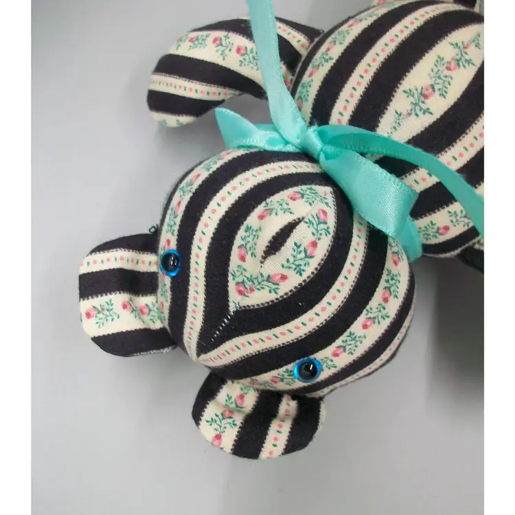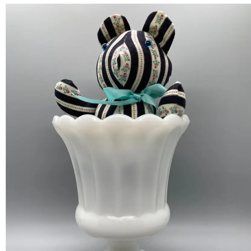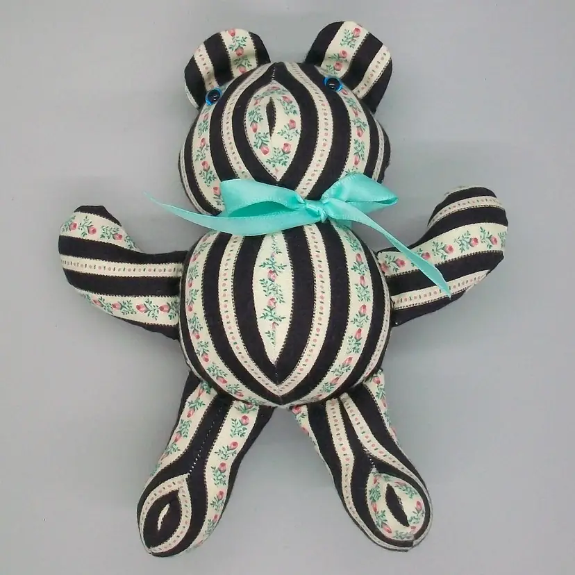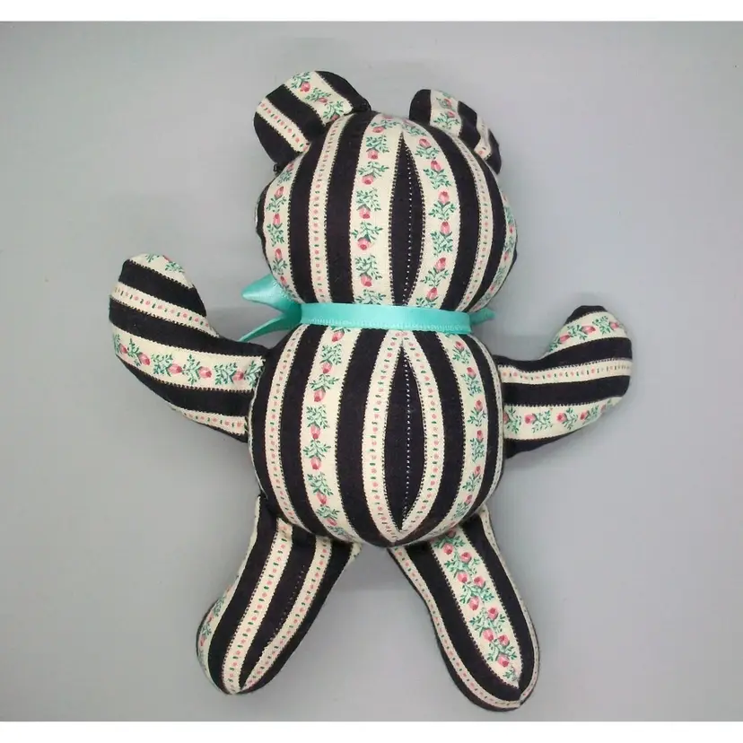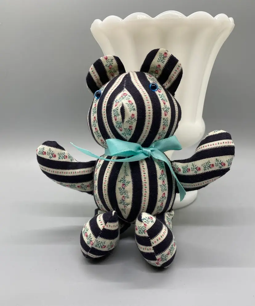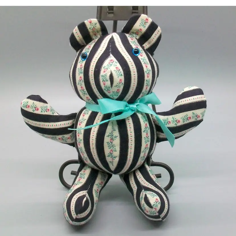 Adorable hand sewn teddy bear featuring a charming striped and floral pattern, blue plastic safety eyes and a green bow, making it a perfect gift or a delightful addition to your collection. Soft and cuddly, it's sure to bring a smile to anyone's face. Measures 7"