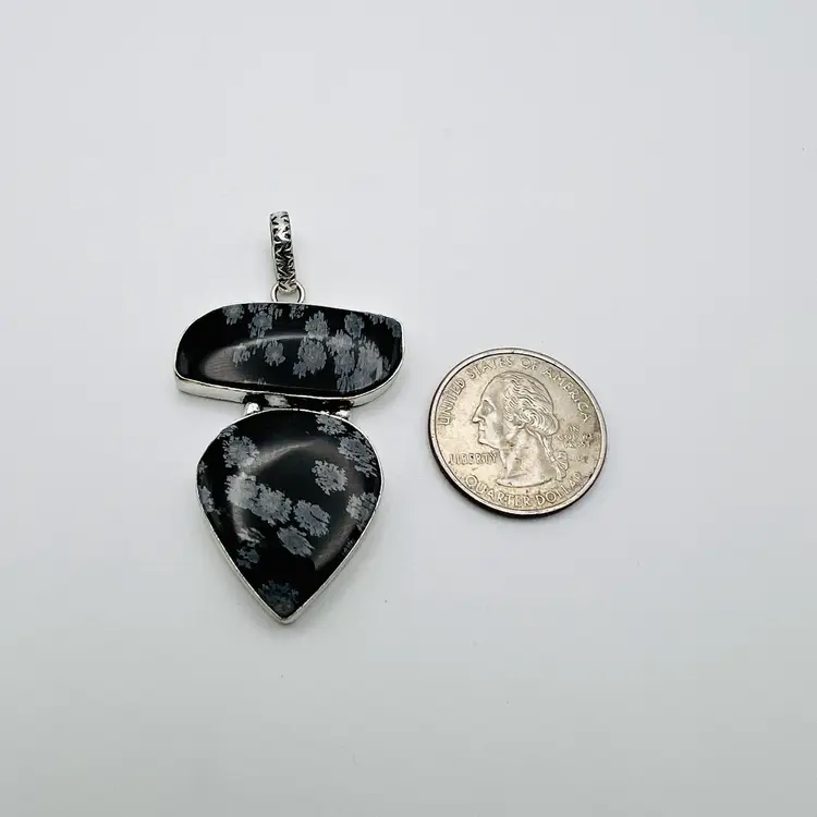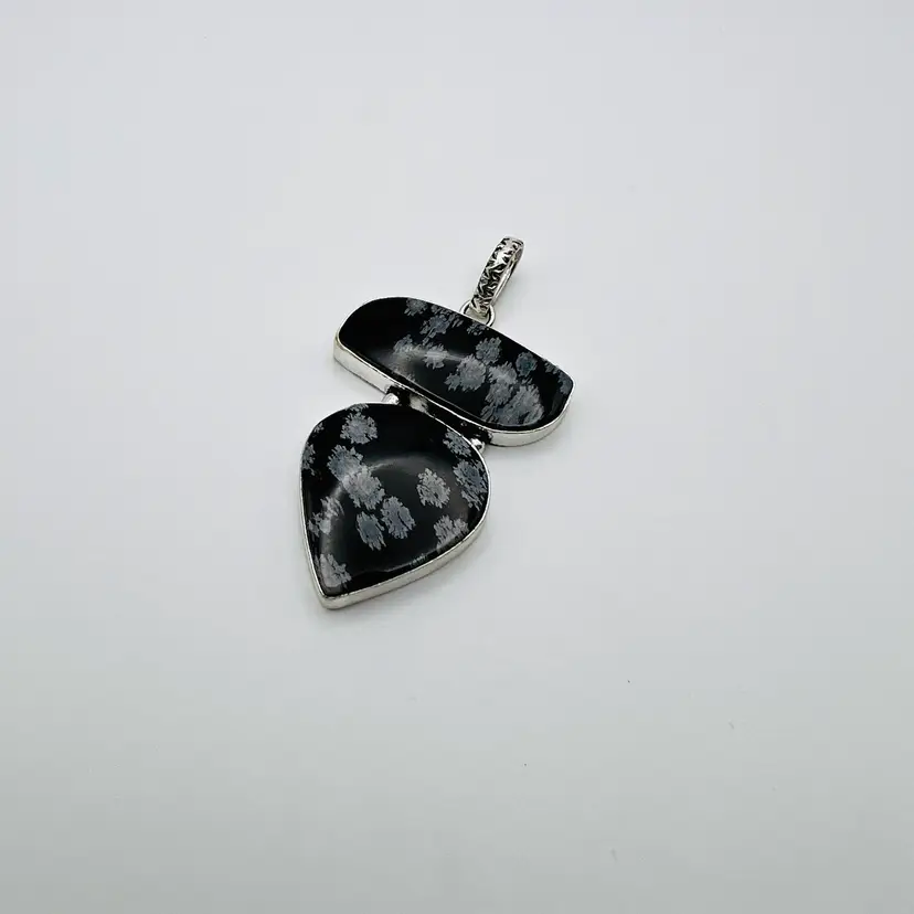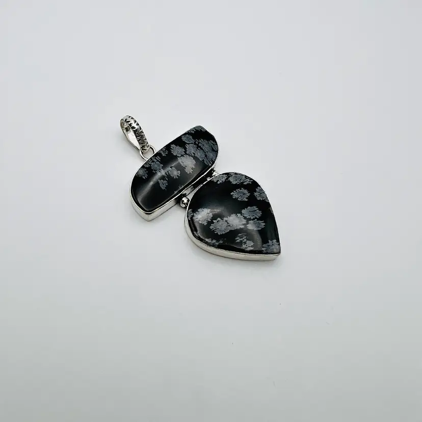 Radiate effortless elegance with this hand-crafted 2-stone Snowflake Obsidian pendant, set in a sterling silver–plated copper base for lasting beauty. Each gemstone features striking gray-and-white snowflake patterns against a deep black background — no two are ever the same.