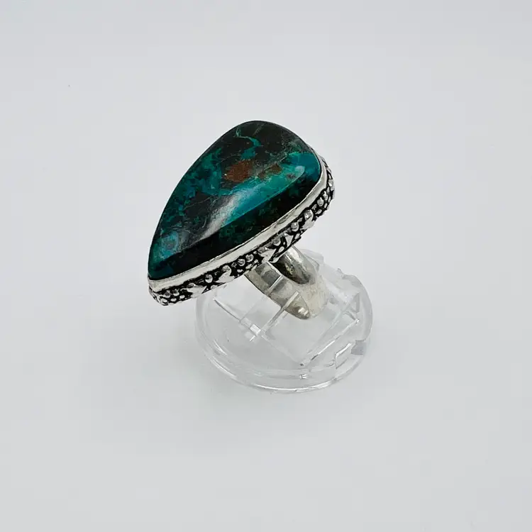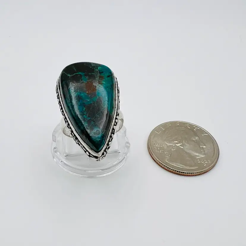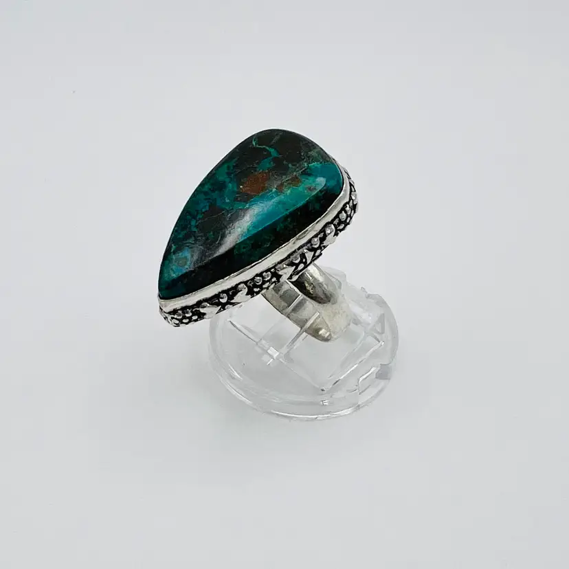 Radiate effortless elegance with this hand-crafted Azurite ring (size 7.25), set in a sterling silver–plated copper base for lasting beauty. Each gemstone reveals deep blue hues intertwined with natural green malachite patterns — no two are ever the same.