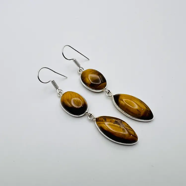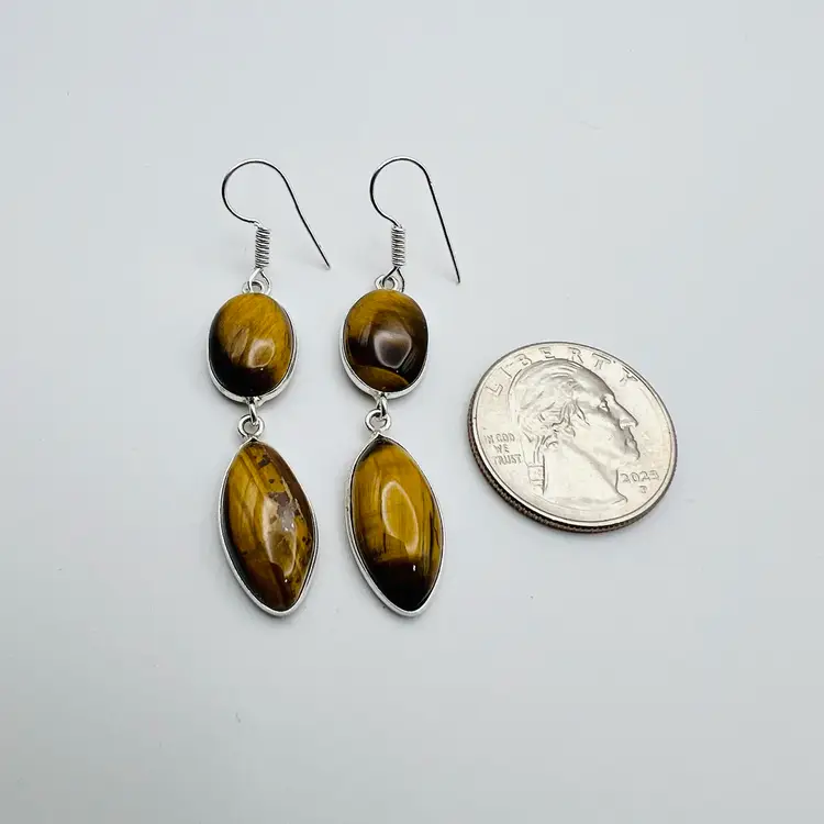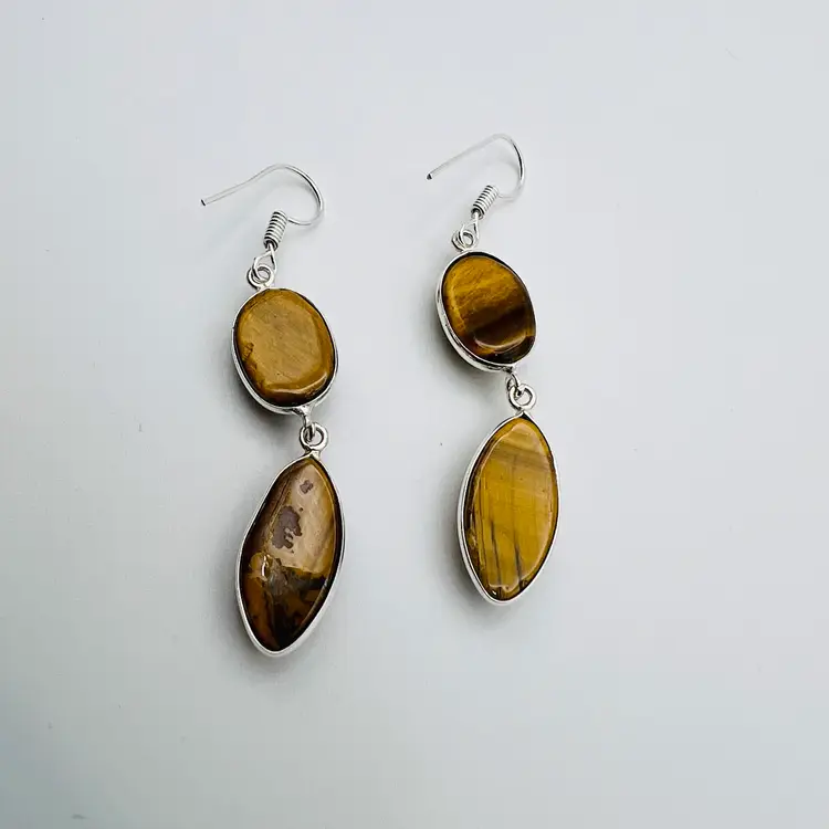 Radiate effortless elegance with these hand-crafted 2-stone Tiger Eye Jasper earrings, set in a sterling silver–plated copper base for lasting beauty. Each gemstone features warm, golden-brown bands with natural chatoyancy — no two are ever the same.
