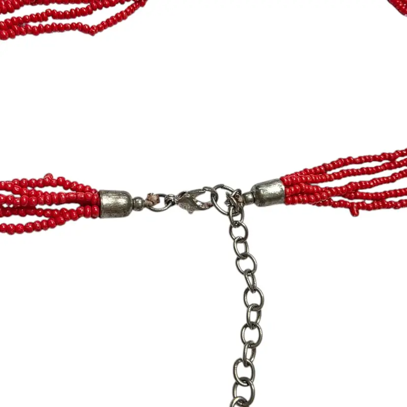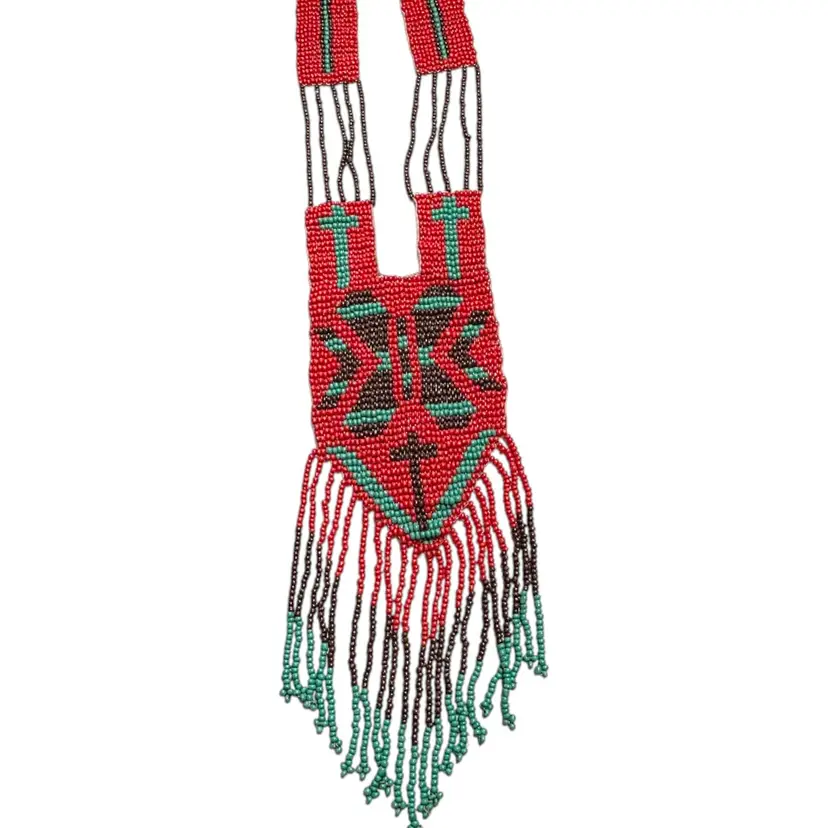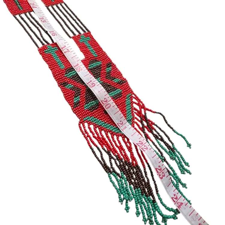 This vintage handcrafted beaded necklace features intricate red and green beadwork with a cross motif. The fringed ends and 24-inch length evoke a timeless charm, making it a delightful piece for collectors or admirers of traditional craftsmanship.