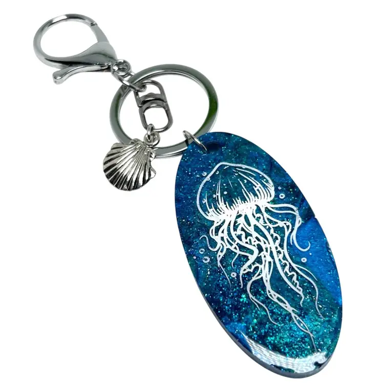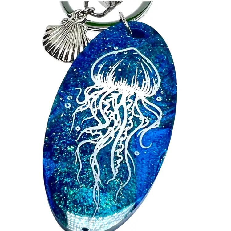Handmade by me 🫶 Etched Jellyfish 🪼 in Blue Resin Keychain Silver colored shell charm Jellyfish 2-1/2” x 1-1/4” x 3/16” Total keychain length 5-5/16”